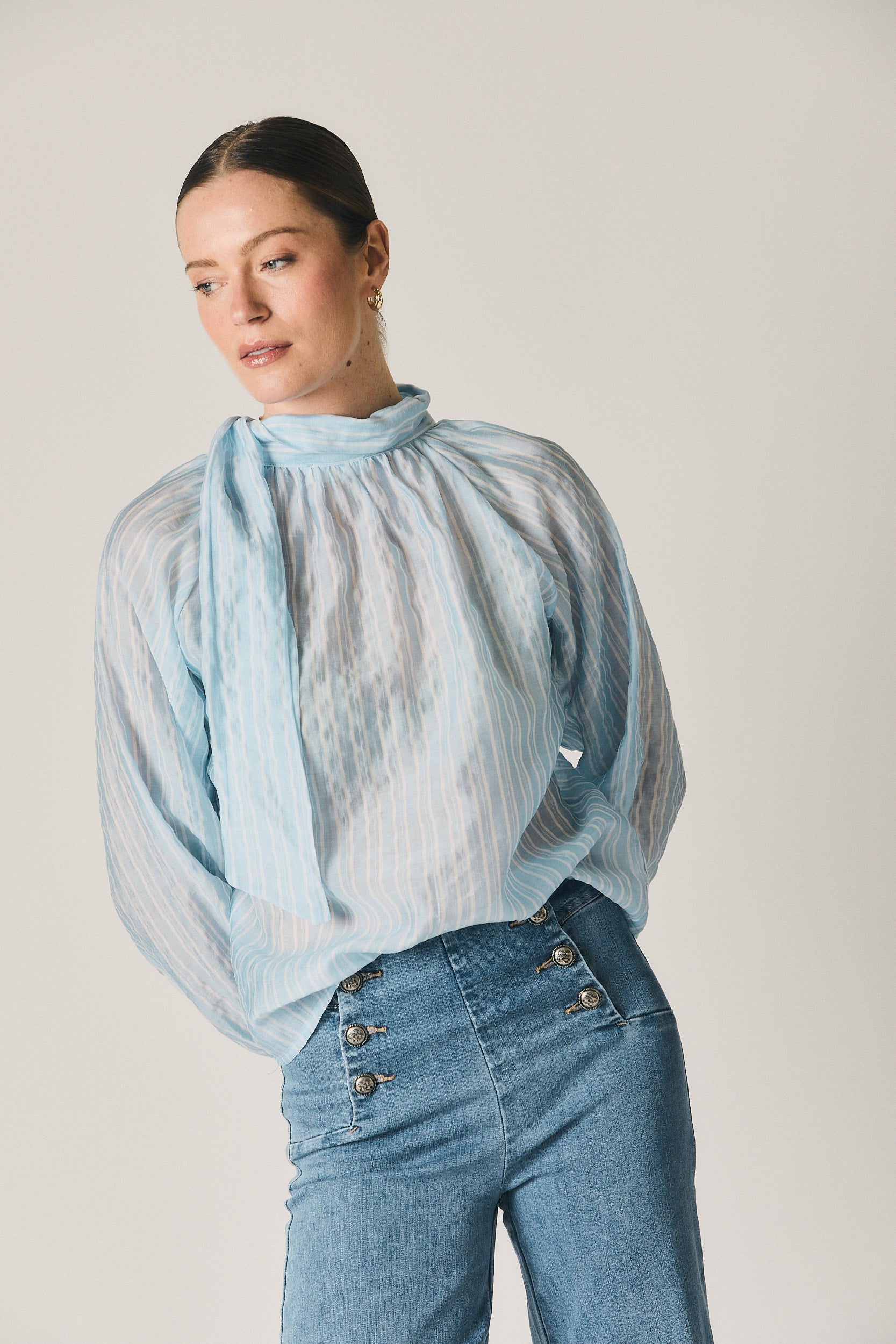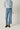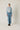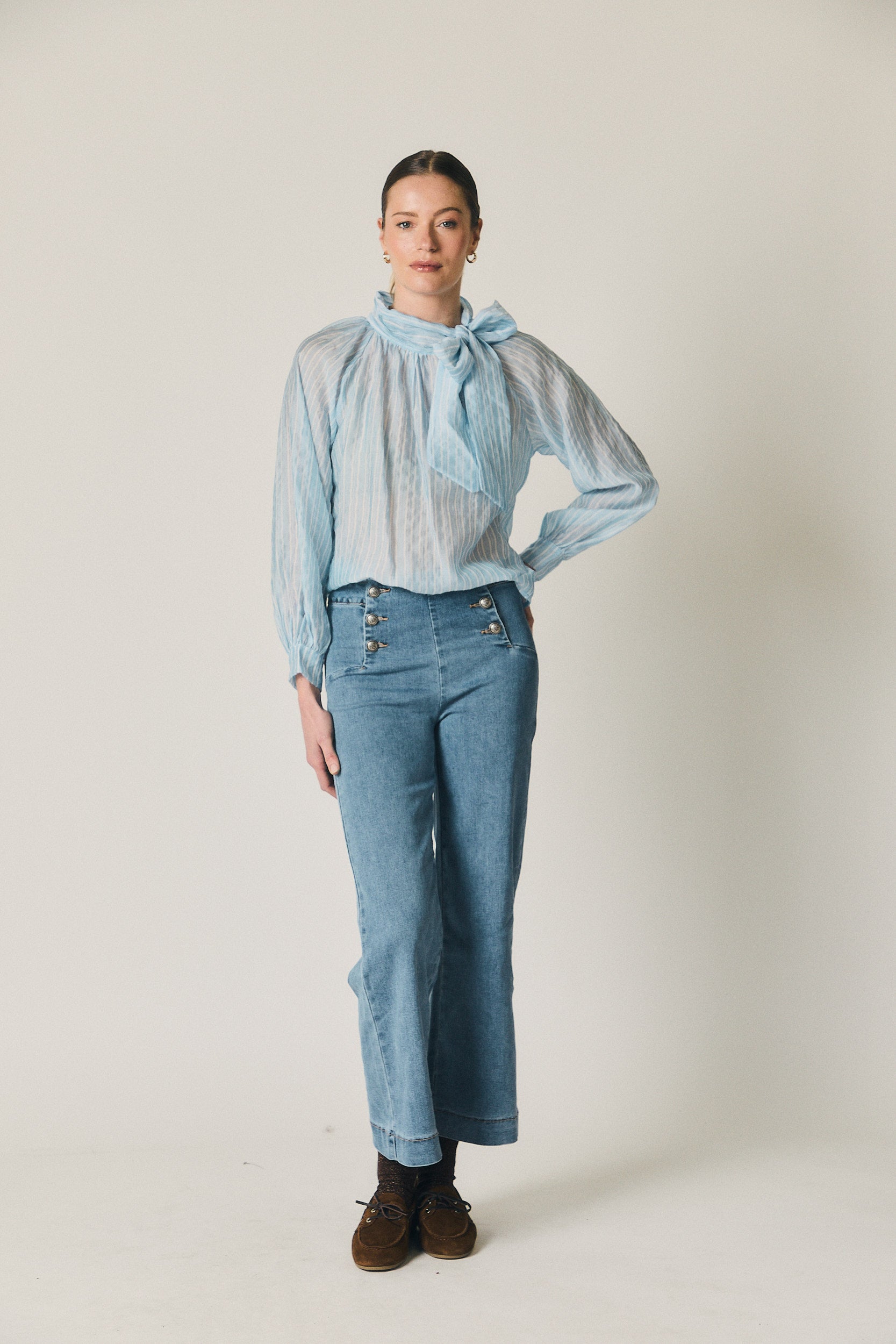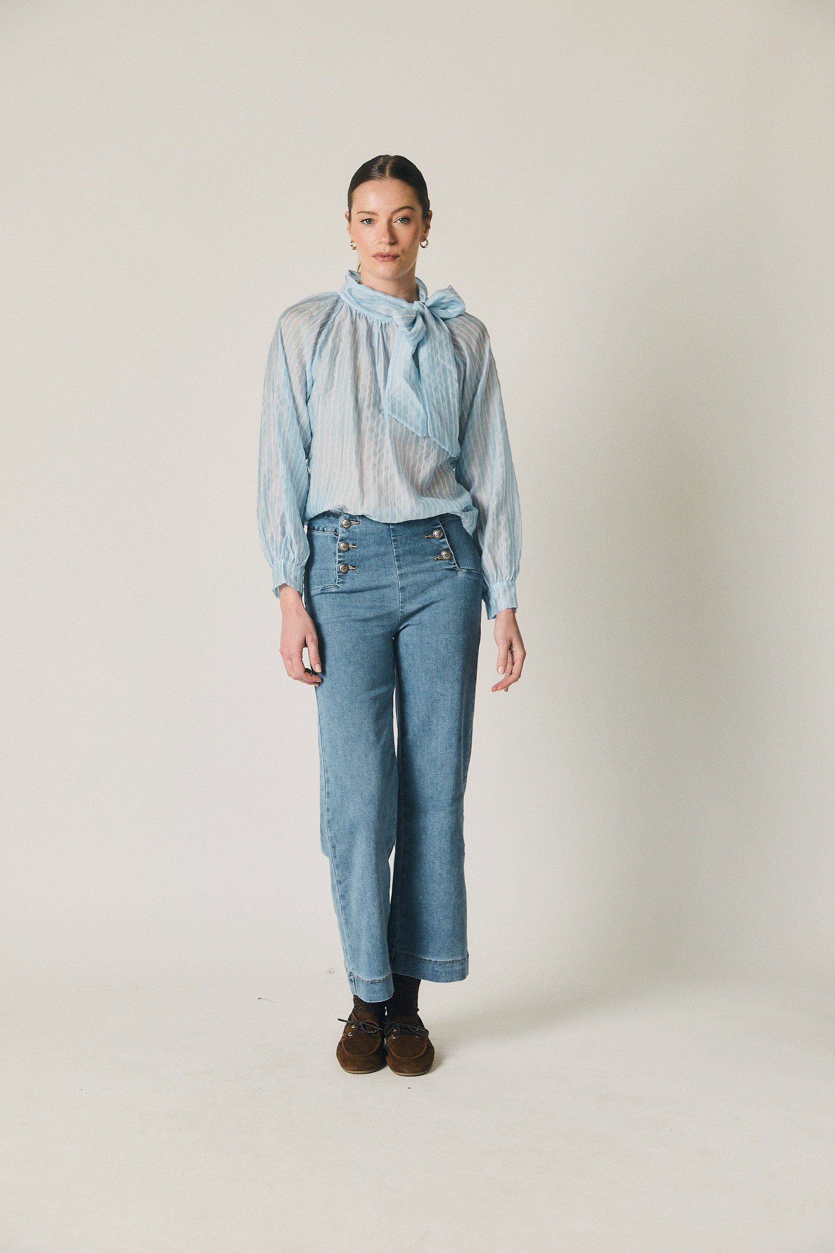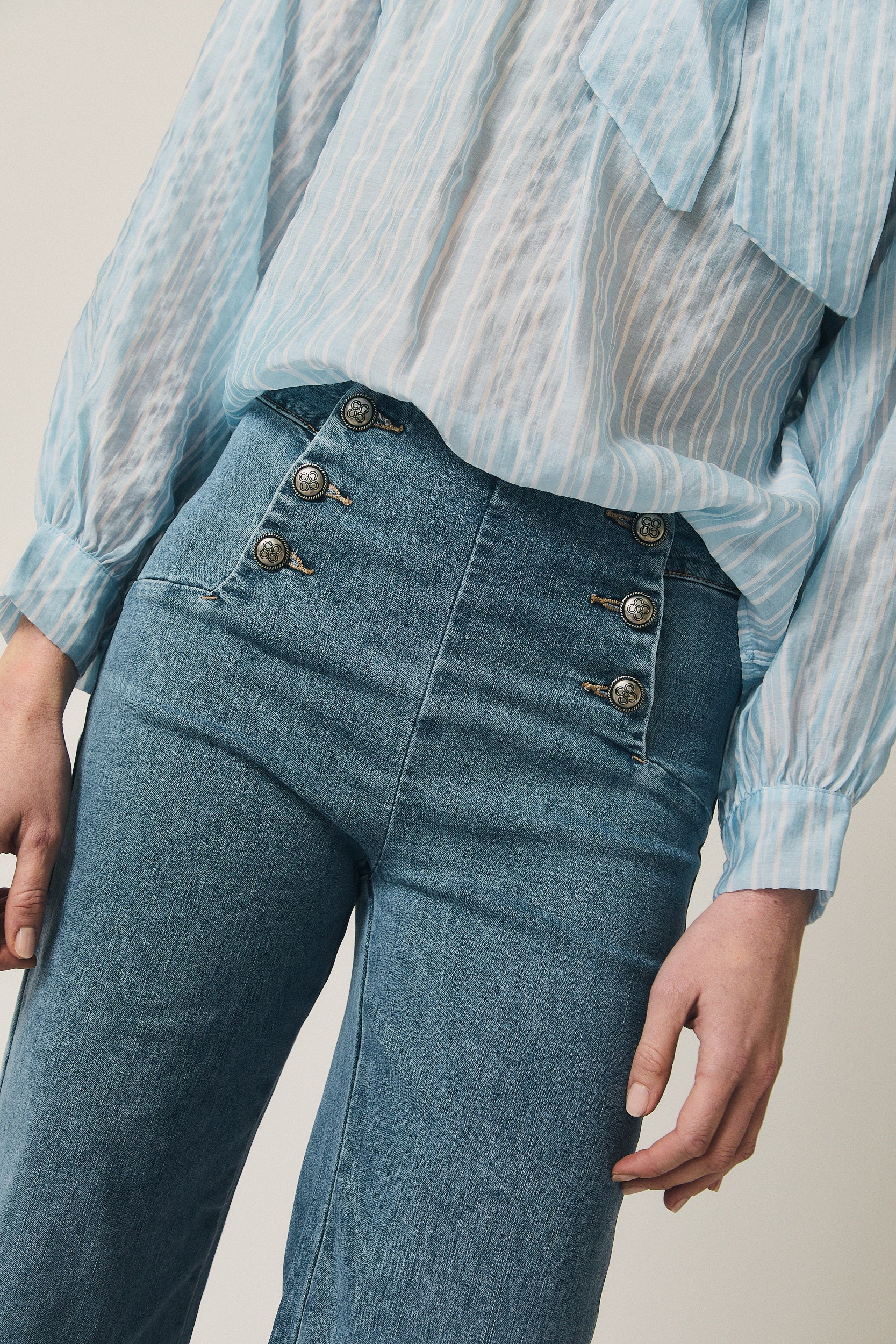 Jeans en tono azul con diseño de inspiración marinera. Tiro alto y cierre frontal con doble botonadura metálica vista, que estructura la zona de la cintura y define la silueta. Pierna recta y caída limpia desde la cadera, con un largo versátil que estiliza sin ajustar.