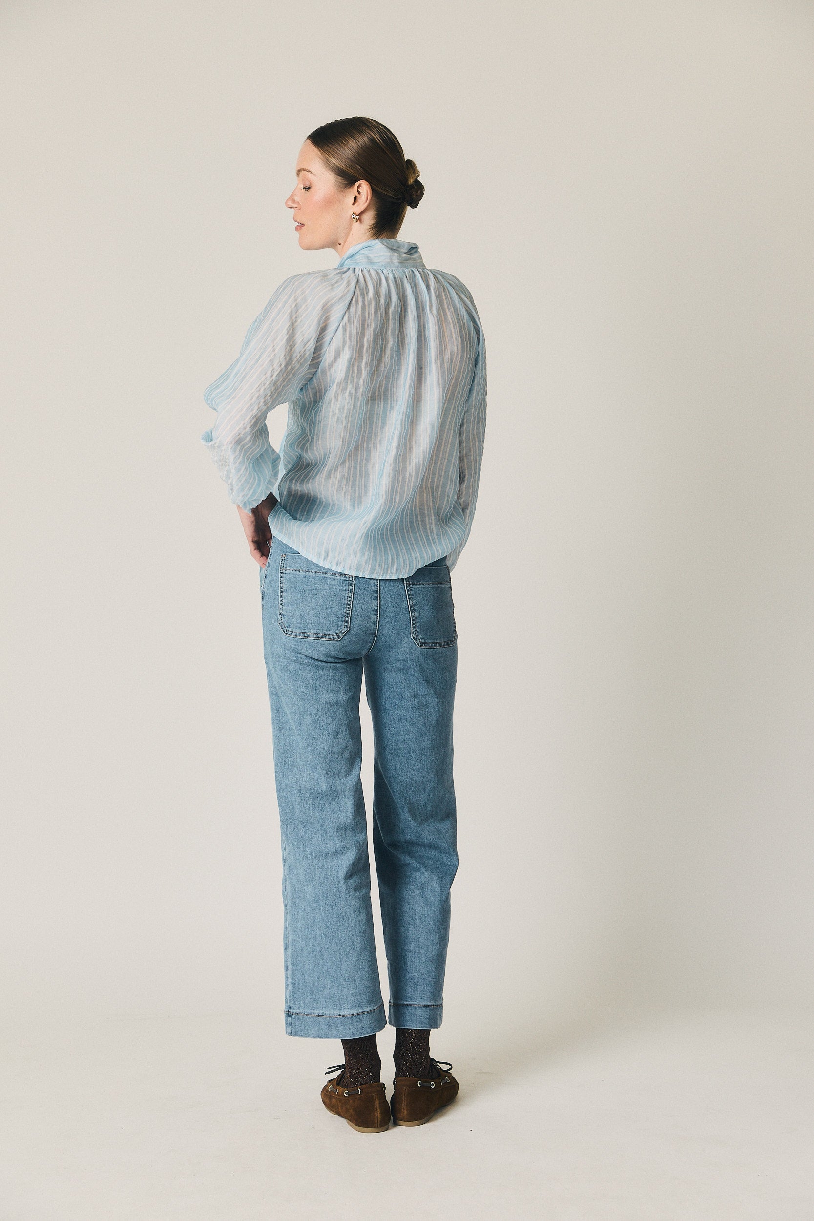 Un vaquero pensado para el día a día y fácil de combinar: queda bien con camisas ligeras, blusas con volumen o jerseys de punto fino. Funciona tanto en looks de trabajo como en planes más relajados, y es una buena base para jugar con capas y accesorios según la temporada.