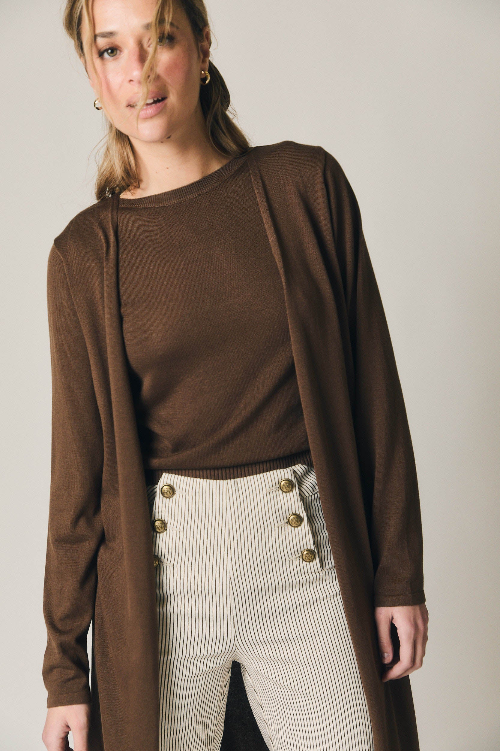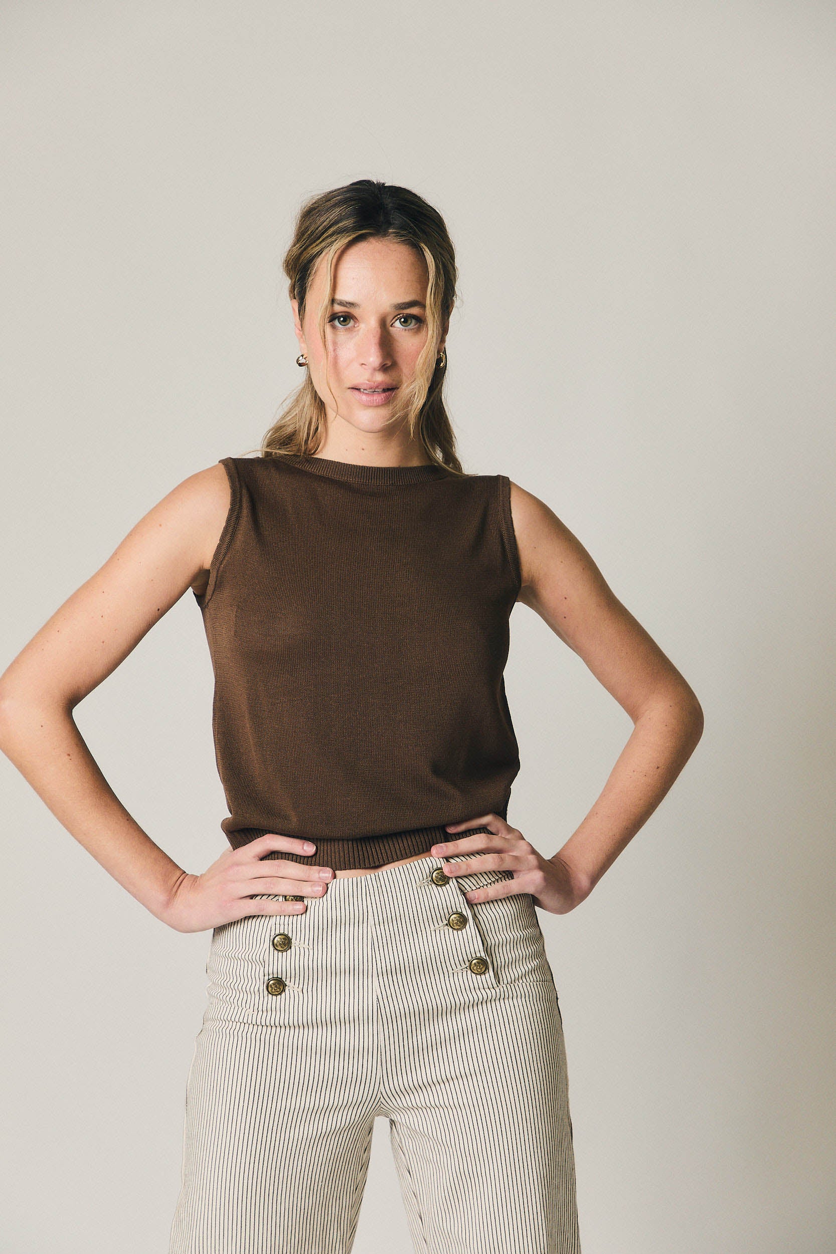 Top de punto en tono marrón, de corte recto y diseño sin mangas. Cuello redondo cerrado y acabado ligeramente acanalado en el bajo.