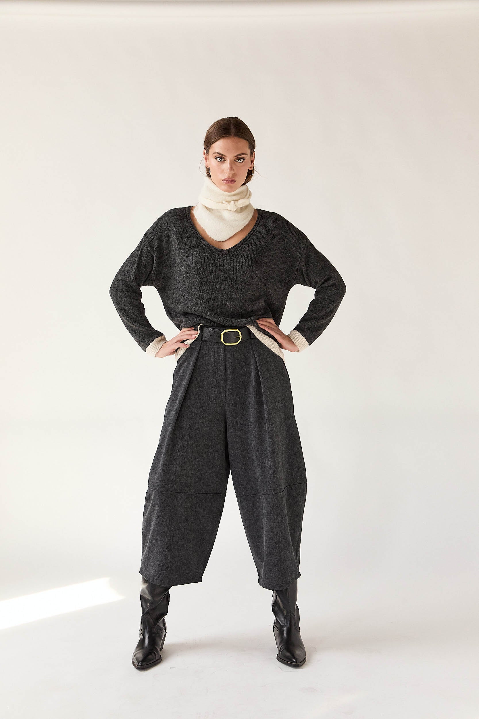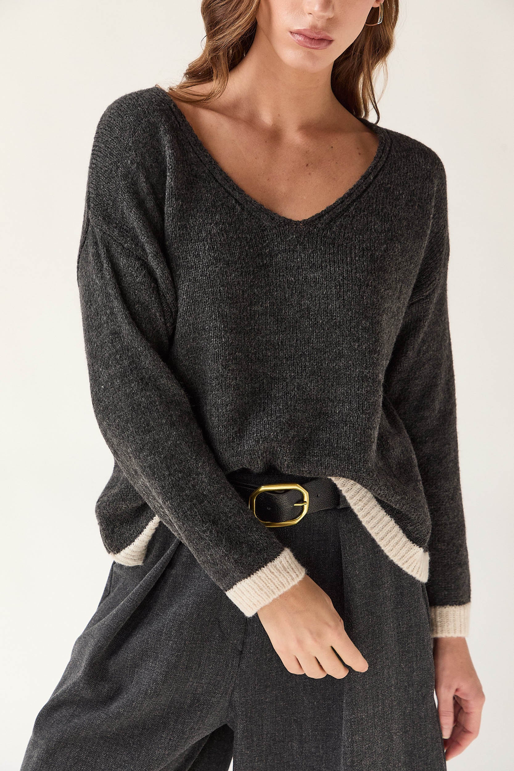 Jersey de punto suave en color gris oscuro con cuello pico y detalles en contraste beige en los puños y el bajo. Presenta corte recto, hombro caído y acabado ligeramente holgado que aporta un aire relajado.