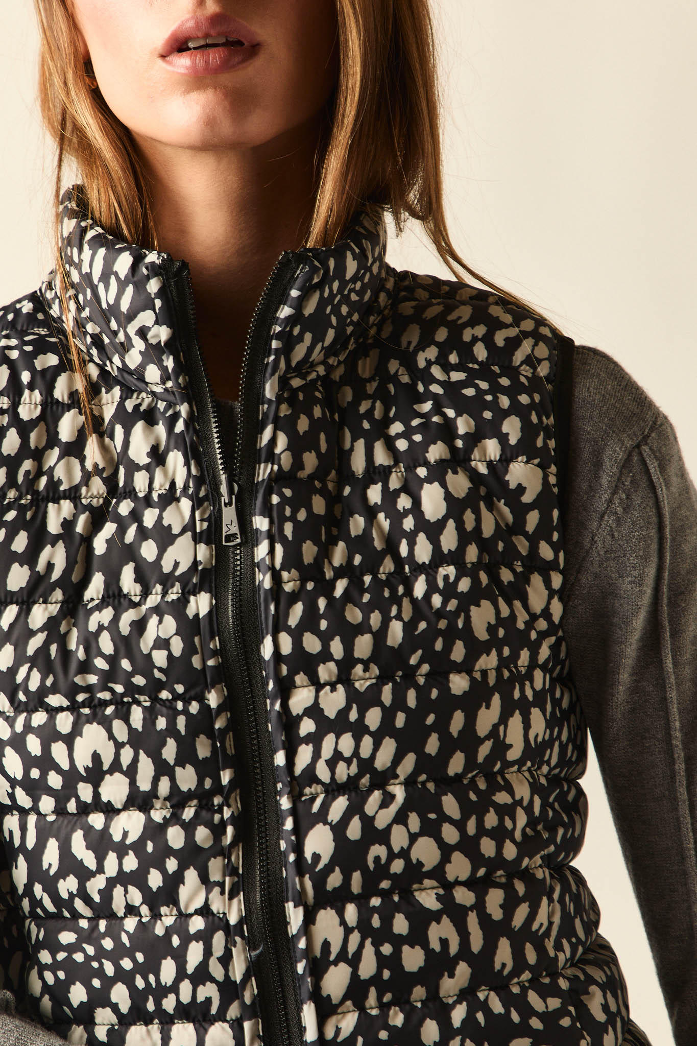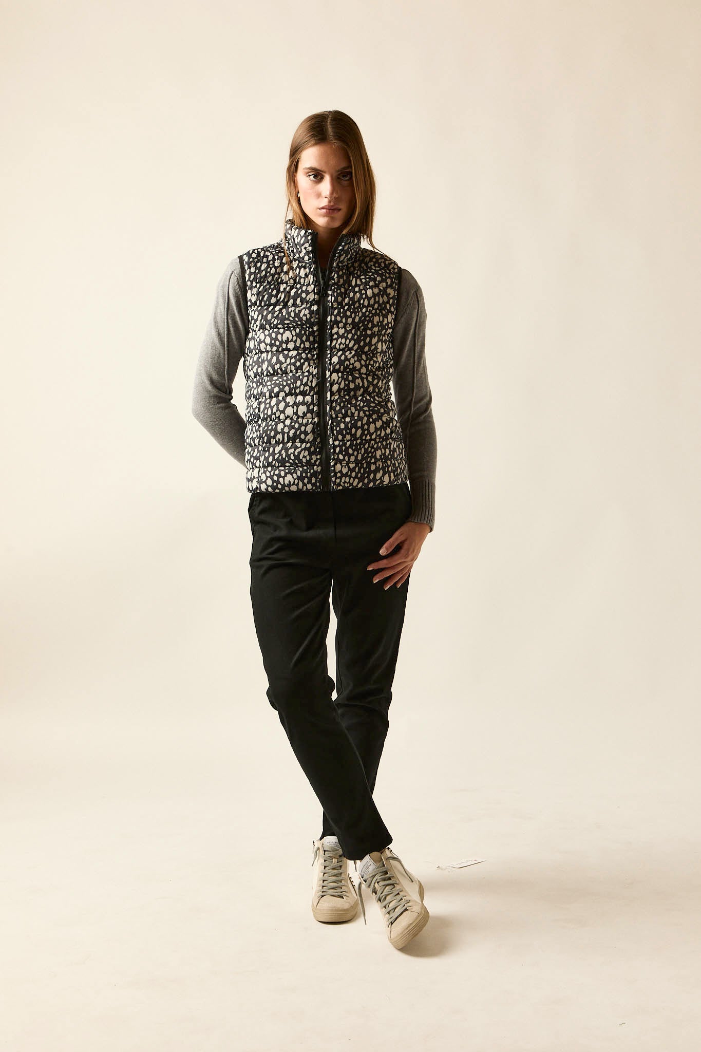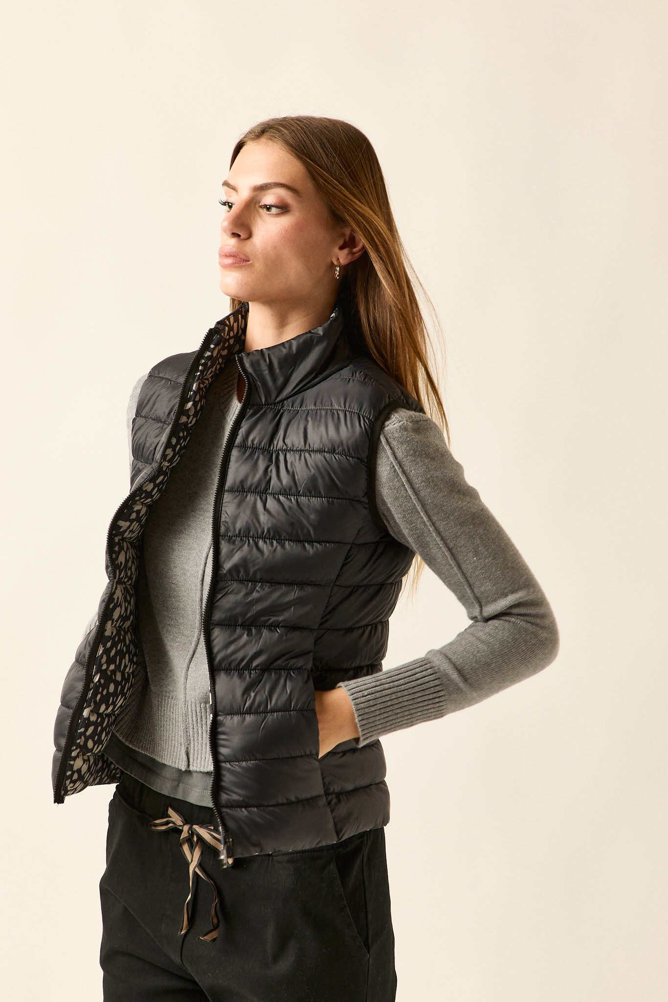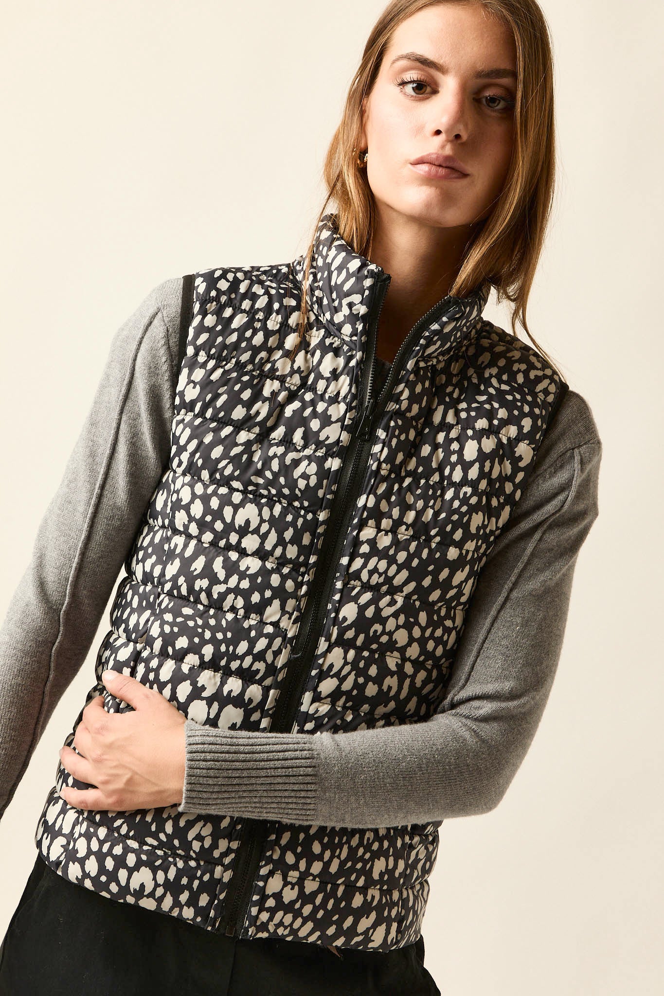 O colete reversível animal print bicolor destaca-se pelo seu design acolchoado leve, corte reto e gola subida com fecho frontal. De um lado, revela um sofisticado padrão animal print em contraste preto e branco; do outro, um acabamento liso para um visual mais discreto. Esta peça oferece versatilidade e conforto, sendo perfeita para sobrepor em looks de meia-estação.