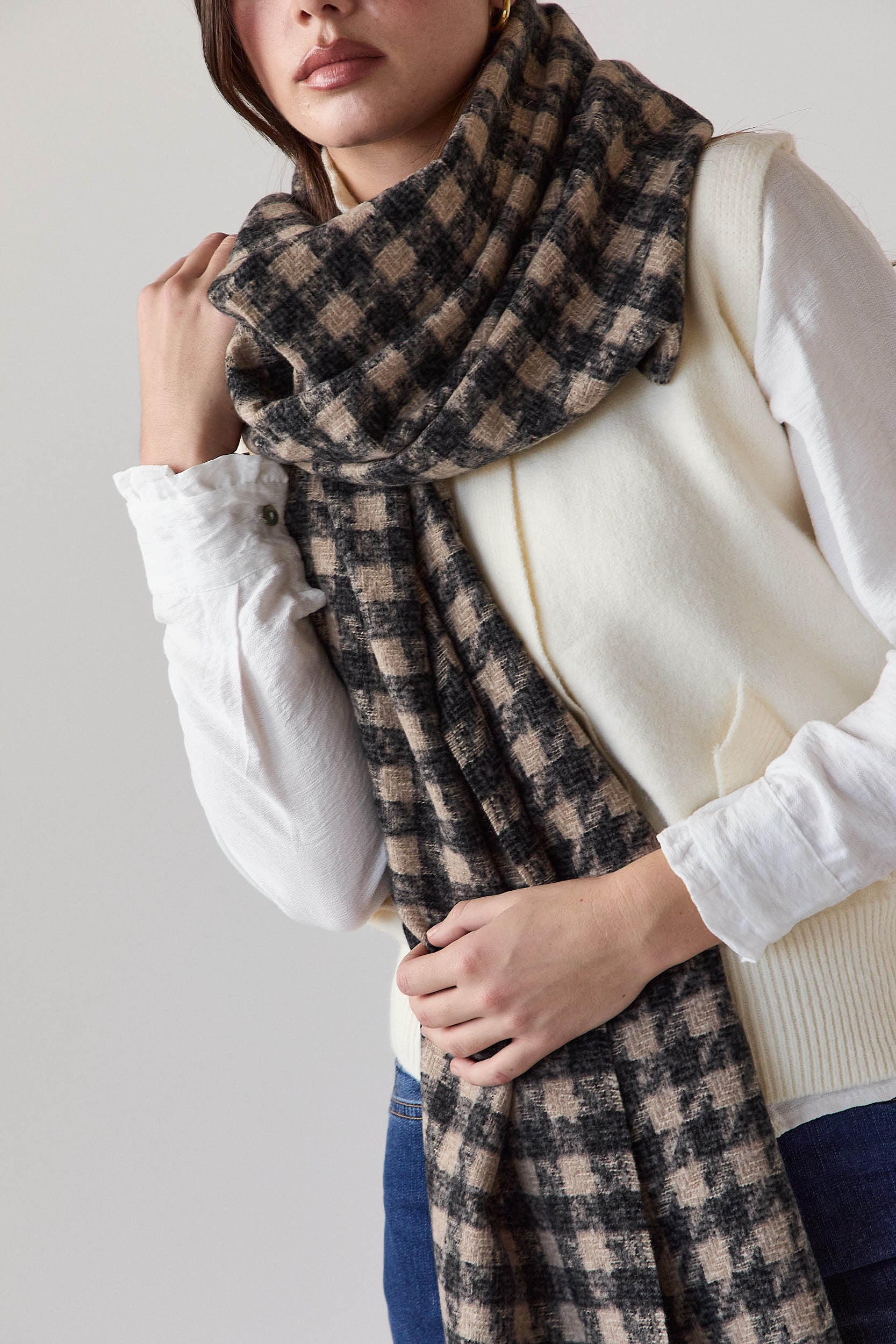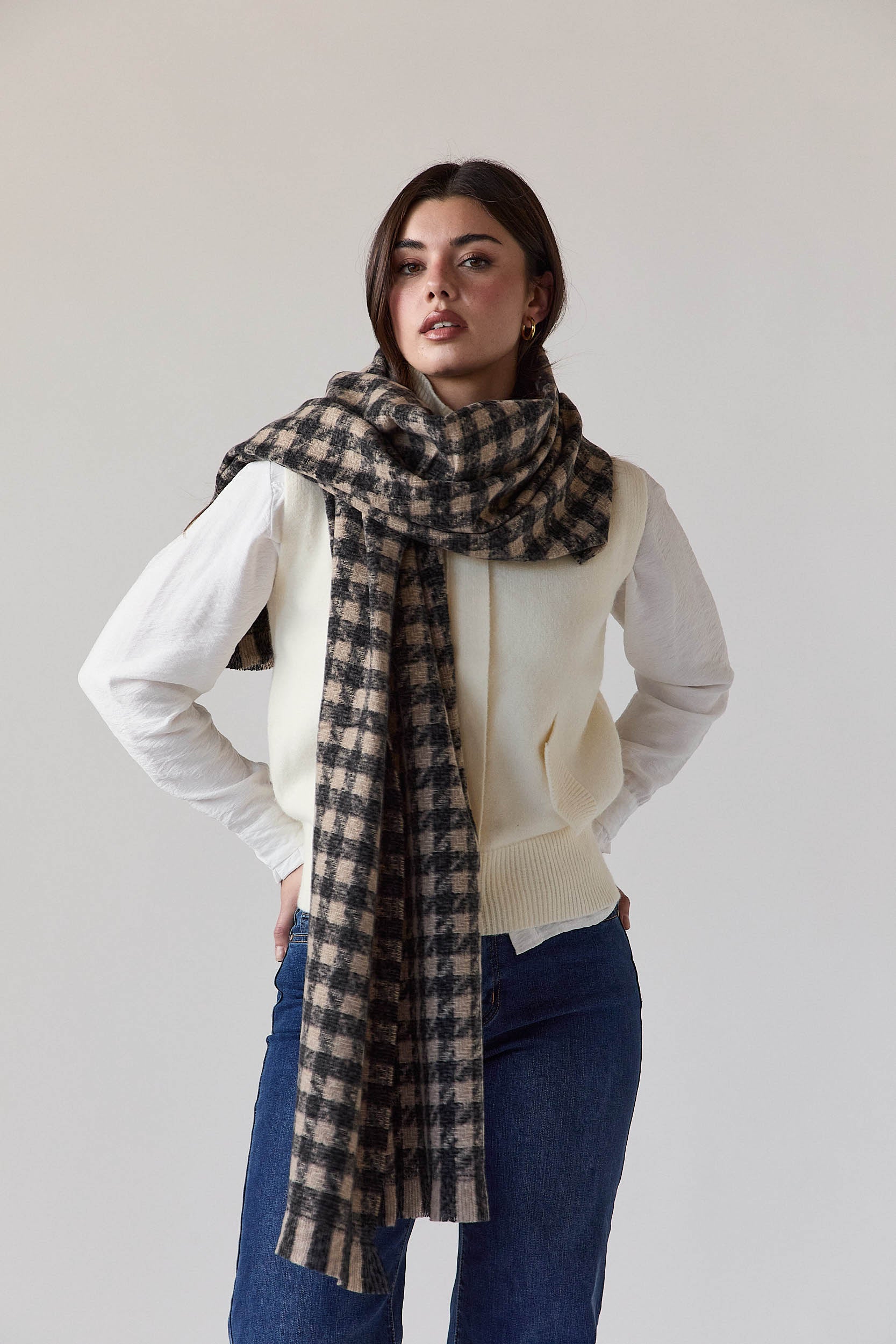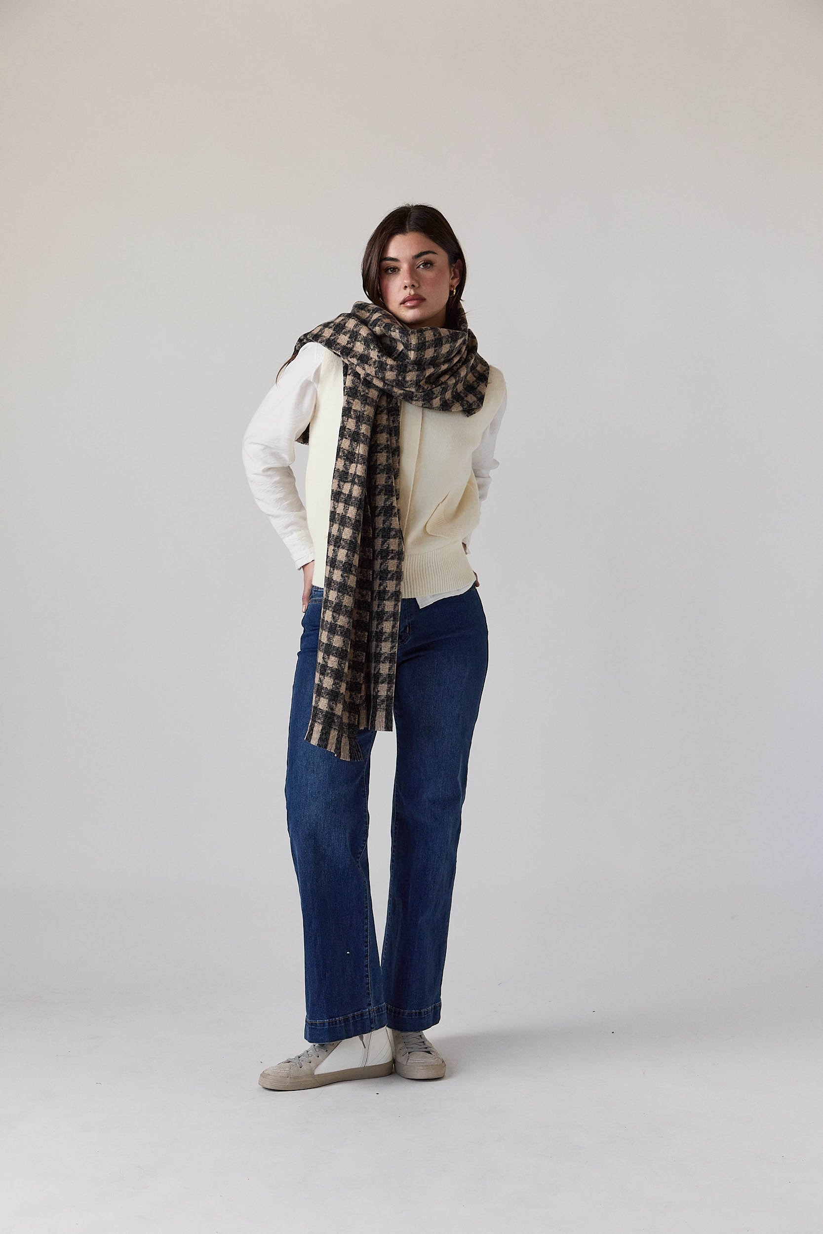 Bufanda amplia en tono gris con dibujo de pata de gallo en contraste beige. Su textura suave y su diseño envolvente la convierten en una pieza cálida y cómoda para el invierno. El estampado clásico aporta un toque elegante y versátil que funciona en todo tipo de looks.