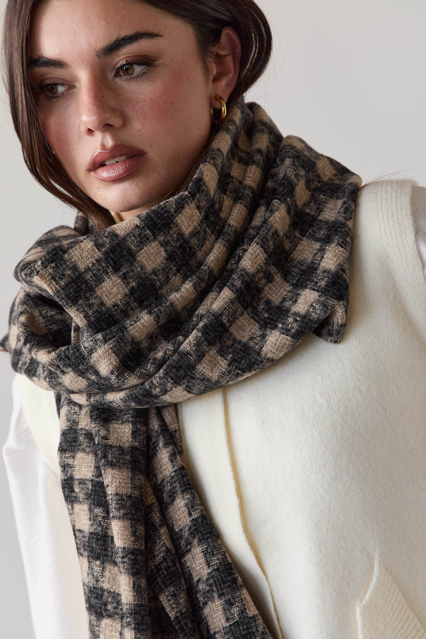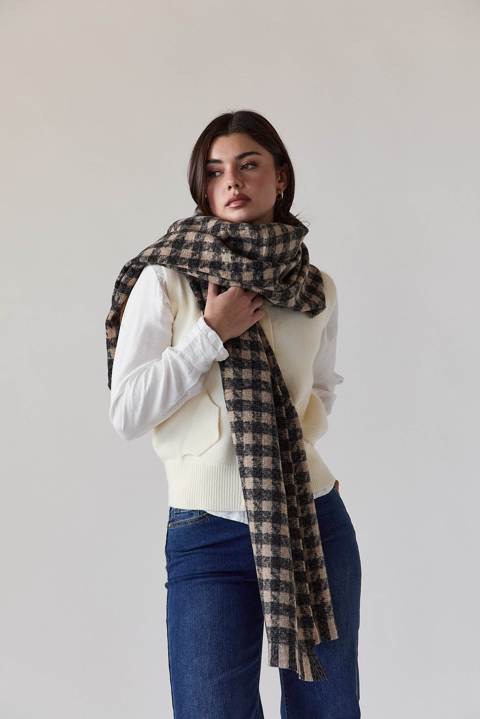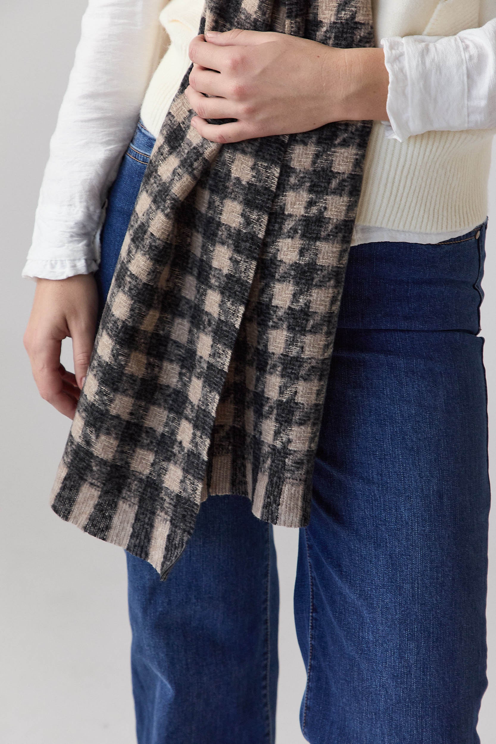 Bufanda amplia en tono gris con dibujo de pata de gallo en contraste beige. Su textura suave y su diseño envolvente la convierten en una pieza cálida y cómoda para el invierno. El estampado clásico aporta un toque elegante y versátil que funciona en todo tipo de looks.
