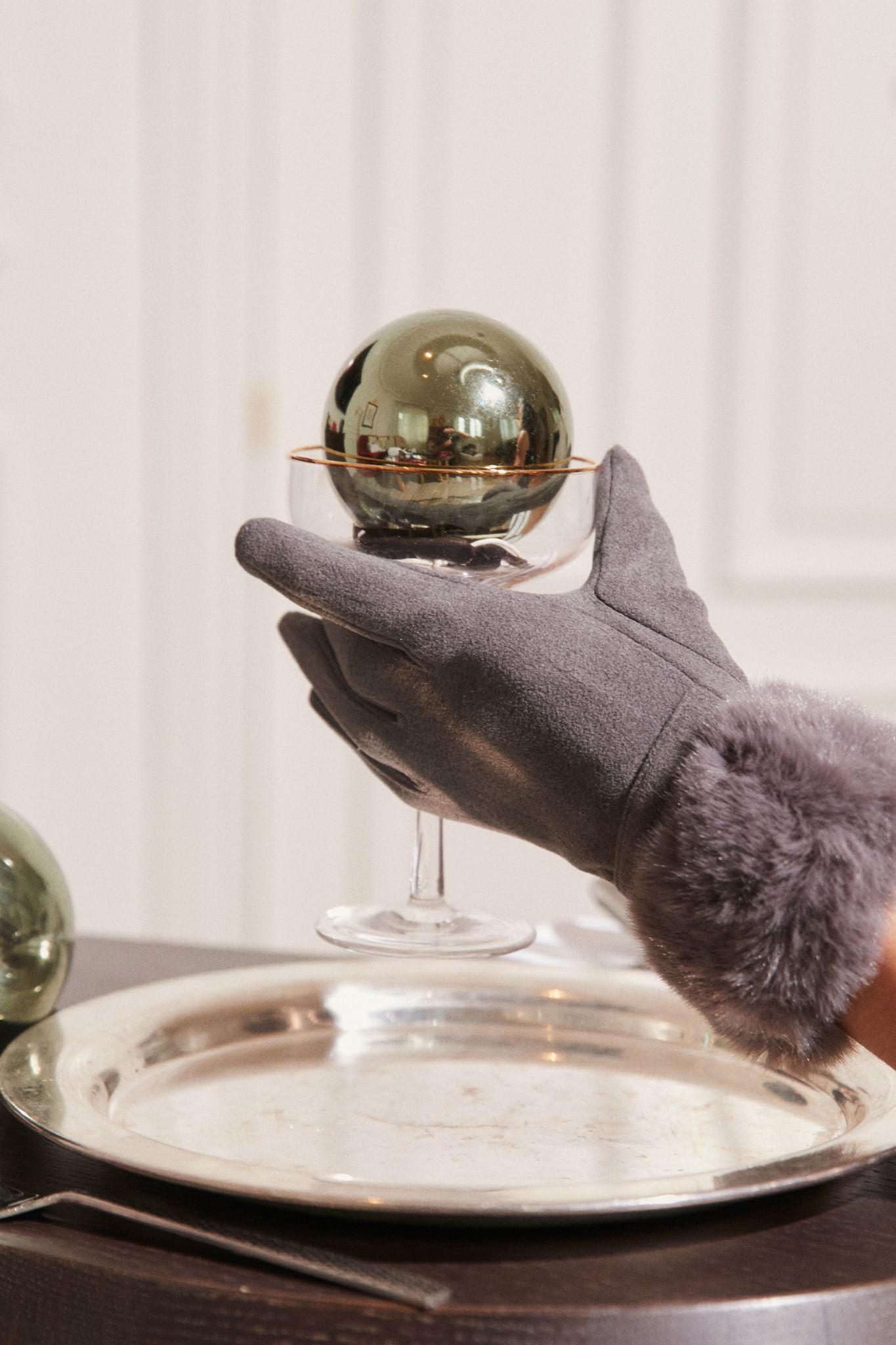Guantes de ante en tono gris con vuelta de pelo suave en el puño. Diseño fino y ajustado, con costuras marcadas que estilizan la mano y aportan una apariencia pulida. Un accesorio cálido y cómodo pensado para acompañarte en los días fríos con un toque elegante.