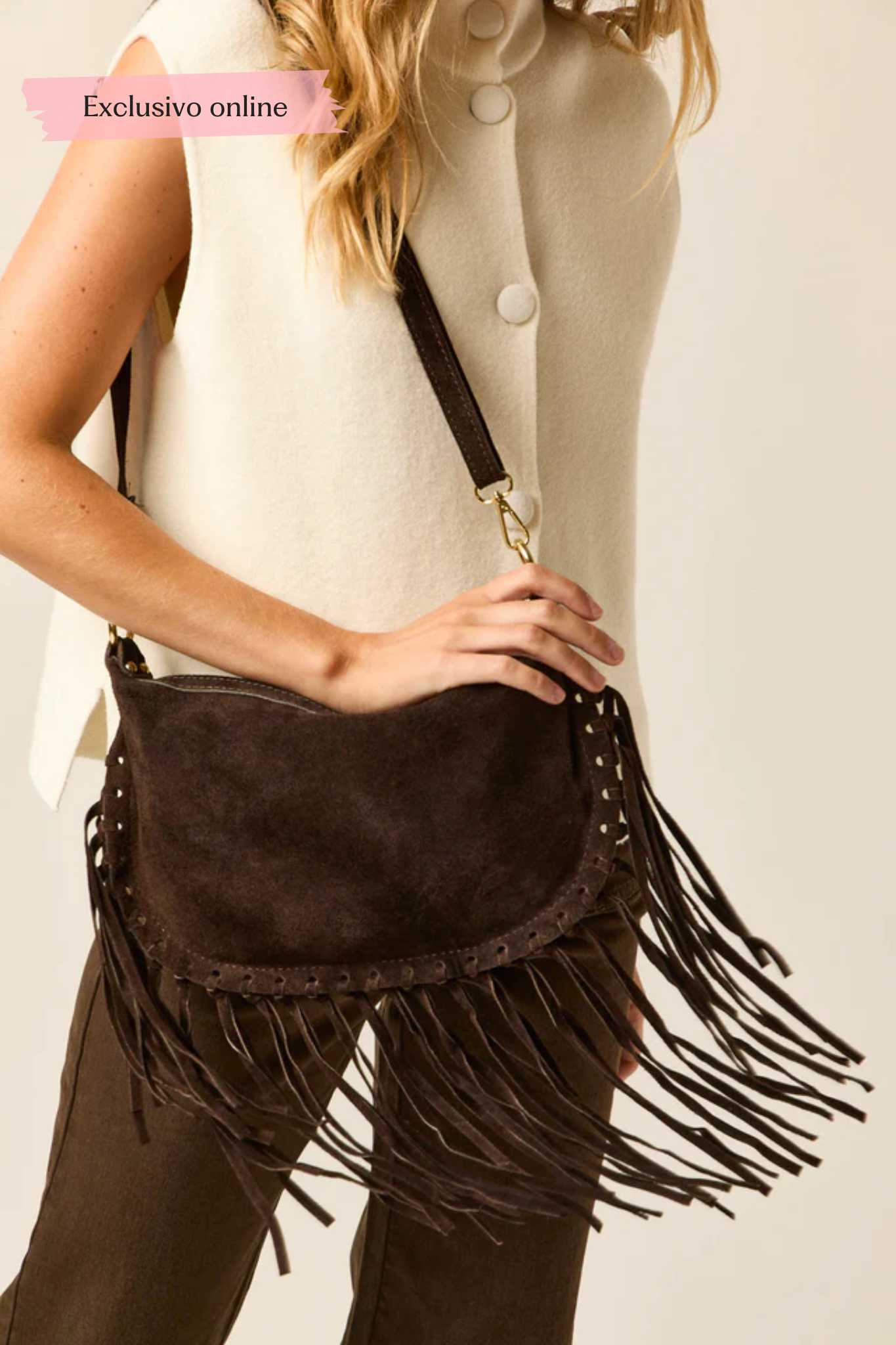 Bolso de ante en tono marrón, de formato bandolera con cierre de cremallera. El borde frontal está rematado con pespuntes decorativos y detalle de flecos largos que aportan un aire boho al diseño. La correa es regulable y extraíble gracias a sus enganches metálicos.