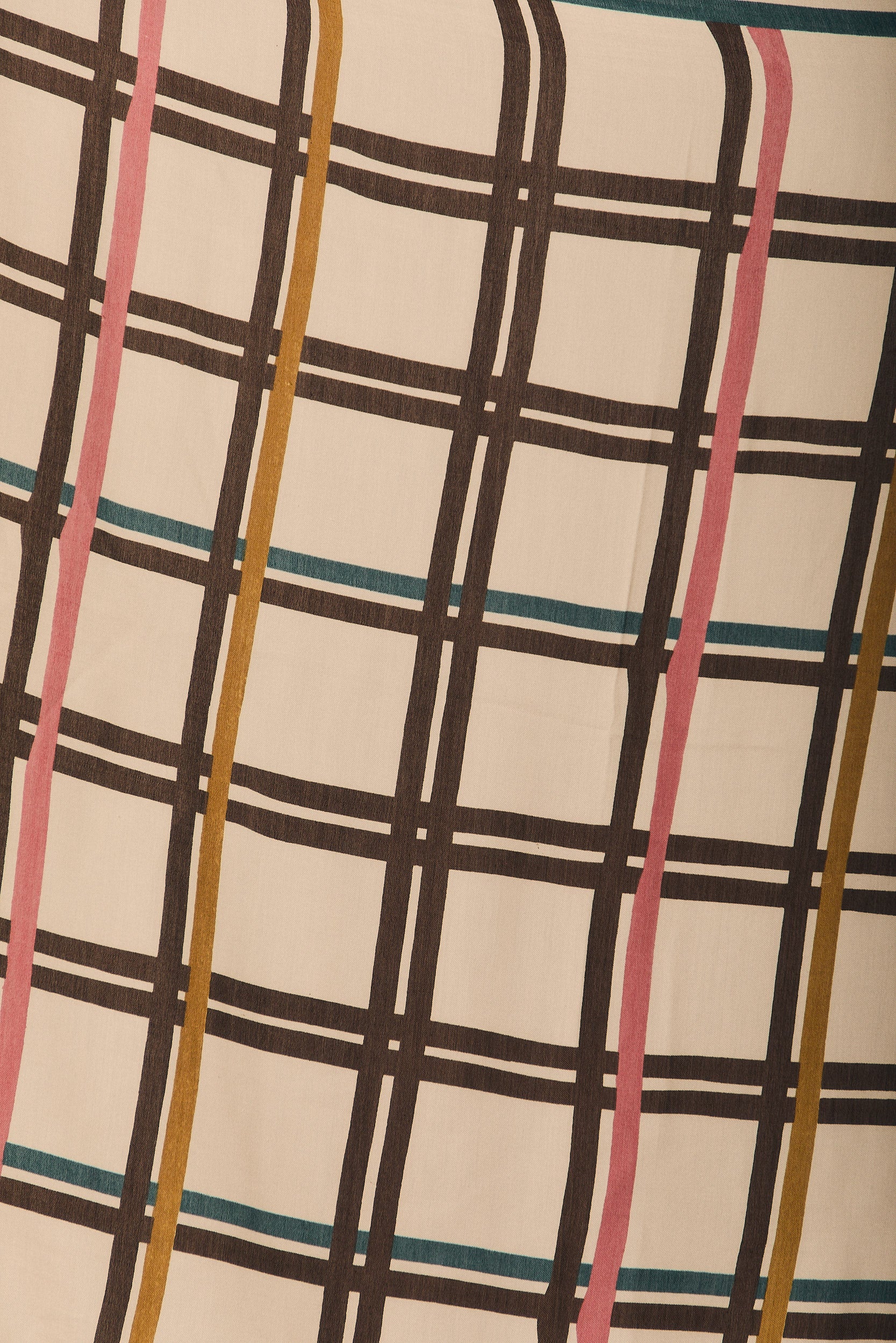 Foulard comprido em tom creme com estampado de quadrados em contraste, onde se cruzam linhas em castanho, verde e subtis toques rosados. O formato alongado e leve permite várias formas de usar, enquanto os bordos desfiados acrescentam um acabamento natural e descontraído, ideal para dar textura a casacos e malhas lisas.