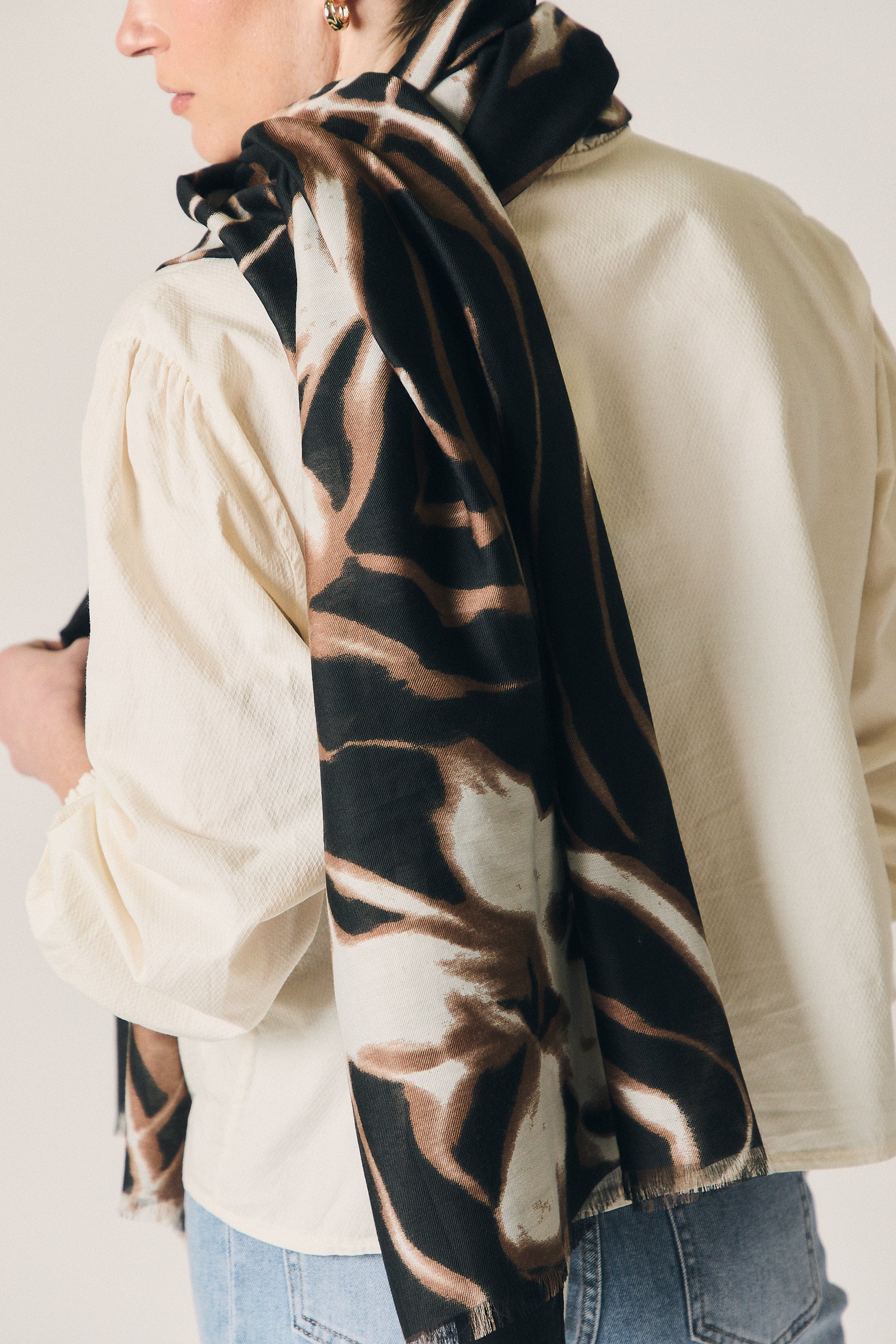 Foulard de gran tamaño con base negra y estampado floral en tonos crudos y marrones. Diseño amplio y ligero, con caída fluida y bordes ligeramente desflecados que aportan un acabado natural. El contraste del print crea un efecto visual marcado, fácil de integrar en looks lisos.