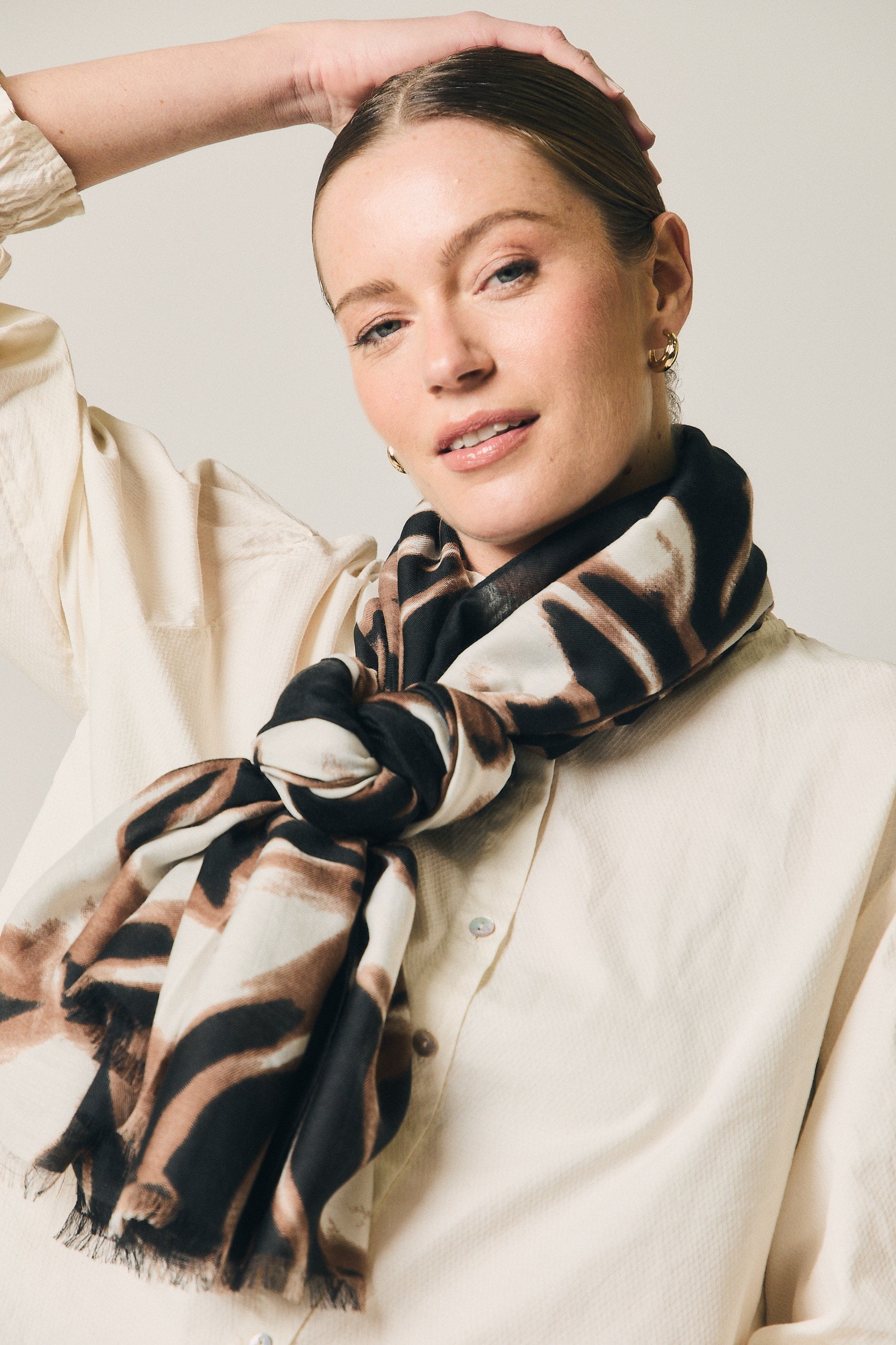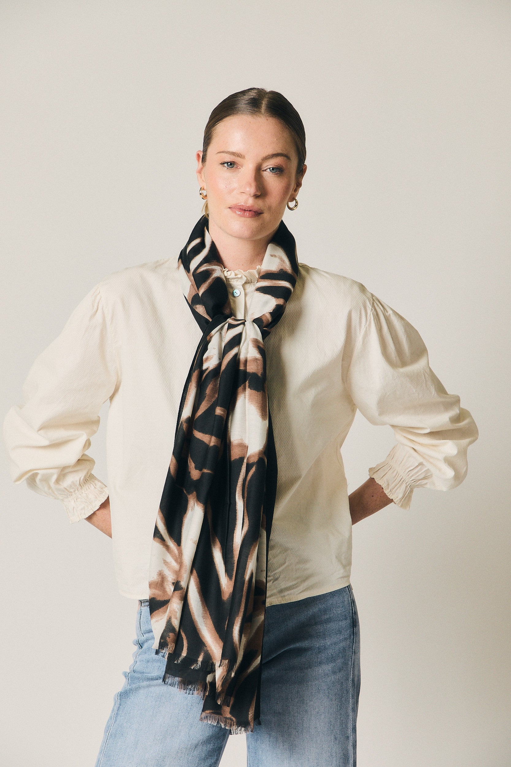 Un complemento pensado para dar personalidad a conjuntos de diario. Funciona con blusas claras, jerseys de punto o prendas exteriores en tonos neutros. Llévalo alrededor del cuello, sobre los hombros o como chal ligero para sumar presencia y movimiento al look.