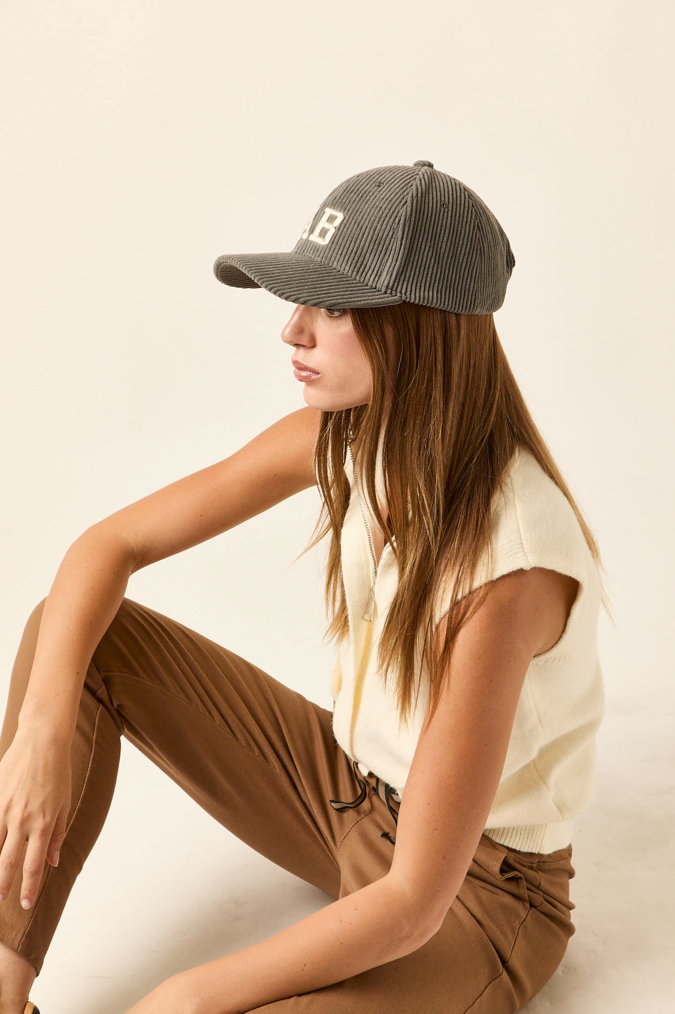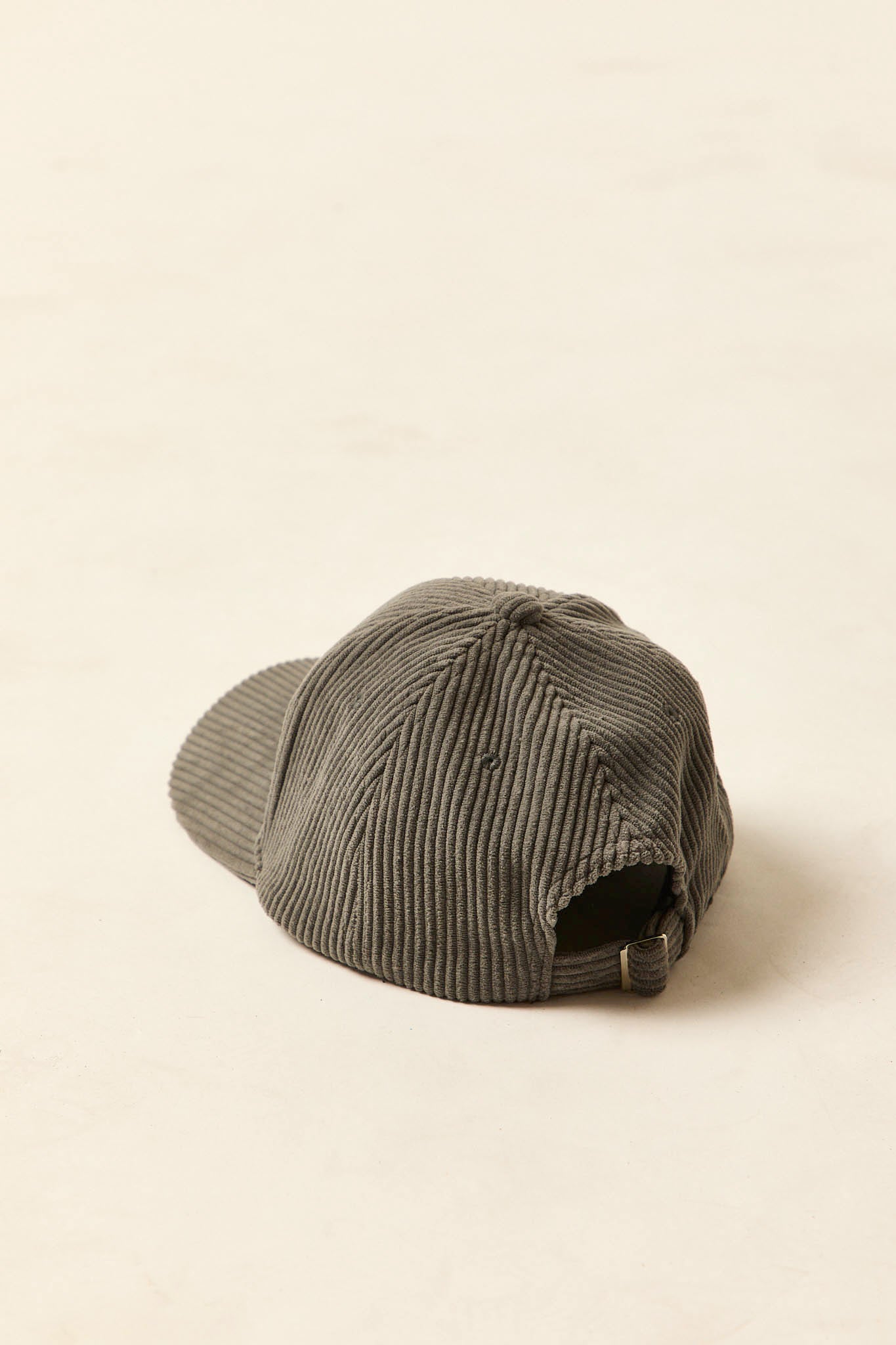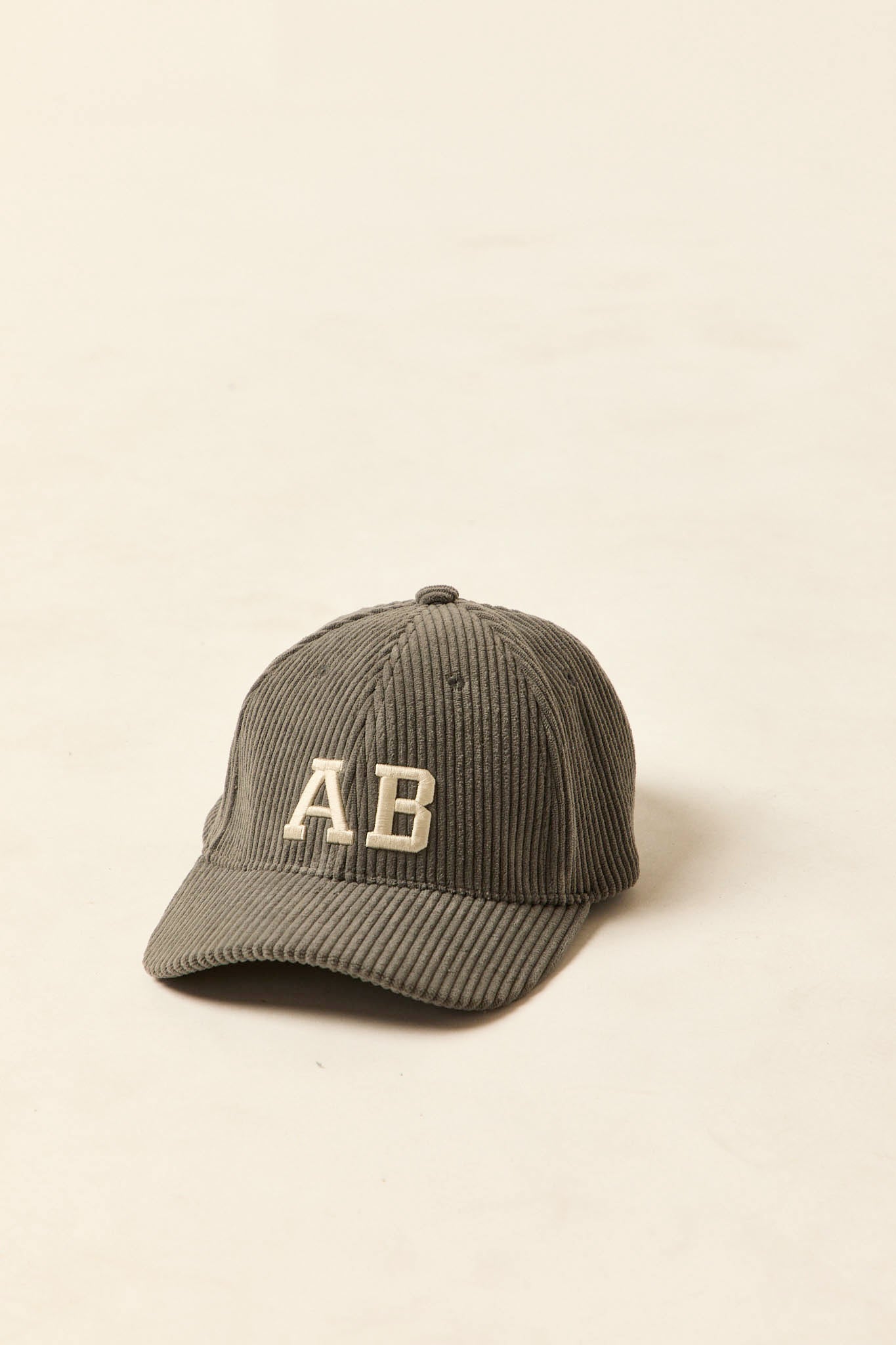 Gorra en tono gris medio con diseño de pana y letras bordadas en relieve AB en la parte frontal. Su estructura de seis paneles y visera curvada ofrece comodidad y ajuste, mientras que la parte trasera incorpora cierre regulable metálico para adaptarse a distintas tallas.