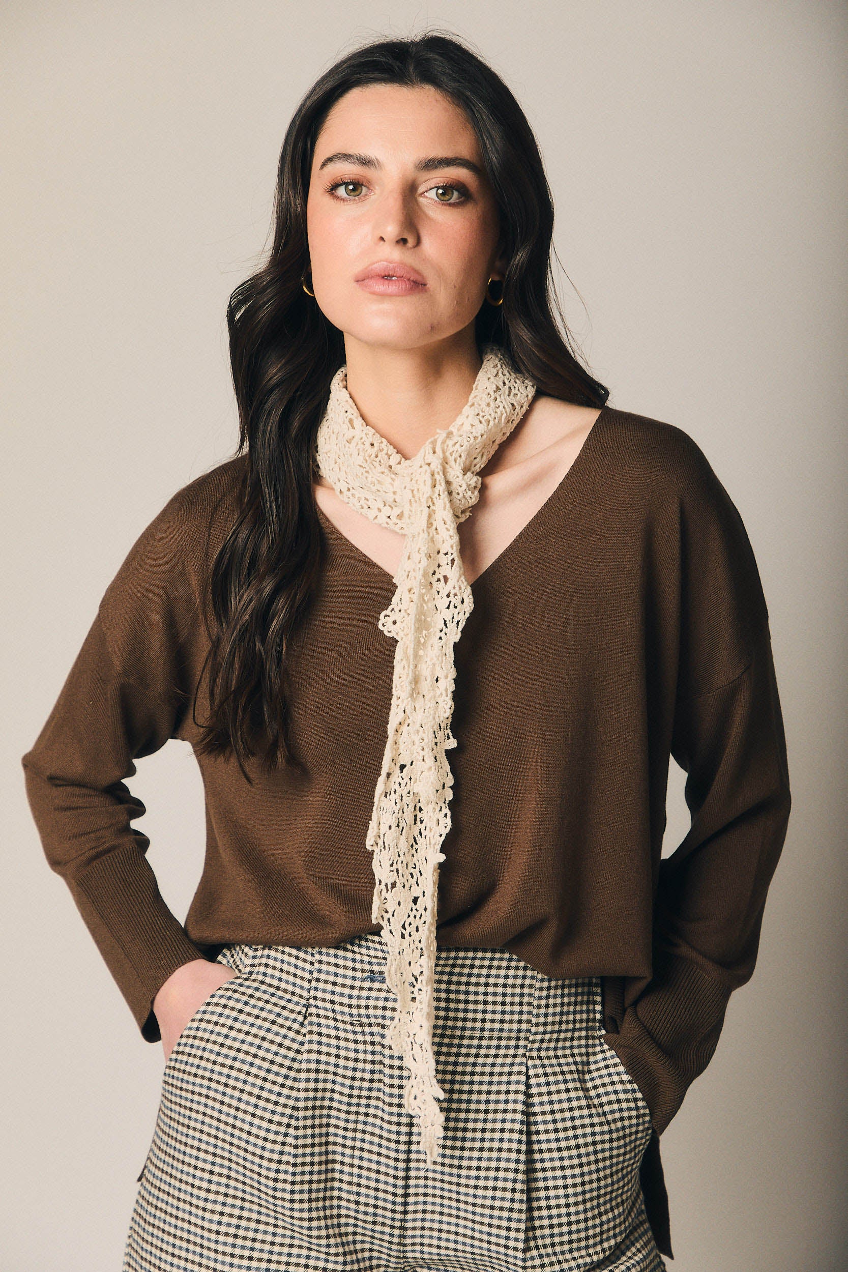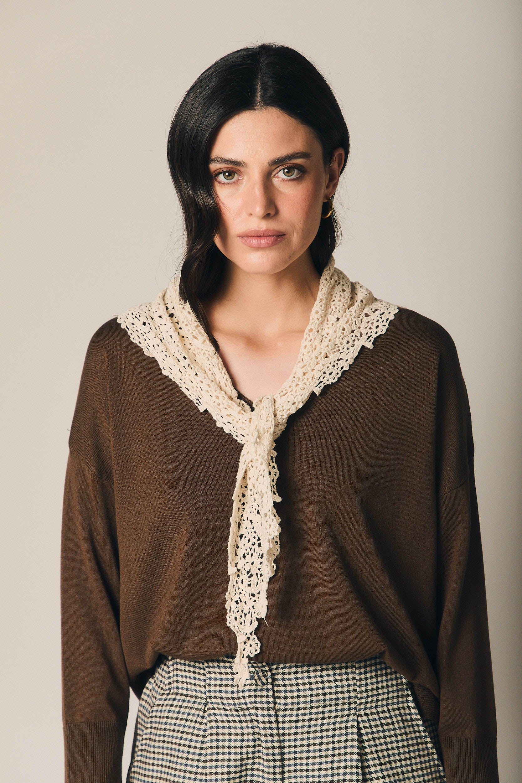 Perfeito para dar um ponto de luz discreto aos looks de dias amenos, este lenço em malha rendada resulta tão bem sobre uma t-shirt simples como a rematar um blazer ou um casaco leve. Um acessório feminino e subtil, que acrescenta interesse ao coordenado sem roubar protagonismo.
