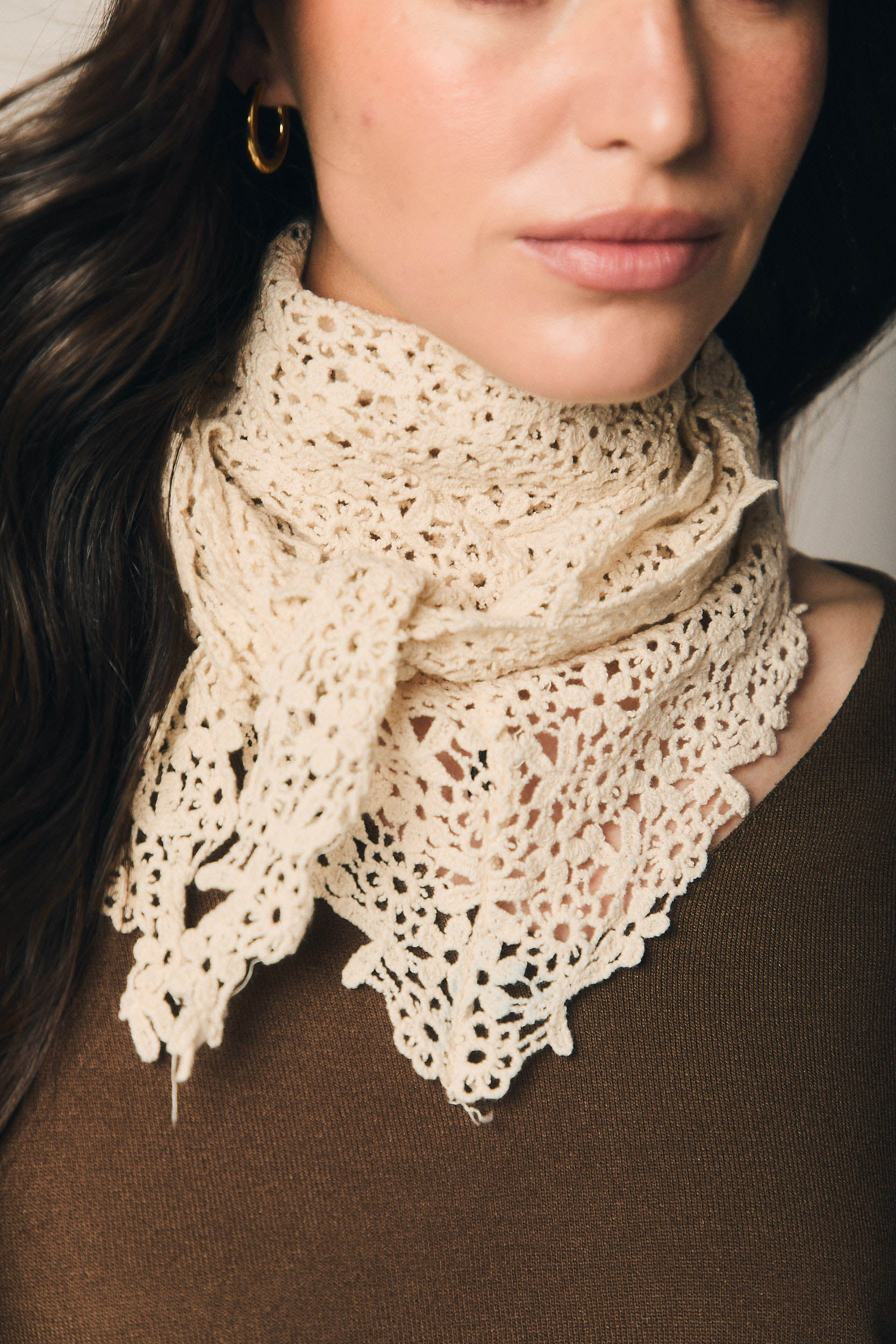 Lenço em crochet em tom natural, leve e delicado, com desenho rendado que confere textura e um acabamento muito cuidado. O formato permite ajustá-lo facilmente ao pescoço ou sobre os ombros, criando diferentes volumes sem pesar.