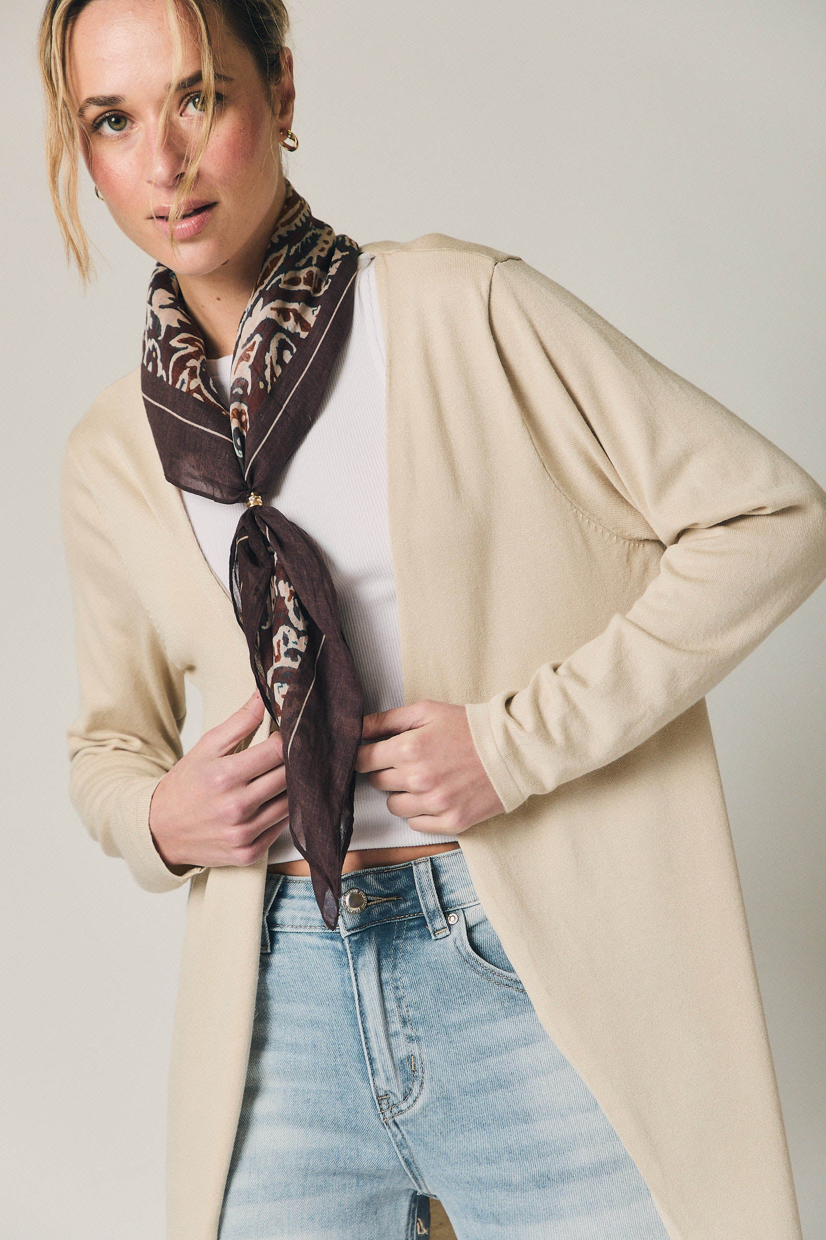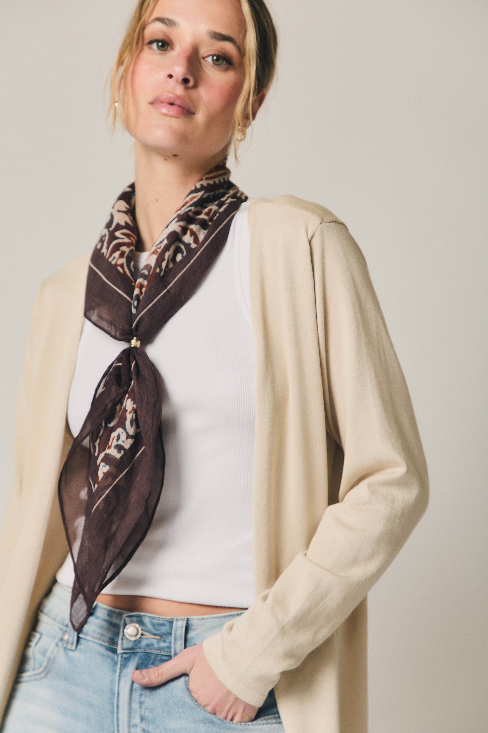 Pañuelo pequeño con estampado paisley en tonos marrones y crudos. Formato ligero y versátil, pensado para llevar al cuello, en el pelo o como detalle en bolsos y cinturones. Diseño cuidado que aporta un punto de contraste sin recargar el conjunto.
