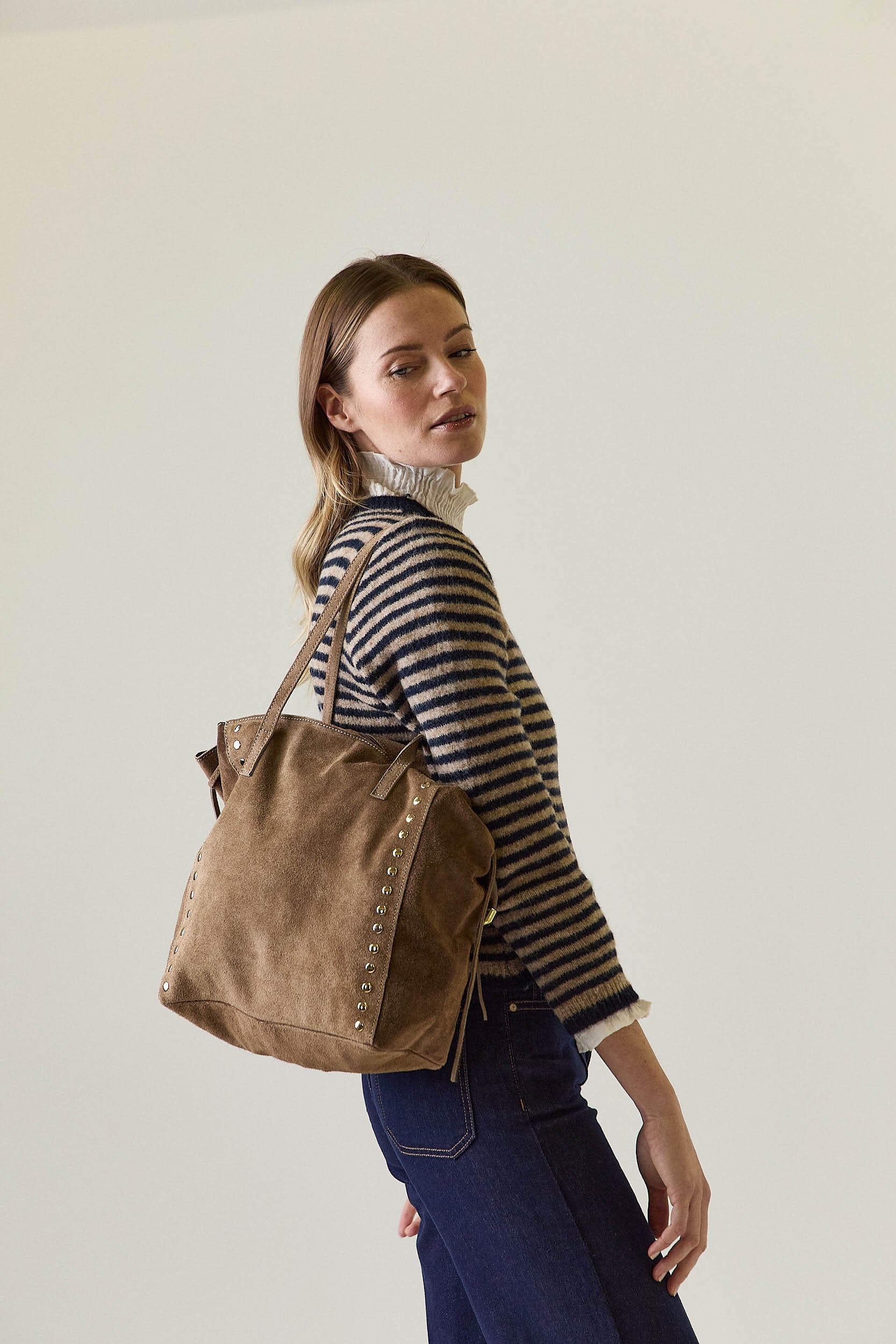 Bolso tote en ante topo con diseño estructurado y detalle de tachas doradas a ambos lados. Cuenta con asas largas para llevar al hombro y tiras laterales que aportan un acabado actual y sofisticado.