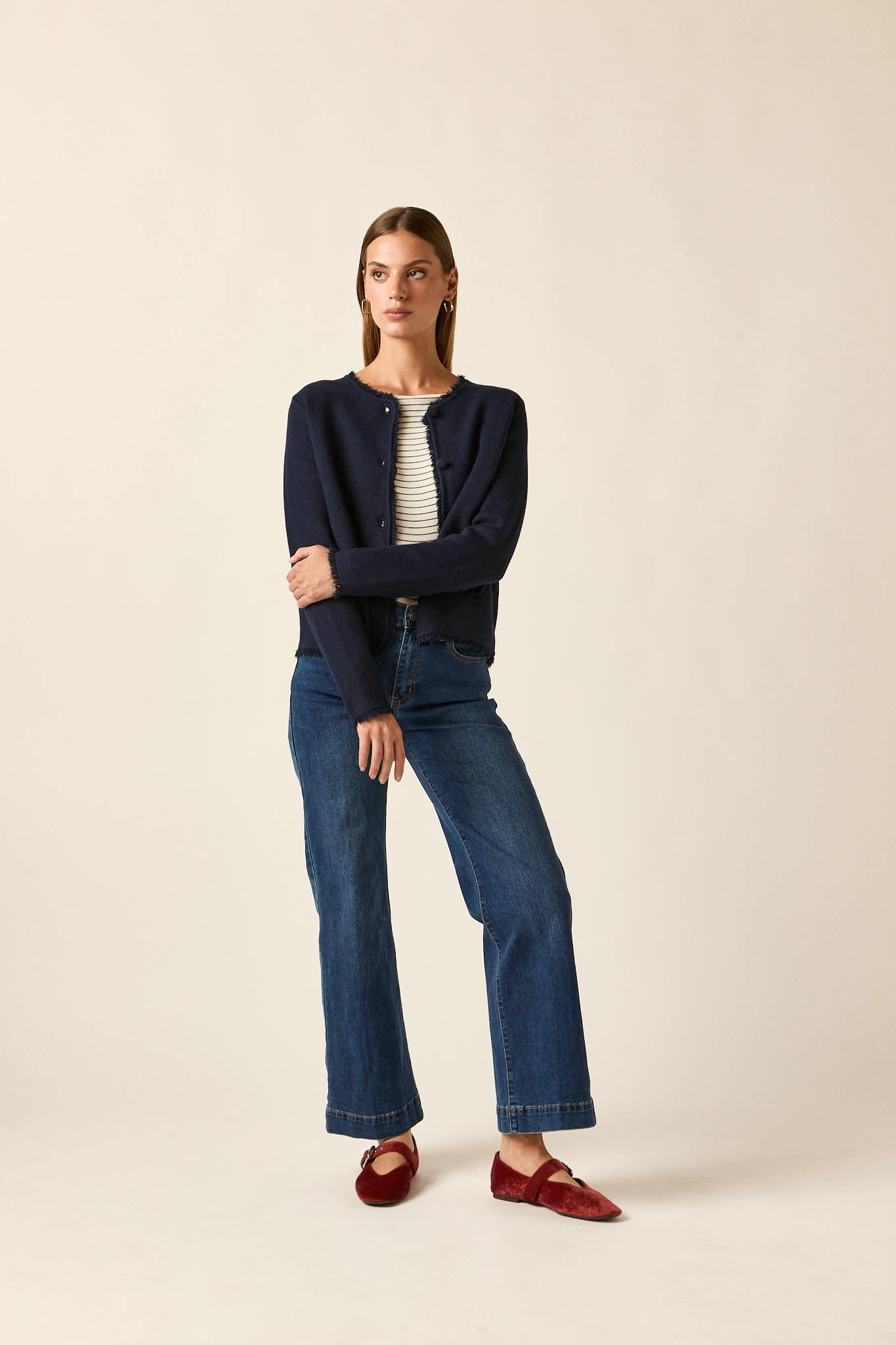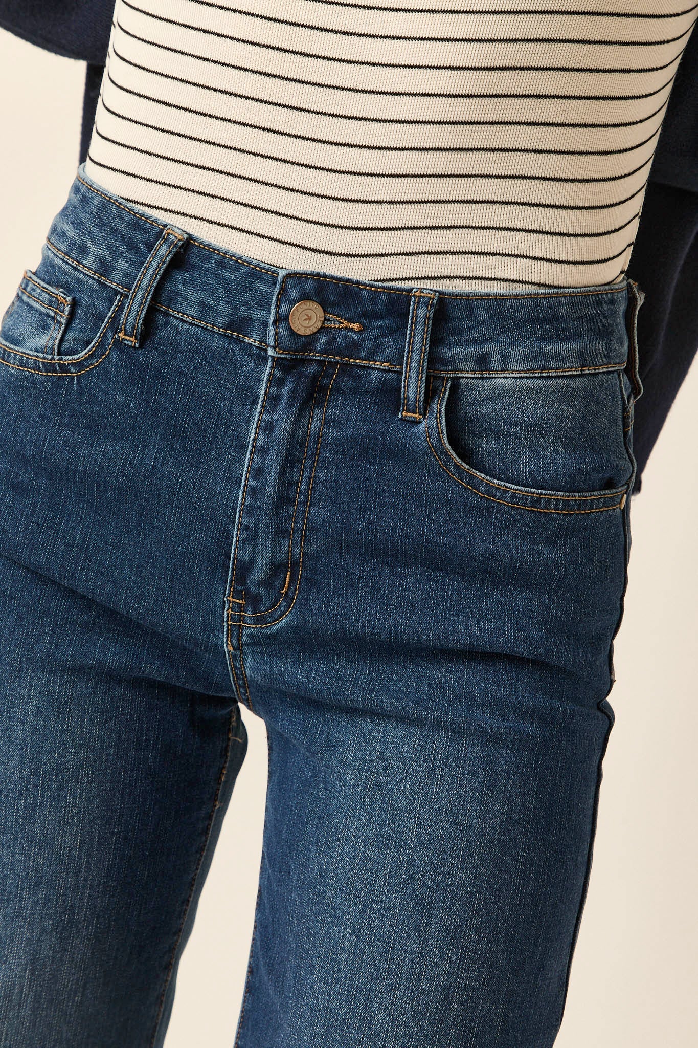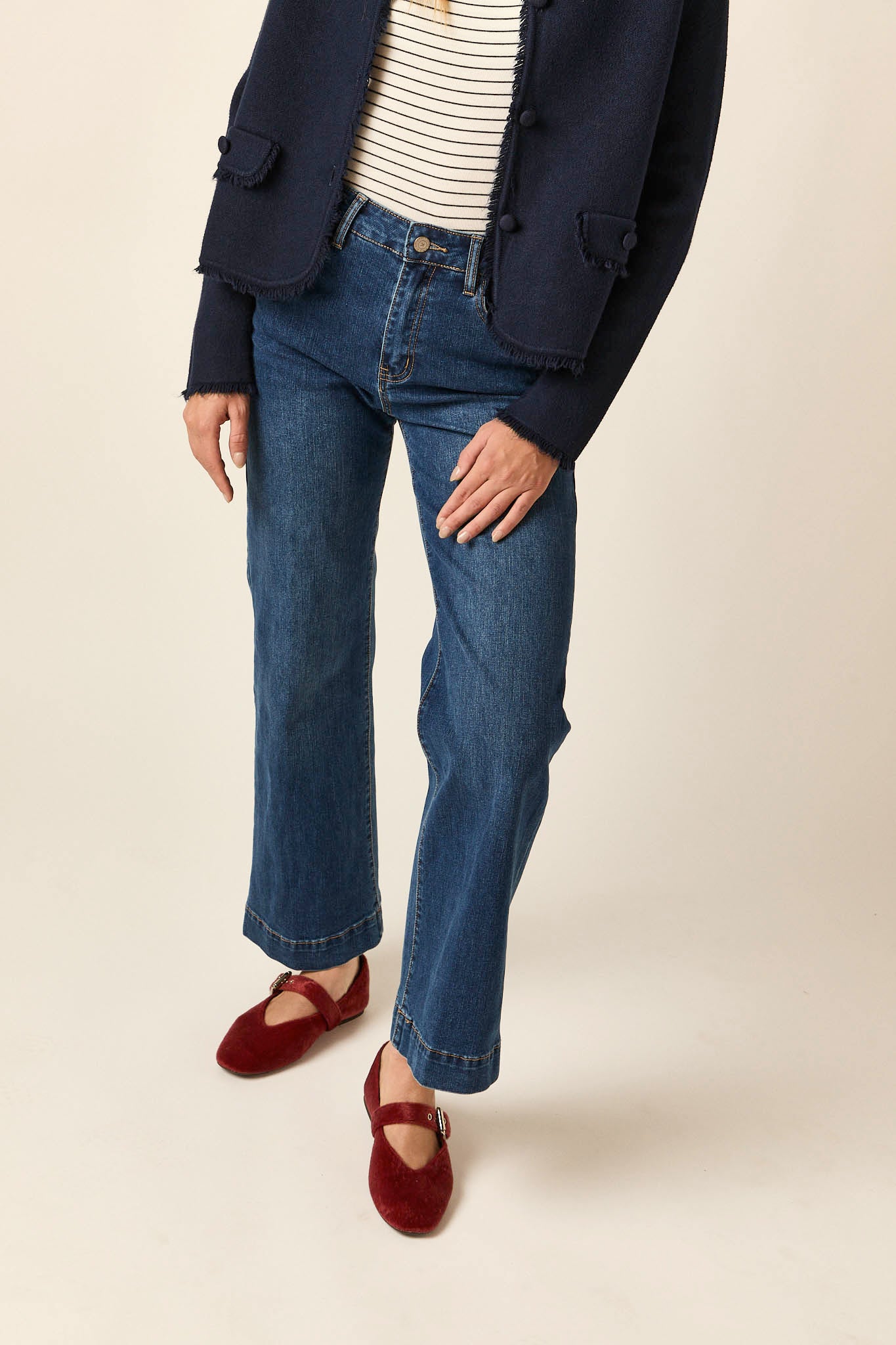 As jeans cropped azul de corte reto destacam-se pelo seu design clássico de cinco bolsos, cintura subida e ligeira abertura na bainha, terminando elegantemente ao nível do tornozelo. O fecho metálico e as costuras em contraste conferem um toque intemporal e sofisticado, perfeito para quem procura versatilidade no guarda-roupa.
