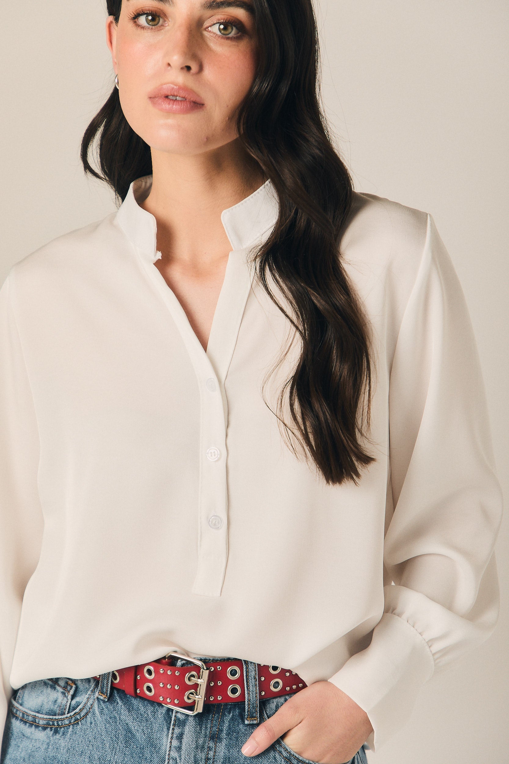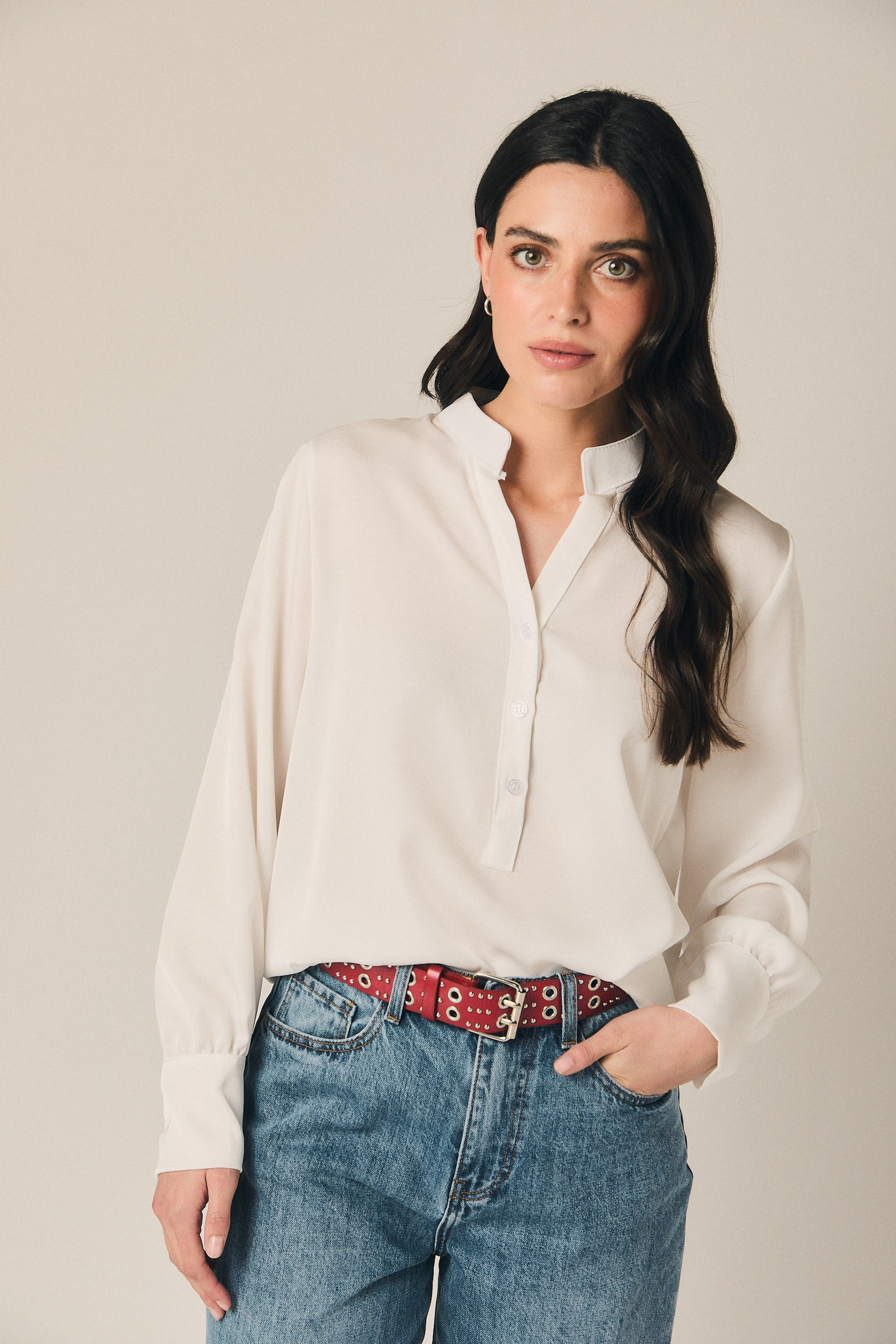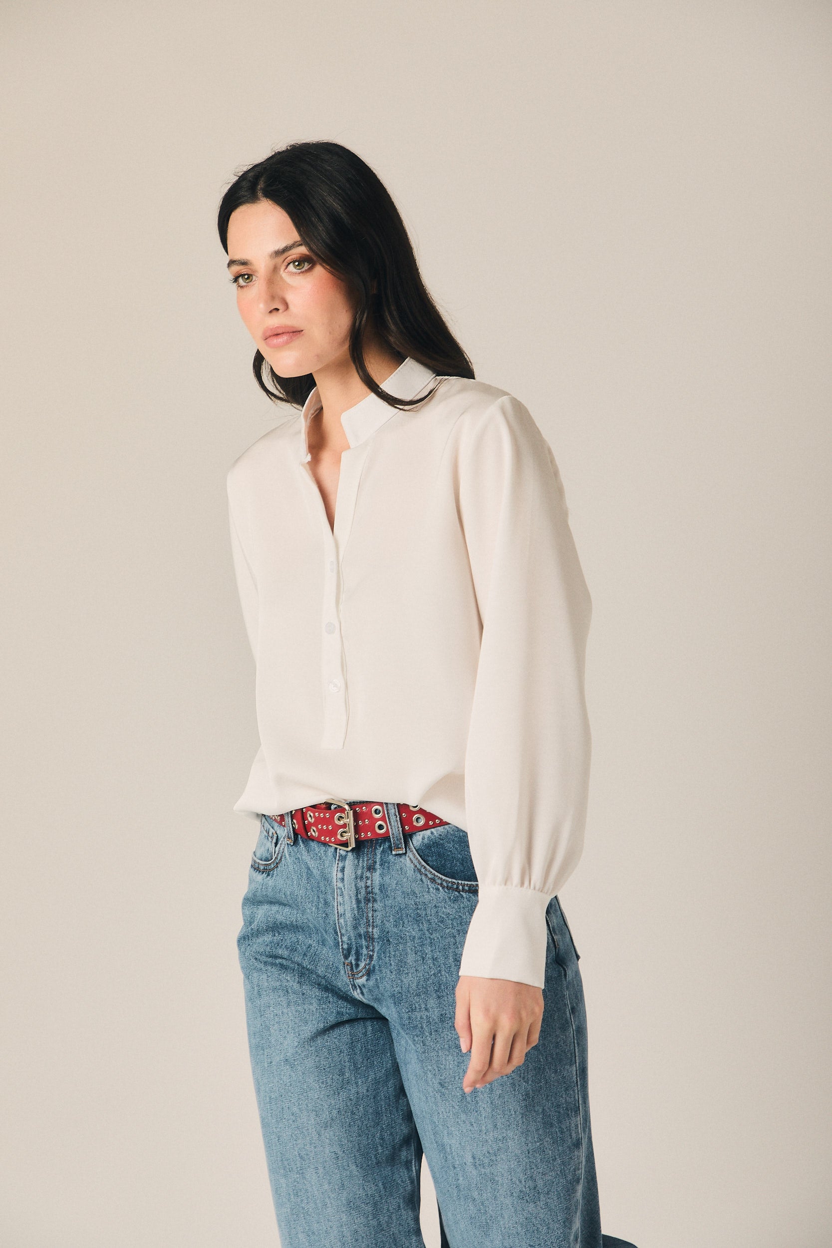 A blusa satinada branca com gola mao apresenta um corte direito e limpo, com decote em bico e carcela com botões que alongam subtilmente a silhueta. O tecido fluido com acabamento acetinado confere um brilho discreto e elegante, enquanto a manga comprida termina num punho largo abotoado que dá estrutura ao conjunto e um ar mais polido.