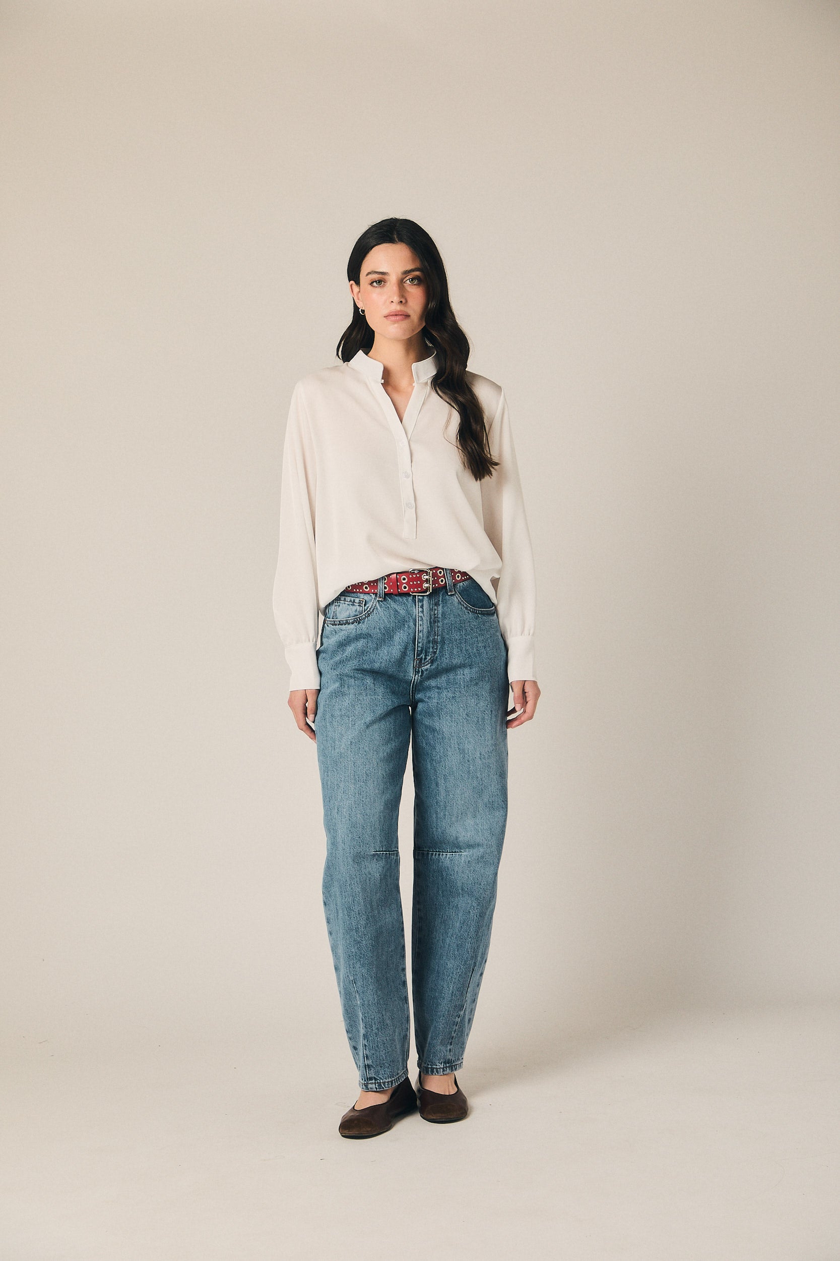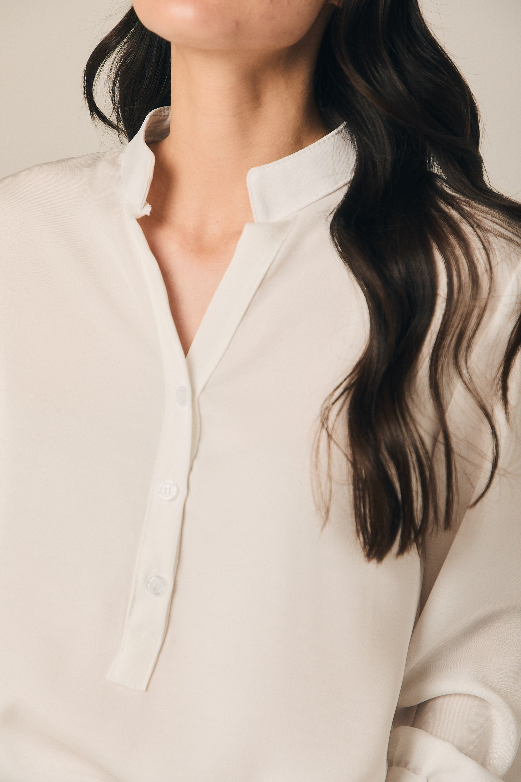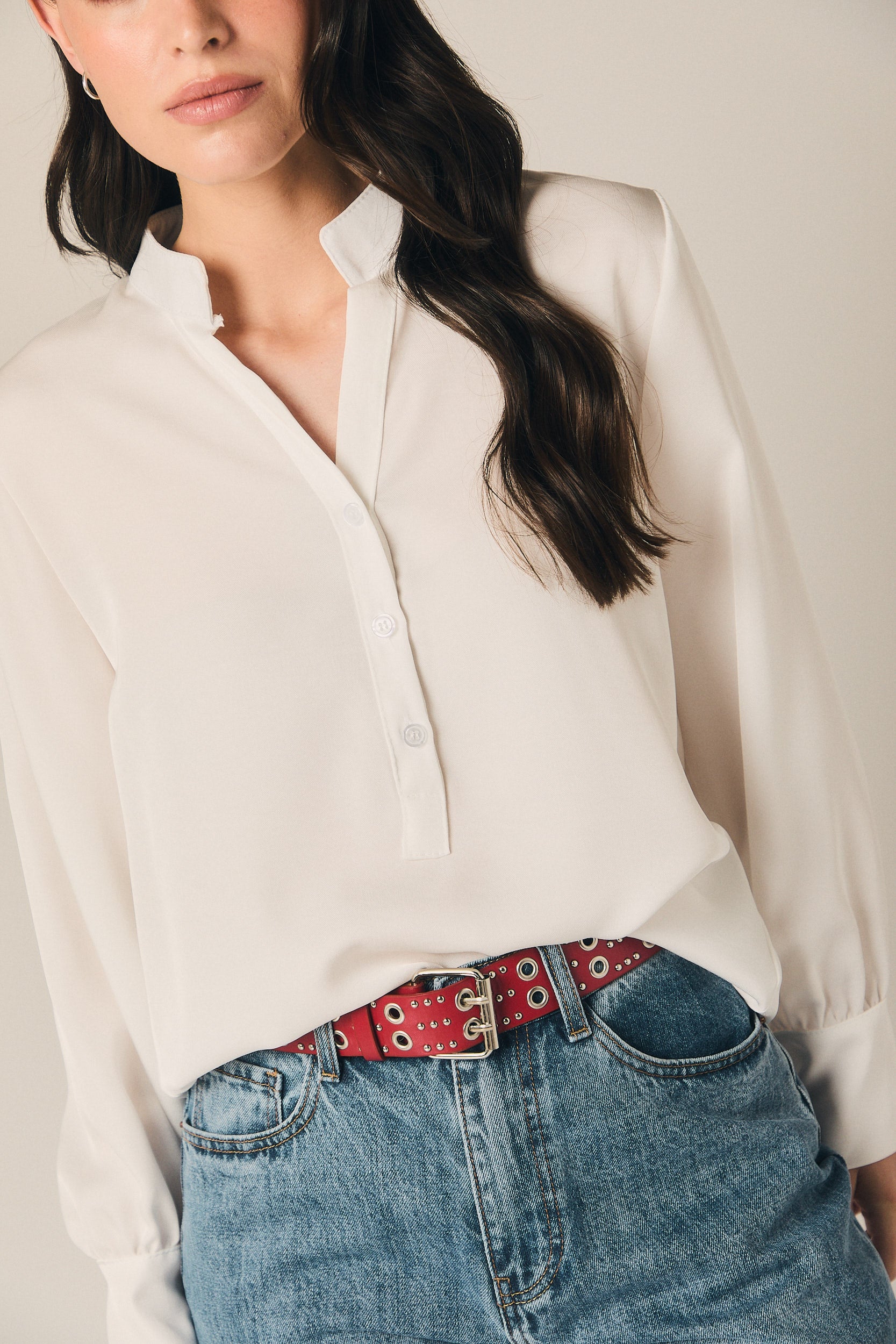A blusa satinada branca com gola mao apresenta um corte direito e limpo, com decote em bico e carcela com botões que alongam subtilmente a silhueta. O tecido fluido com acabamento acetinado confere um brilho discreto e elegante, enquanto a manga comprida termina num punho largo abotoado que dá estrutura ao conjunto e um ar mais polido.