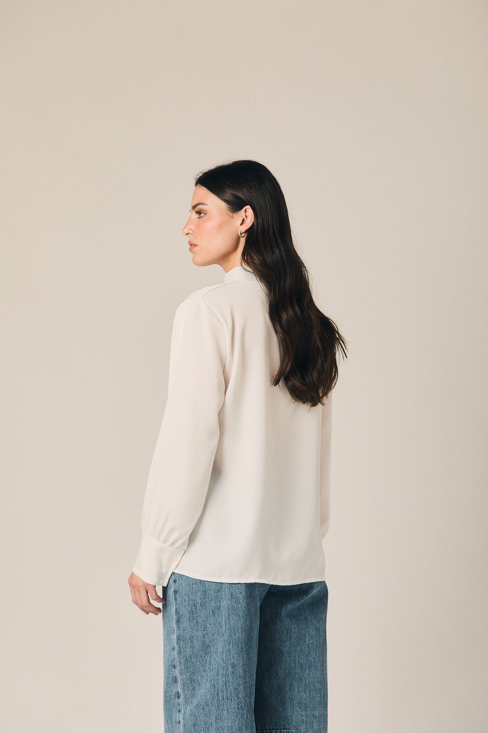 Ideal para quem procura uma blusa branca feminina que funcione tanto em contexto profissional como em ocasiões especiais, adapta-se facilmente a dias amenos em que apetece uma camada leve mas cuidada. Use-a com calças de pinças e blazer para um coordenado de trabalho sofisticado, com jeans direitos para um registo descontraído mas arrumado, ou por baixo de coletes e cárdigans para jogos de sobreposição suaves.