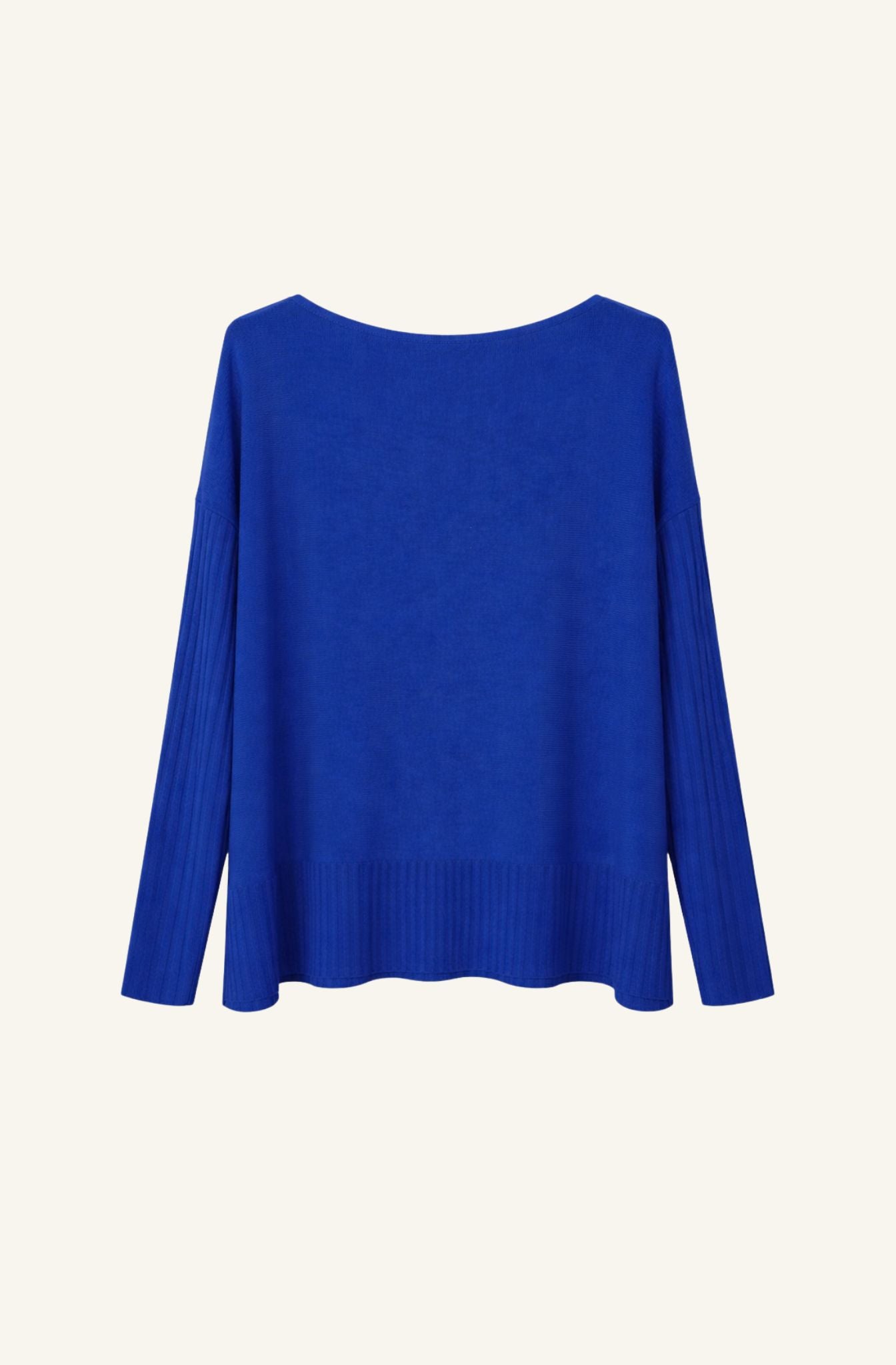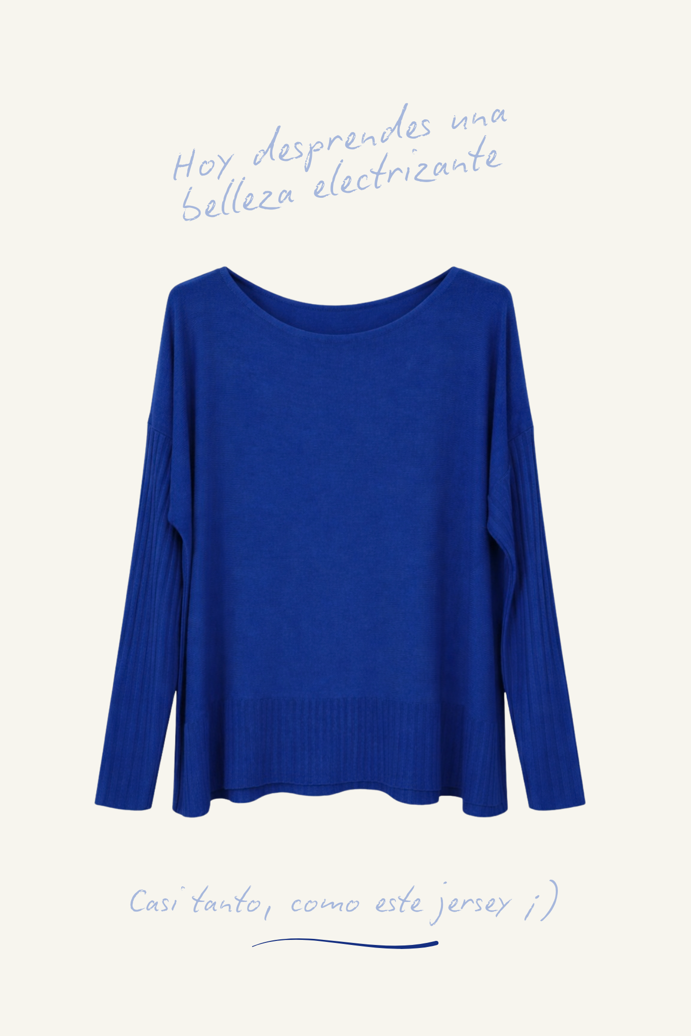 Jersey de punto fino en tono azul eléctrico, con cuello redondo y manga larga. El diseño combina un cuerpo de textura lisa con mangas en canalé, aportando un sutil contraste y un acabado más cuidado. Corte recto y silueta relajada, pensada para un ajuste cómodo y favorecedor.