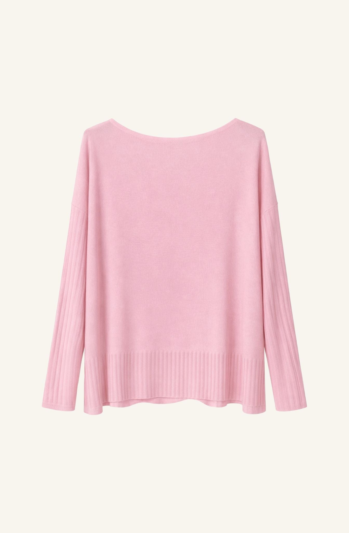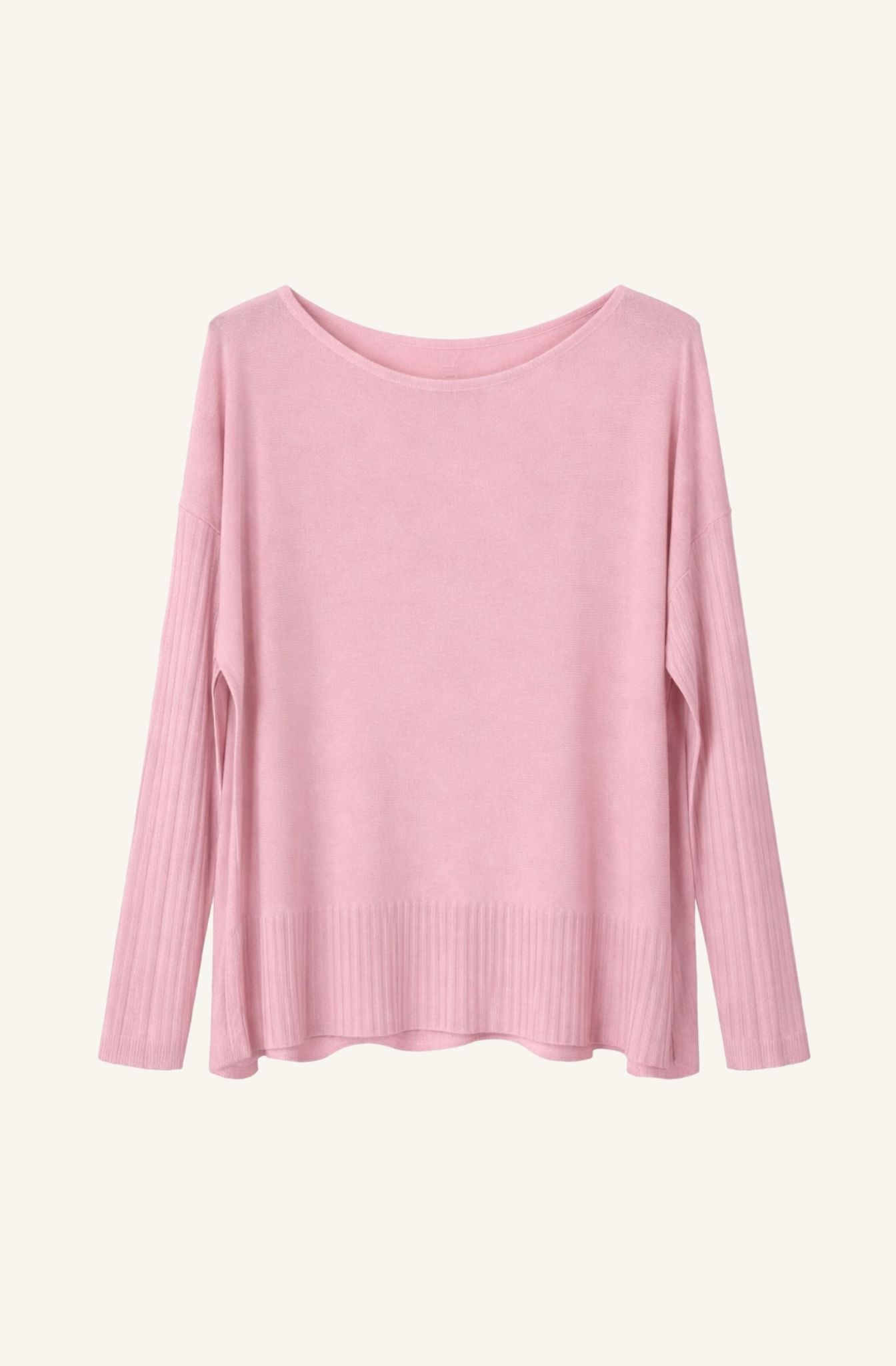 Jersey de punto fino en tono rosa pastel, con cuello redondo y manga larga. El diseño combina un cuerpo de textura lisa con mangas en canalé, aportando un sutil contraste y un acabado más cuidado. Corte recto y silueta relajada, pensada para un ajuste cómodo y favorecedor.
