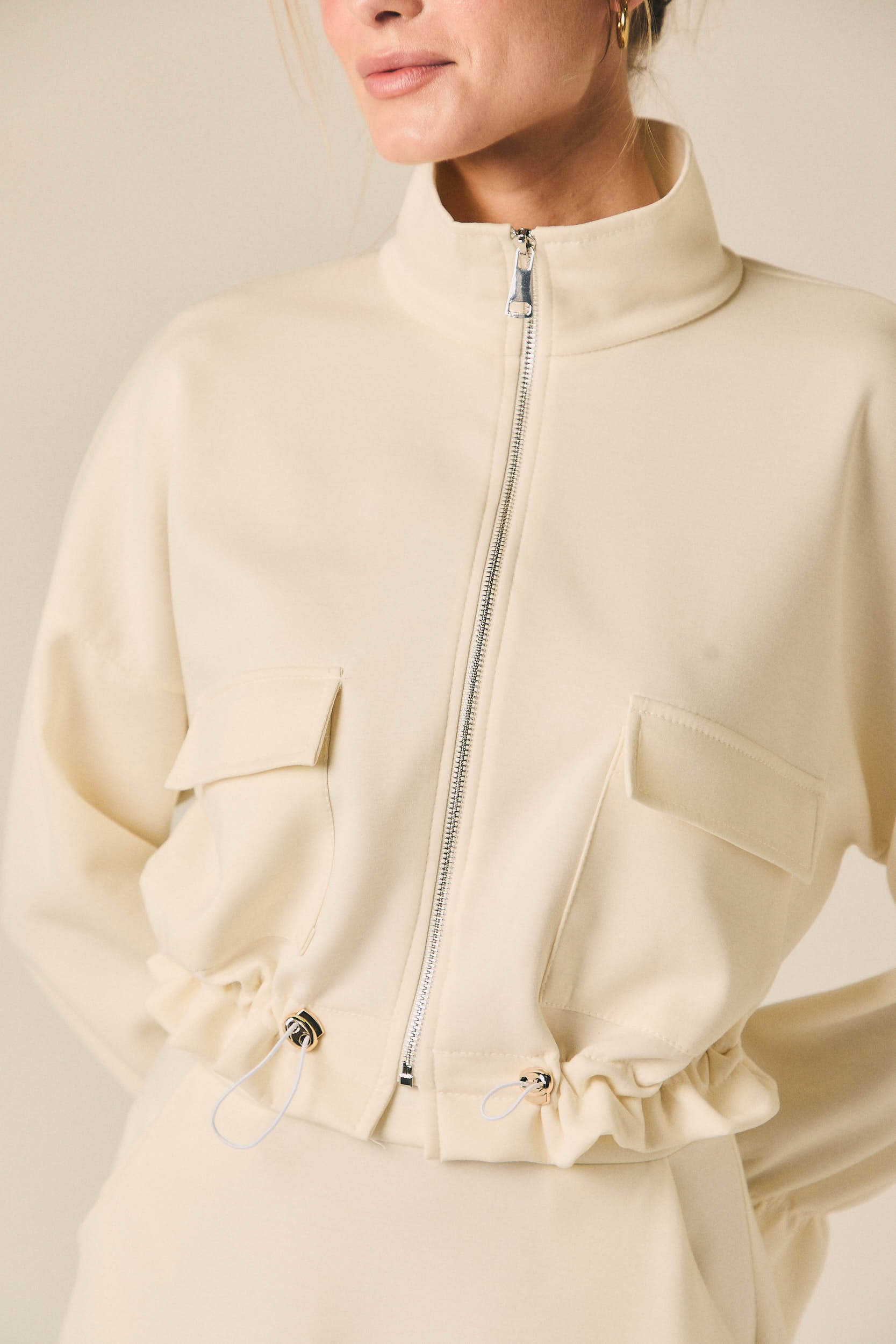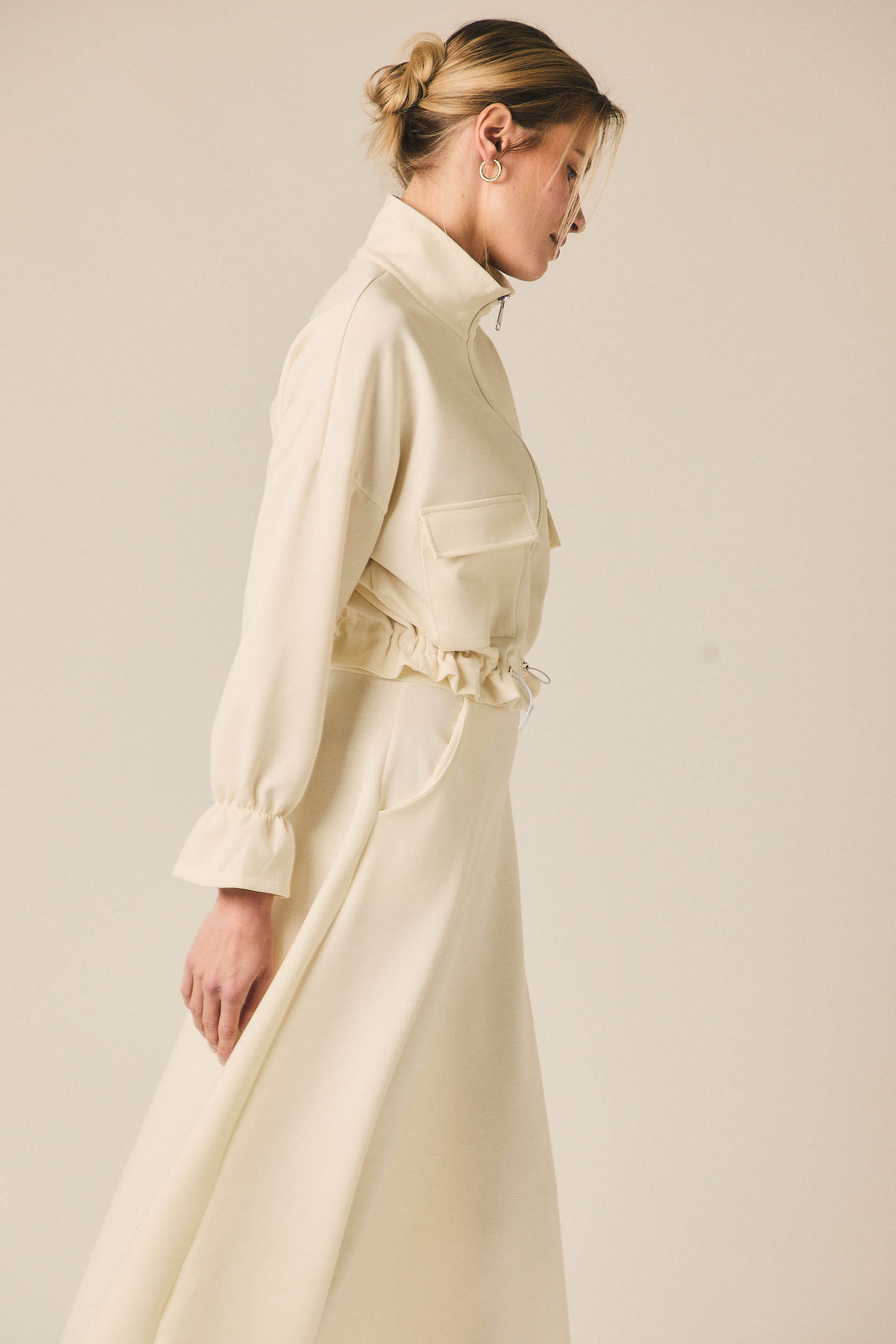 Casaco neopreno bege com corte limpo e estruturado, pensado para desenhar a silhueta com linhas direitas e modernas. O tecido de neopreno confere corpo à peça, mantendo um cair elegante que não marca e permite sobrepor facilmente sobre blusas, camisolas ou vestidos.