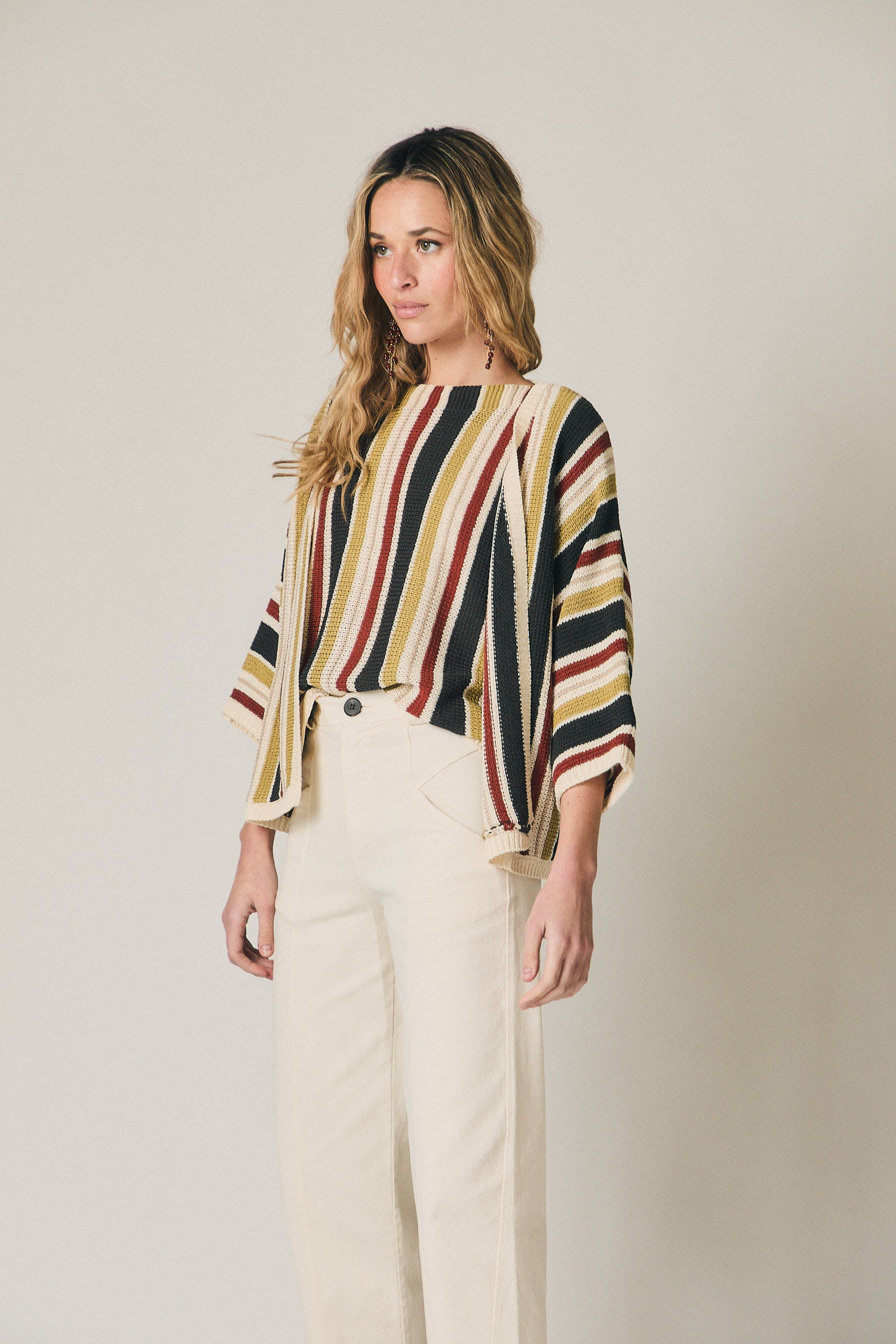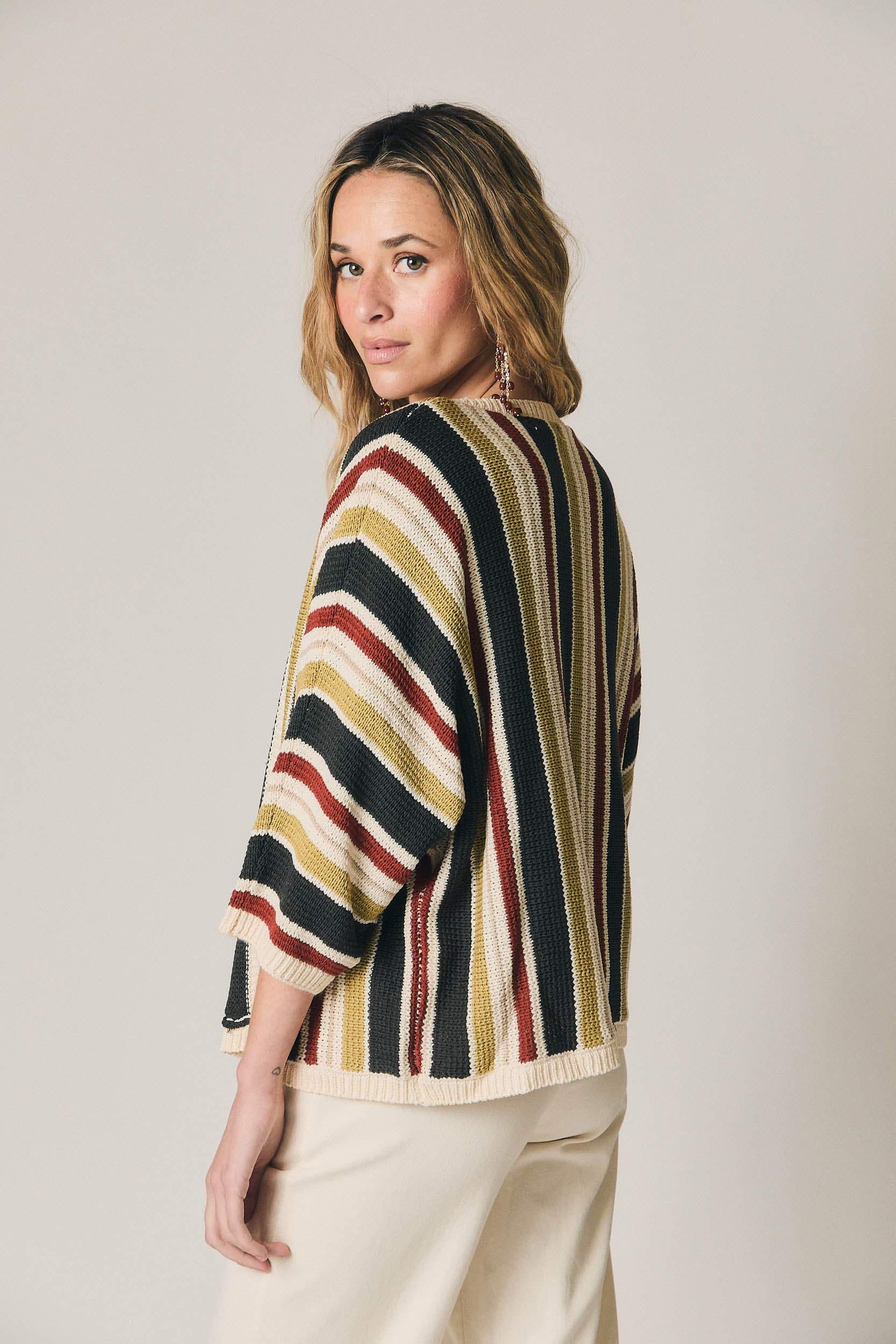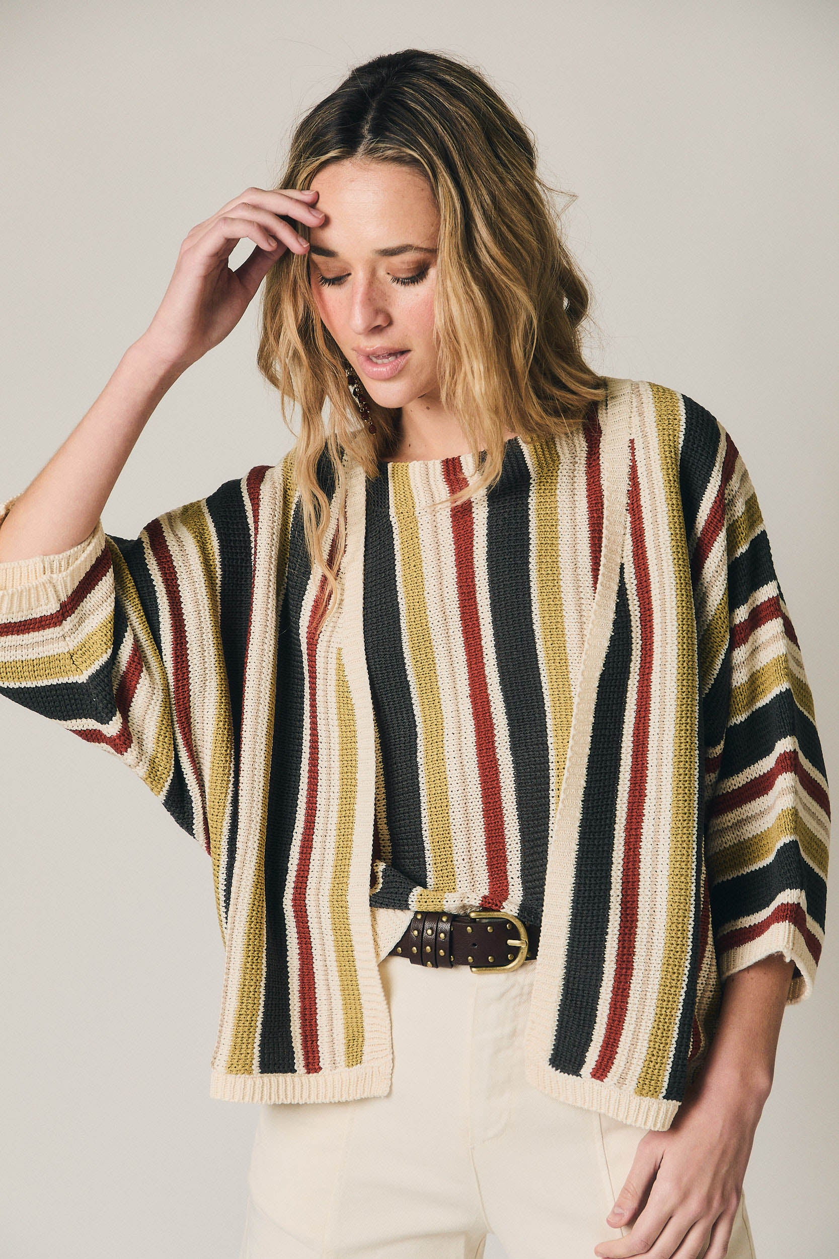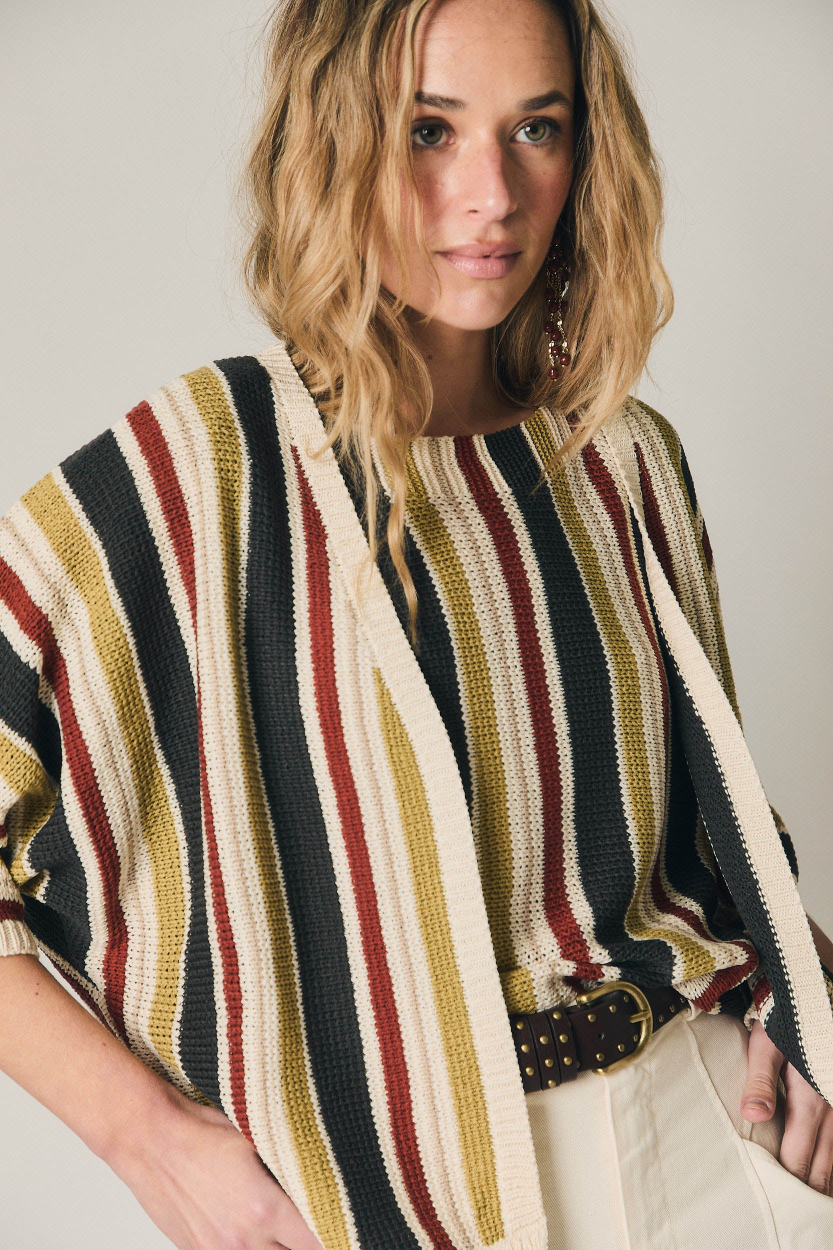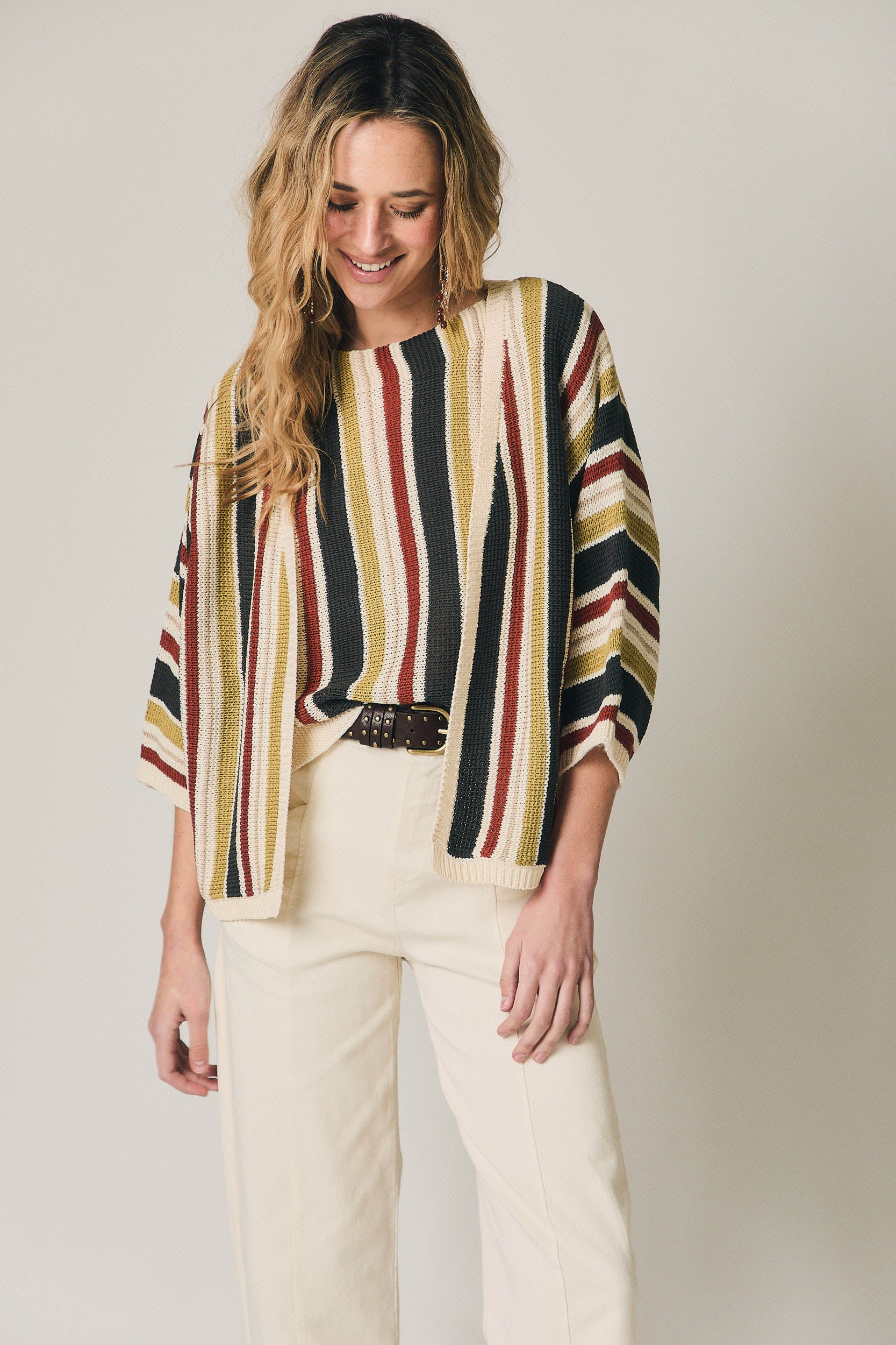 Cardigan de punto con estampado de rayas verticales en tonos verde, crudo y teja. Diseño abierto, sin cierre, con manga amplia tres cuartos y corte recto que aporta una silueta relajada. Los acabados en ribete liso en bajo y mangas estructuran la prenda y equilibran la caída del punto.