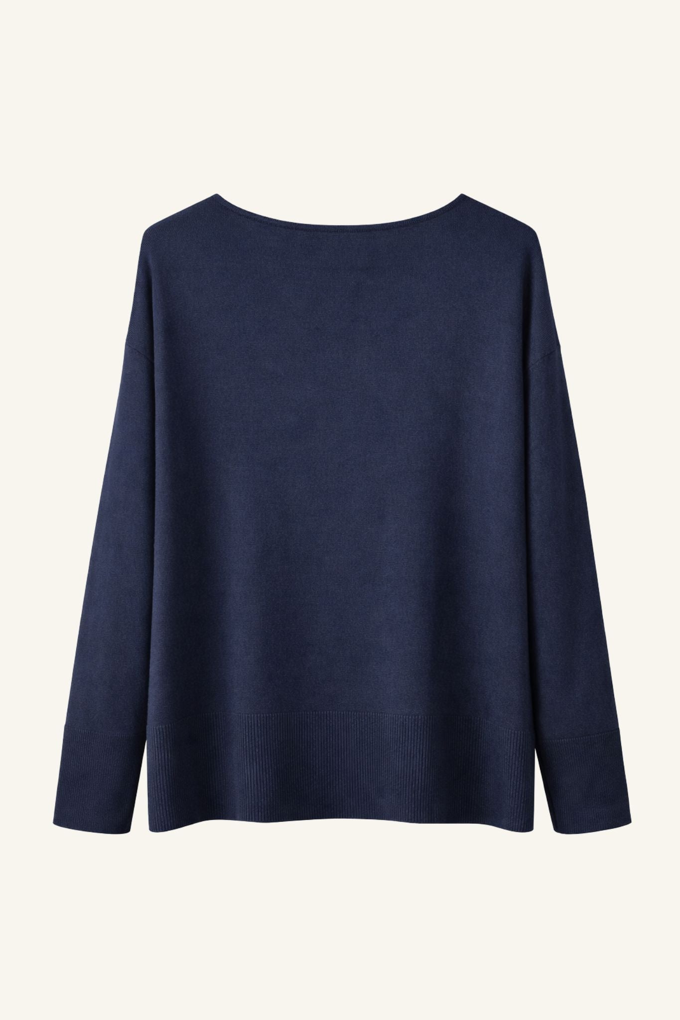 Jersey básico de mujer en color azul marino. Corte recto y ligeramente holgado, con escote en pico y hombro caído que aporta una silueta relajada. Manga larga y acabados acanalados en puños y bajo para un ajuste cómodo y estructurado. Un fondo de armario versátil pensado para el día a día.