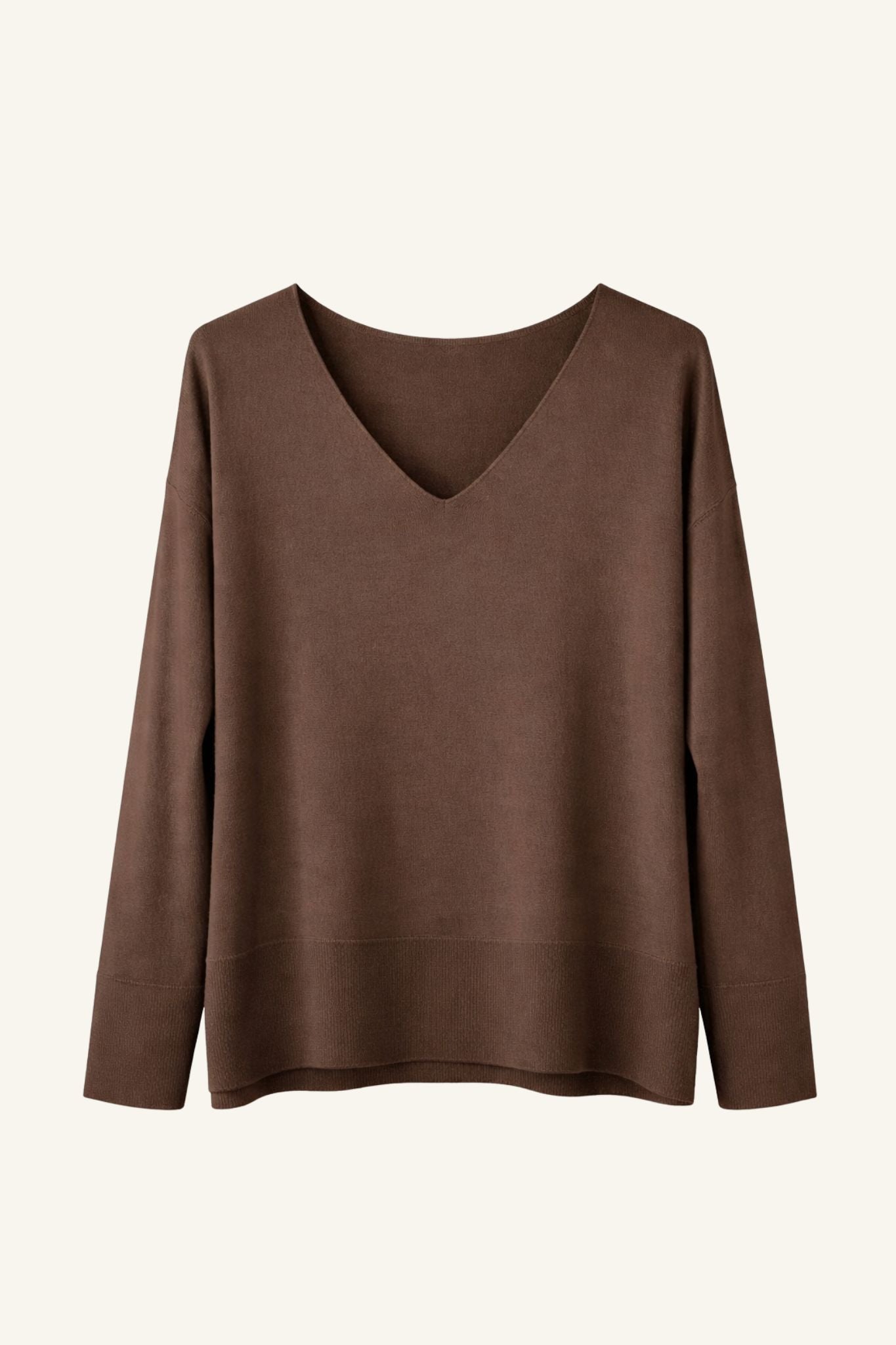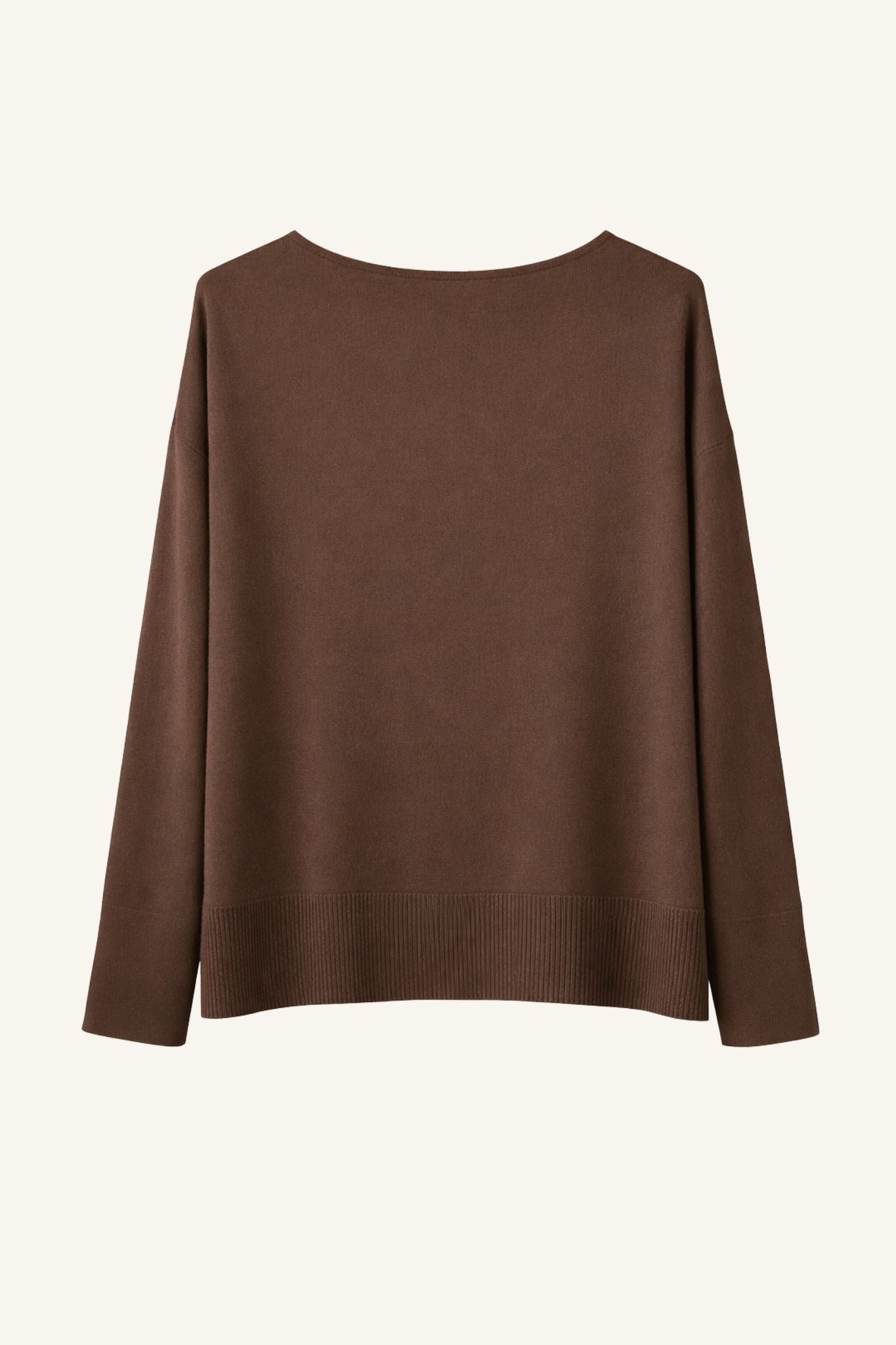 Jersey básico de mujer en color marrón chocolate. Corte recto y ligeramente holgado, con escote en pico y hombro caído que aporta una silueta relajada. Manga larga y acabados acanalados en puños y bajo para un ajuste cómodo y estructurado. Un fondo de armario versátil pensado para el día a día.