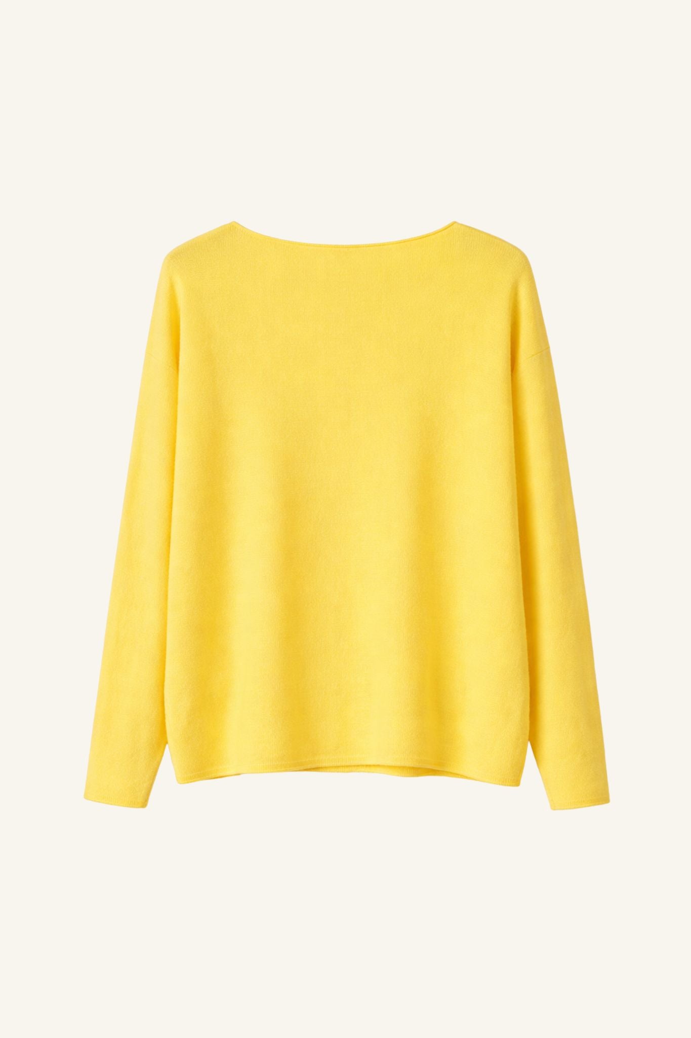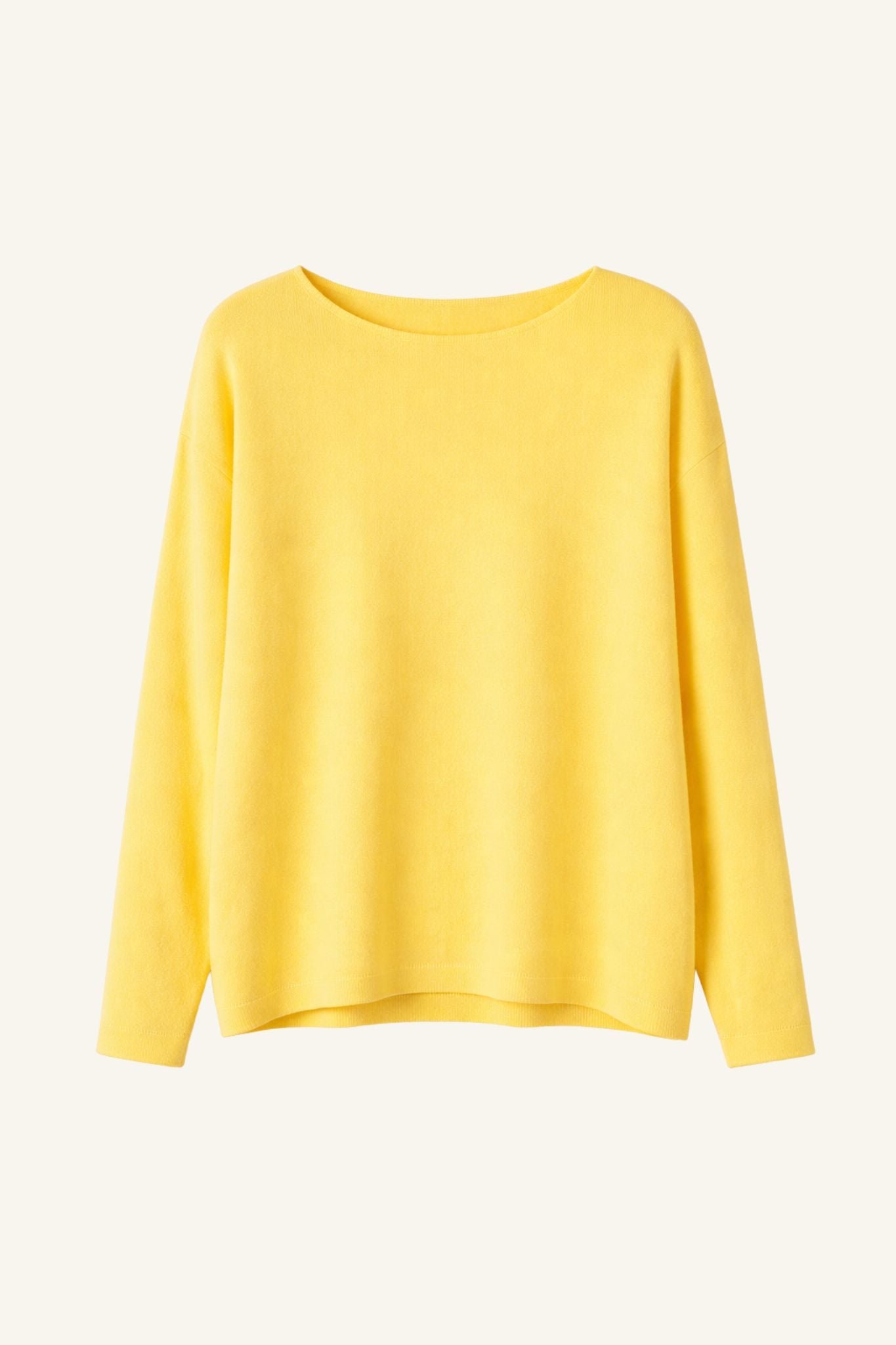 Jersey de punto en tono amarillo, de corte recto y silueta relajada. Presenta cuello redondo amplio y mangas largas ligeramente caídas, con un acabado limpio y sin detalles añadidos que refuerza su carácter atemporal. El bajo recto permite llevarlo suelto o ligeramente metido, adaptándose con facilidad a distintos looks.