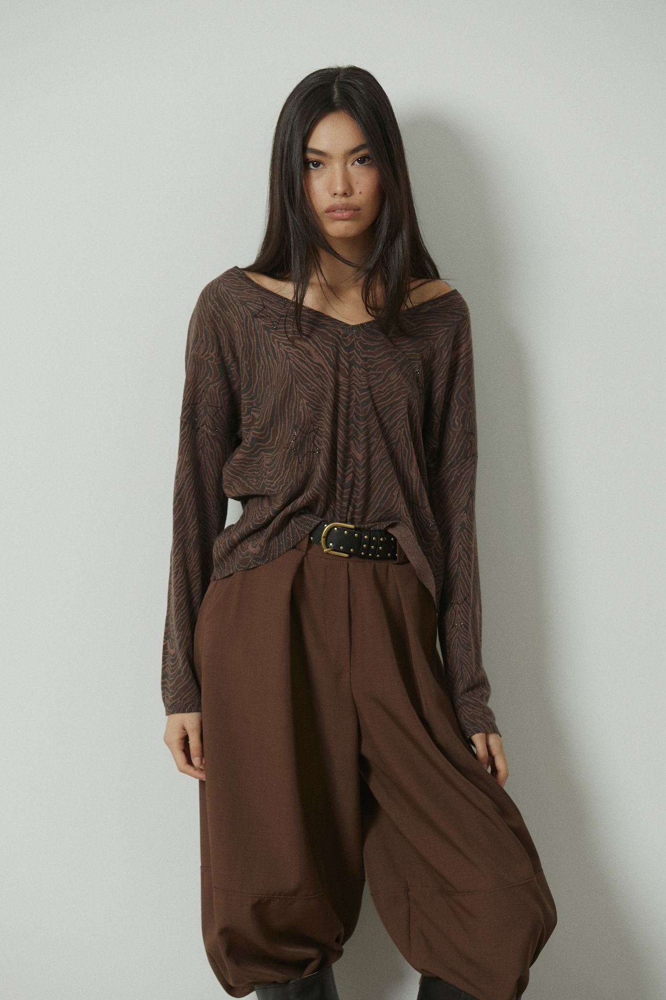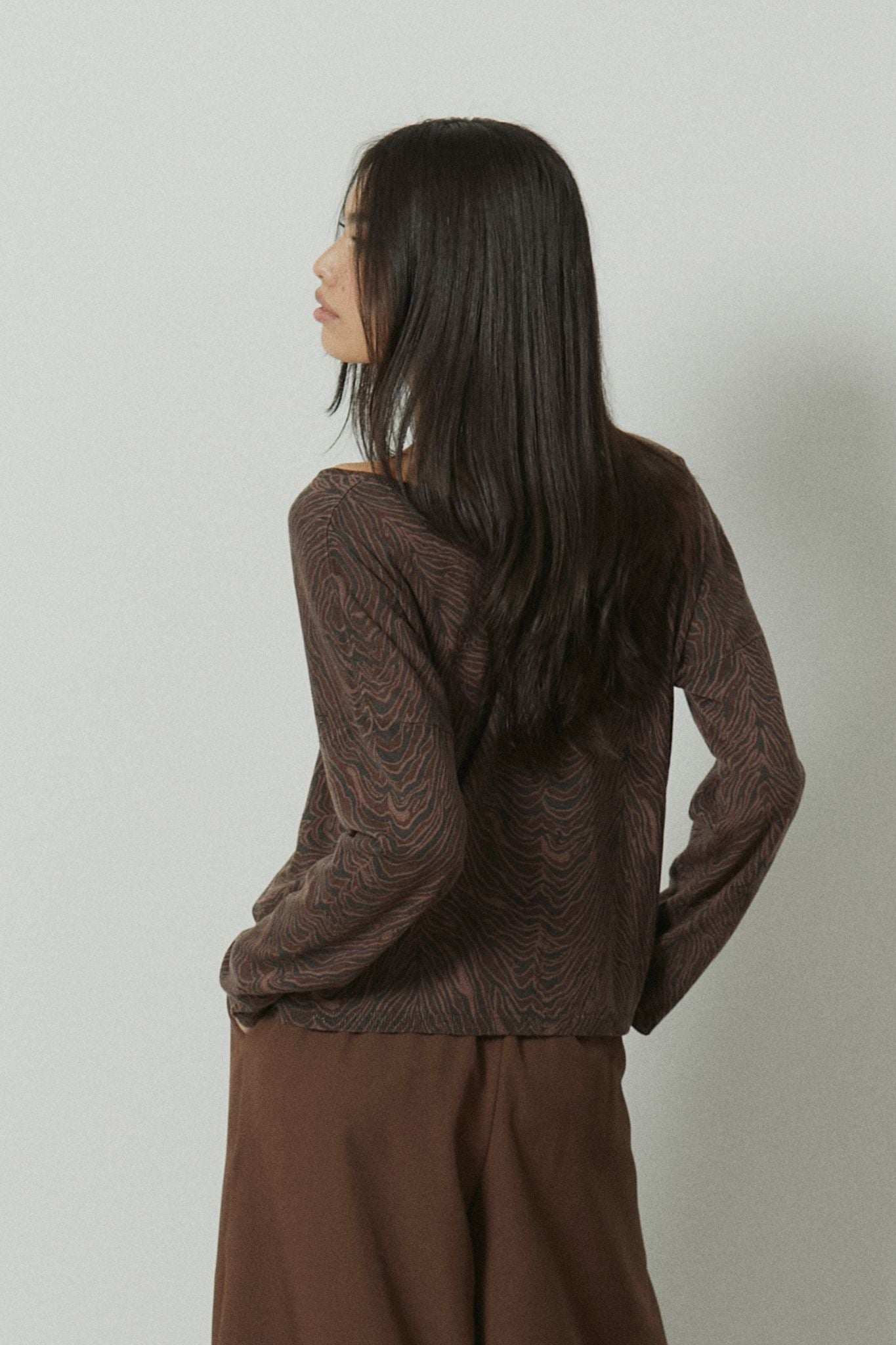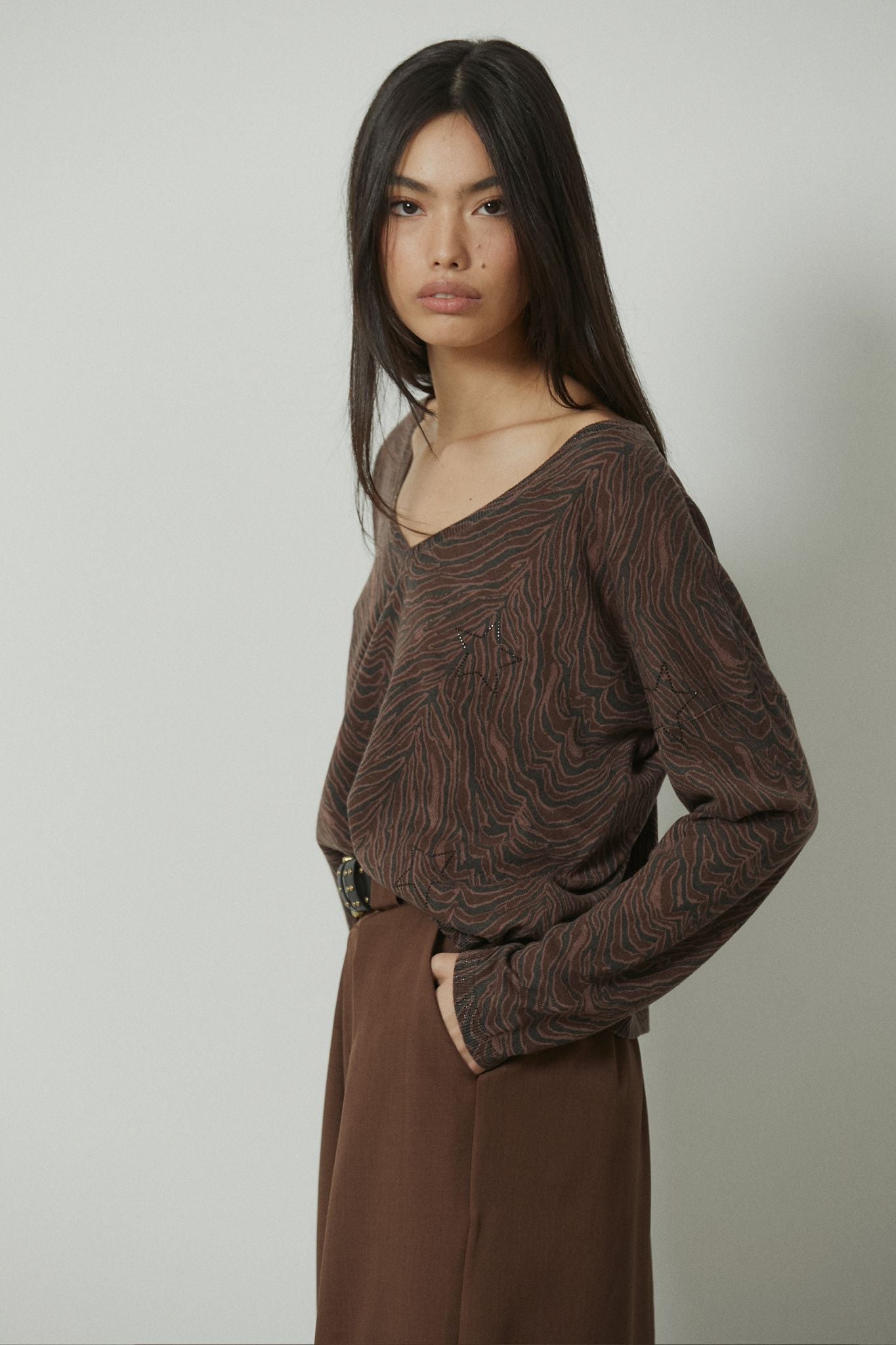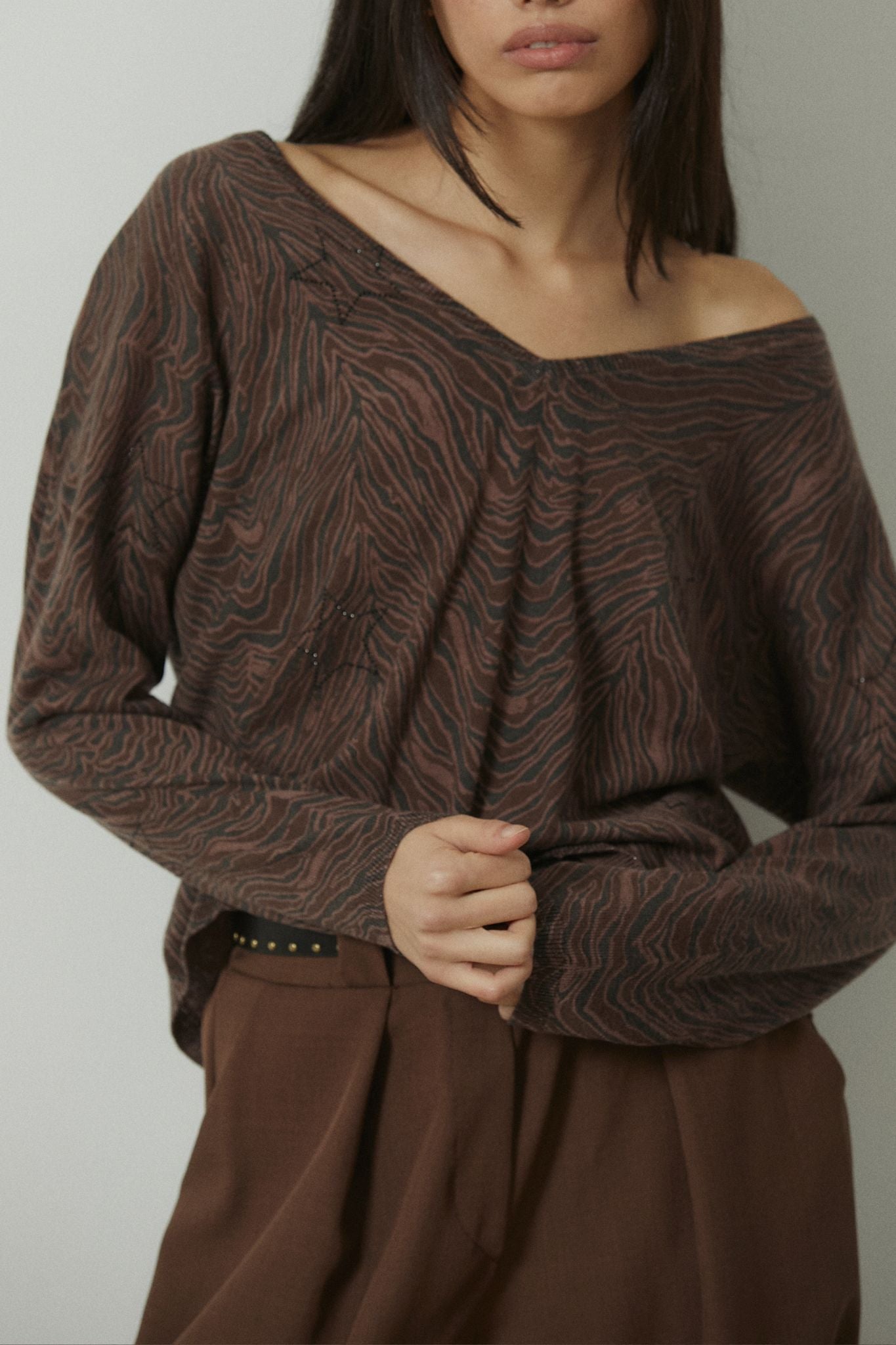 Jersey de punto fino en tono marrón con estampado animal de líneas orgánicas. Escote amplio ligeramente barco, que puede llevarse recto o sutilmente caído, y manga larga con caída fluida. Silueta relajada, pensada para aportar movimiento y un aire desenfadado al look.