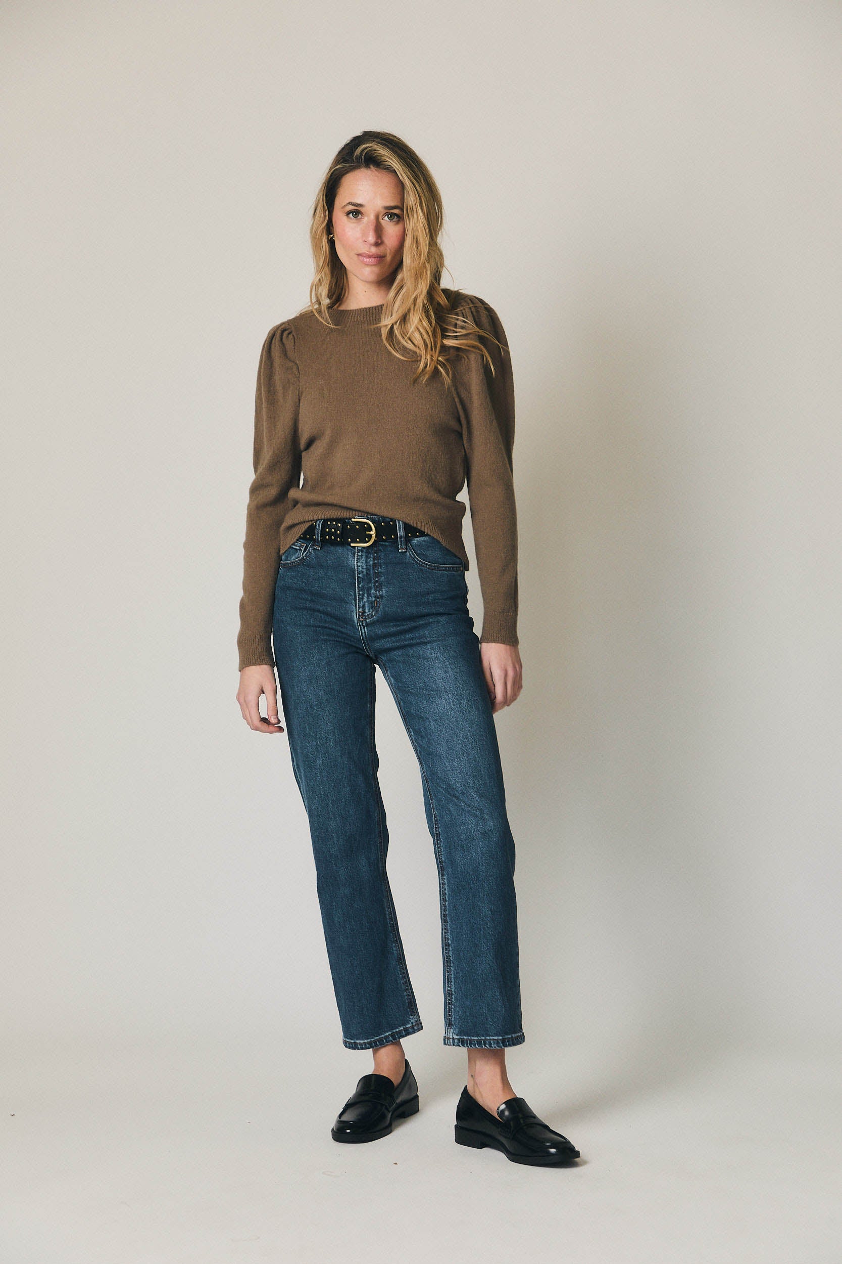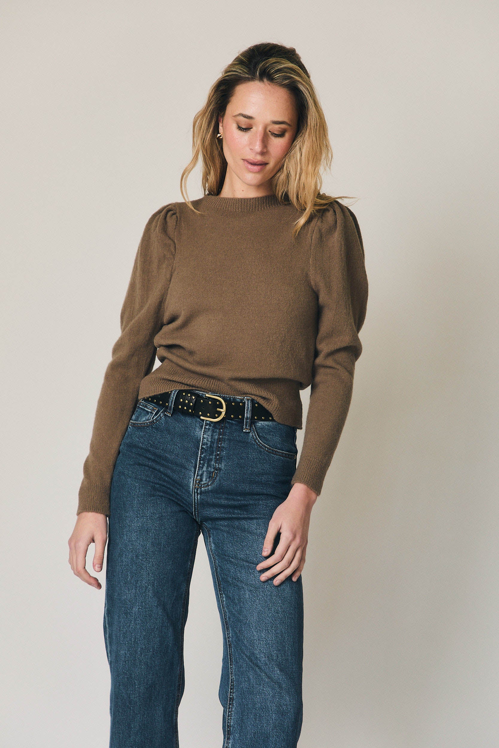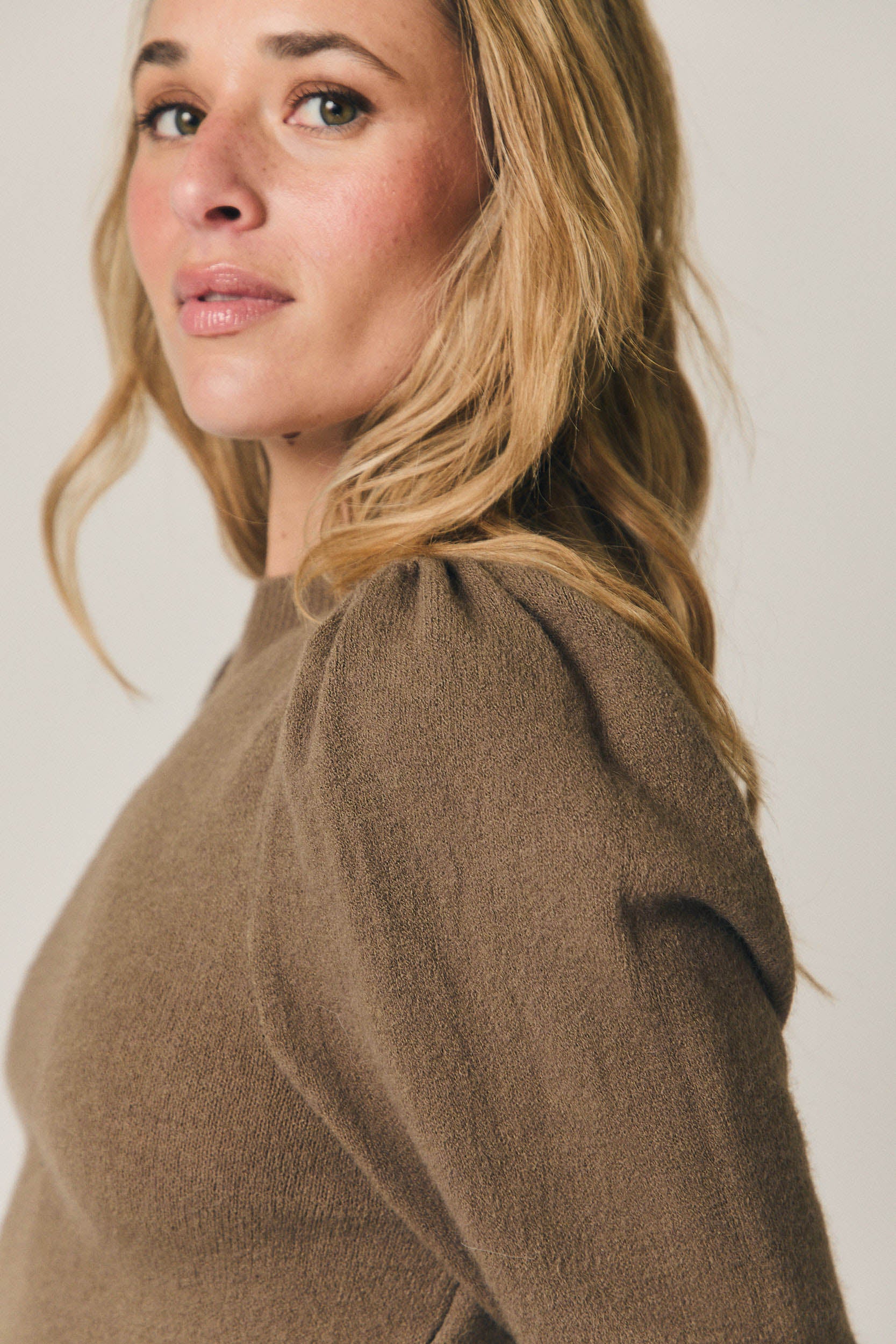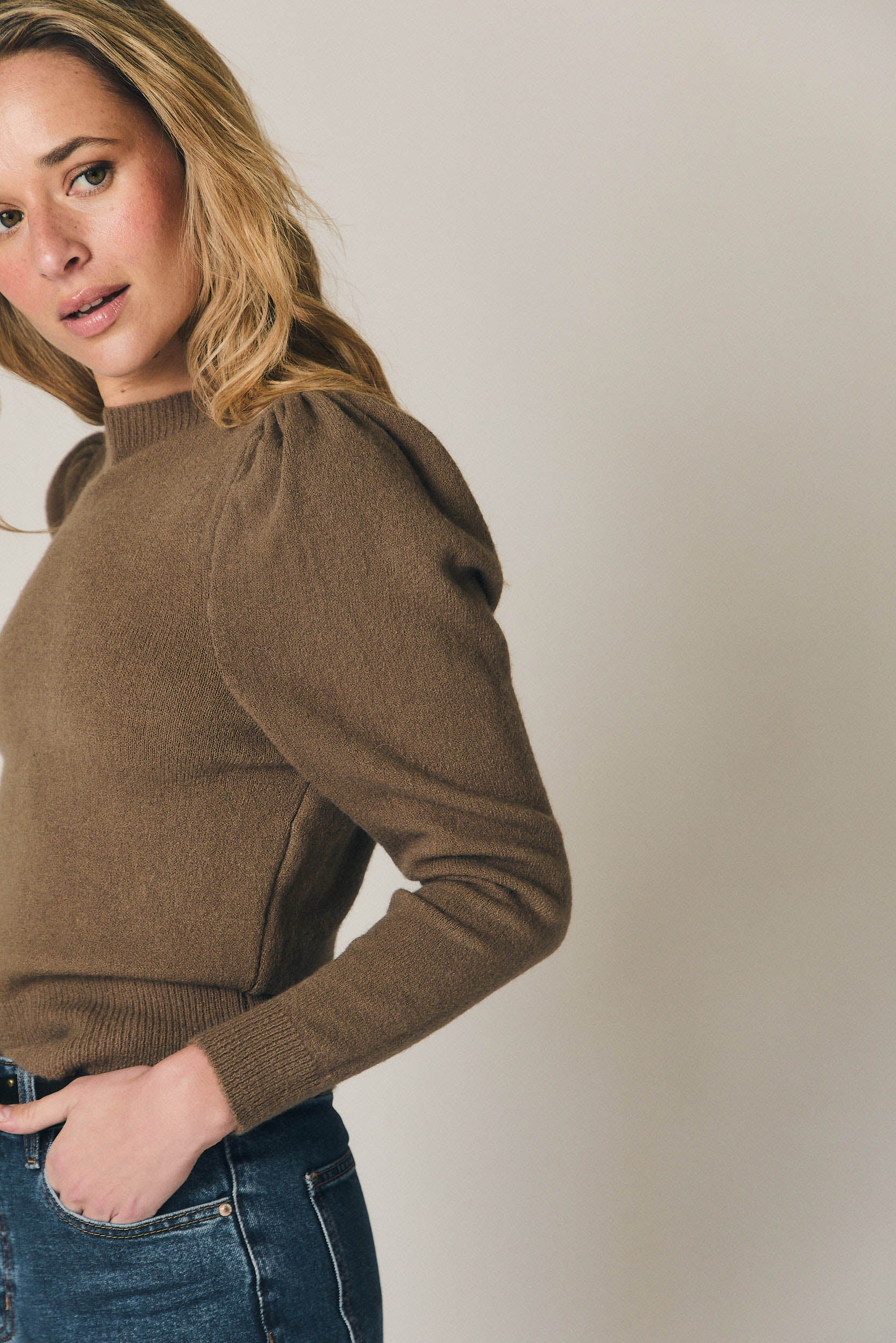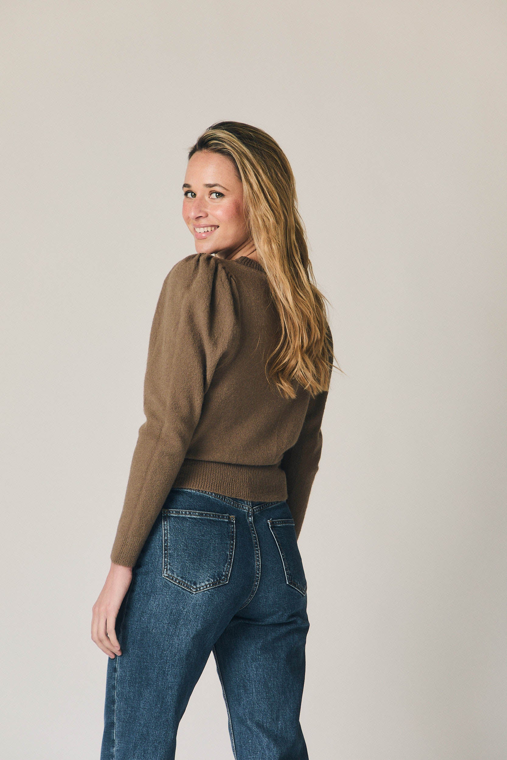 Jersey de punto en color topo con cuello redondo y manga larga tipo farol. Diseño ajustado en el cuerpo con volumen sutil en hombros y mangas, equilibrado por los acabados elásticos en puños y bajo. Una prenda cómoda y favorecedora, pensada para el entretiempo y los primeros looks de primavera.