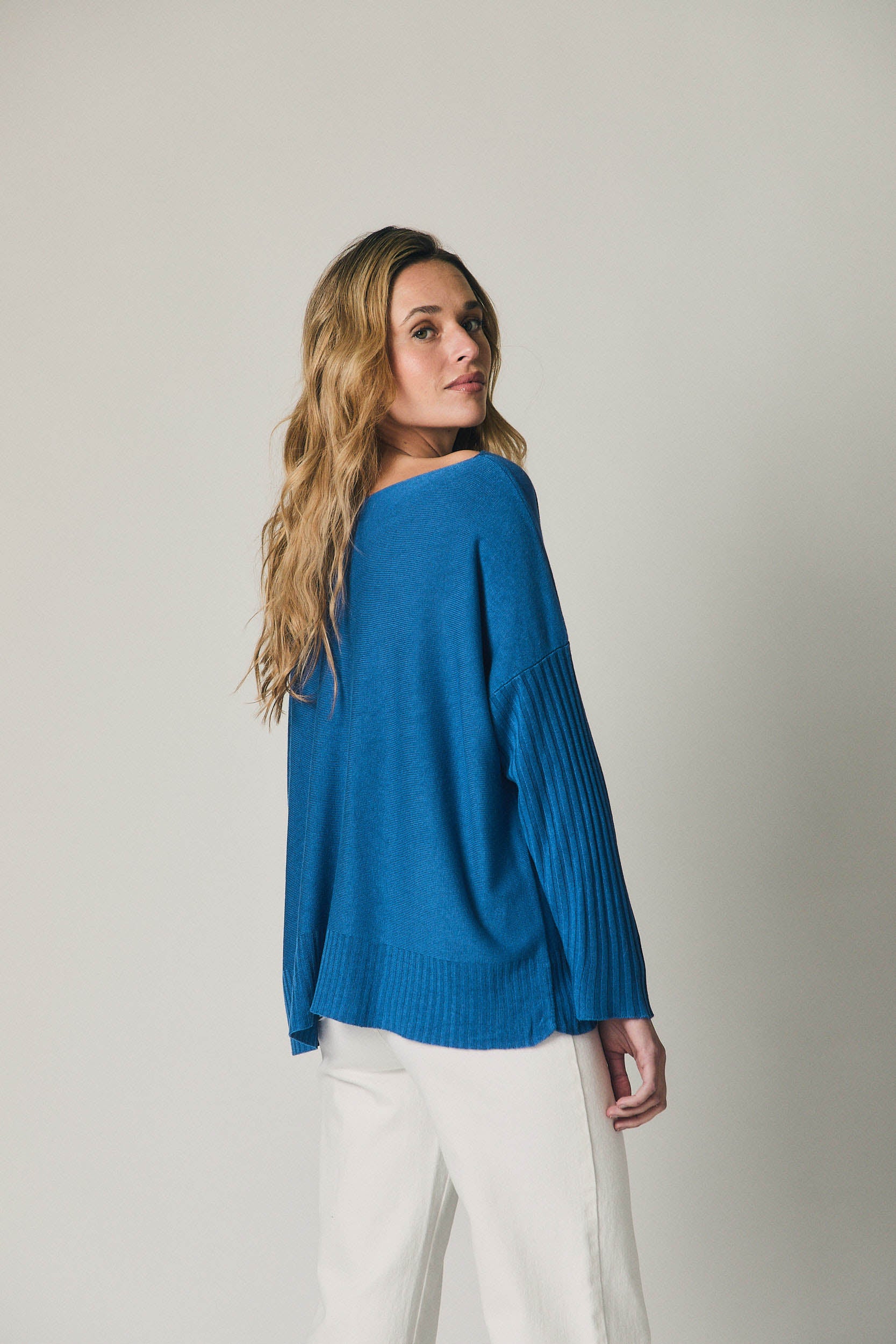 Jersey de punto fino en tono azul eléctrico, con cuello redondo y manga larga. El diseño combina un cuerpo de textura lisa con mangas en canalé, aportando un sutil contraste y un acabado más cuidado. Corte recto y silueta relajada, pensada para un ajuste cómodo y favorecedor.