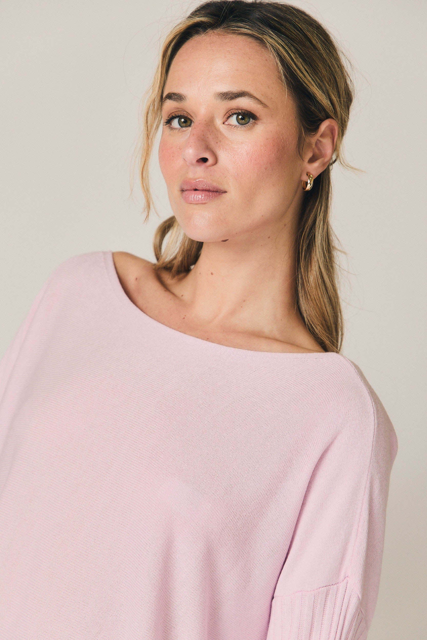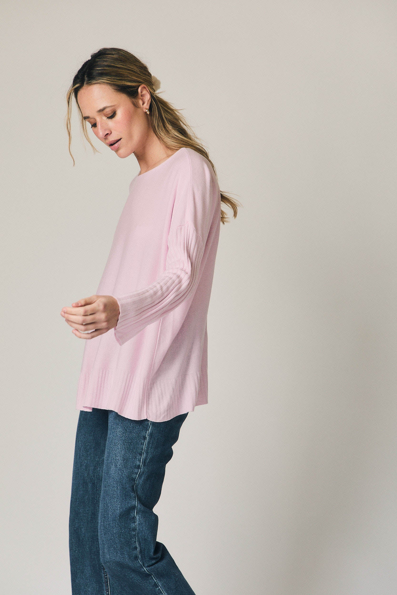 Jersey de punto fino en tono rosa pastel, con cuello redondo y manga larga. El diseño combina un cuerpo de textura lisa con mangas en canalé, aportando un sutil contraste y un acabado más cuidado. Corte recto y silueta relajada, pensada para un ajuste cómodo y favorecedor.