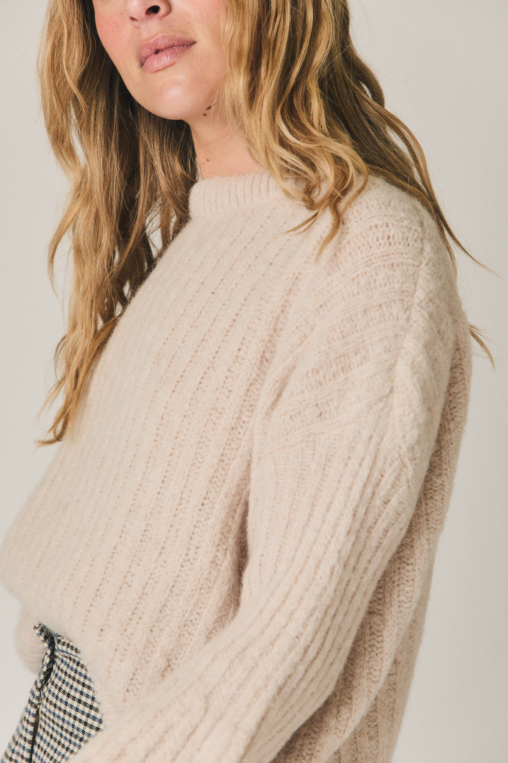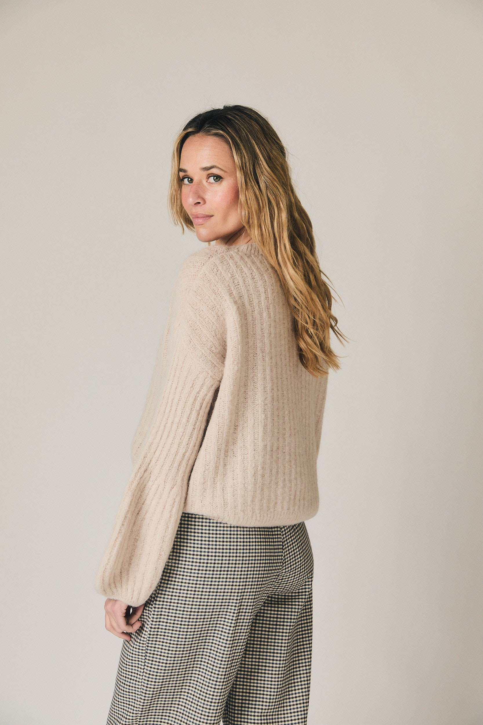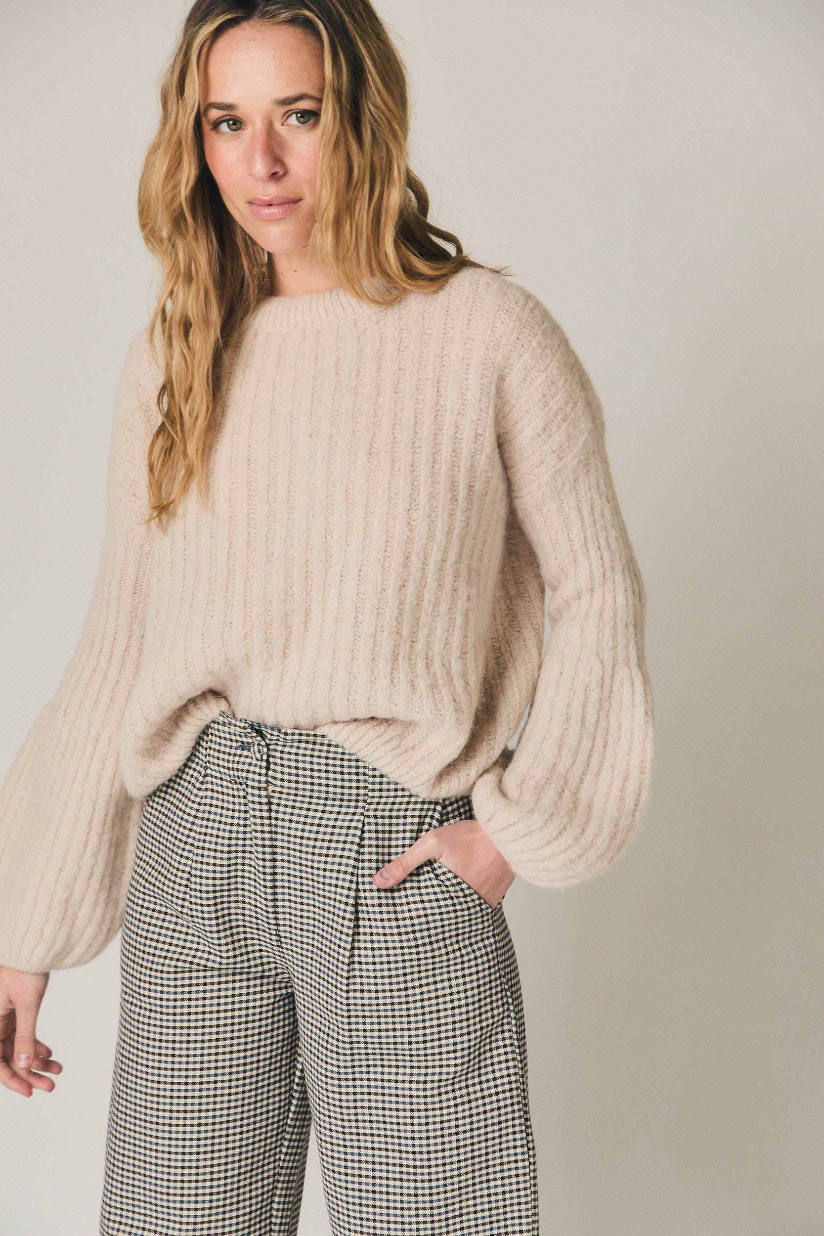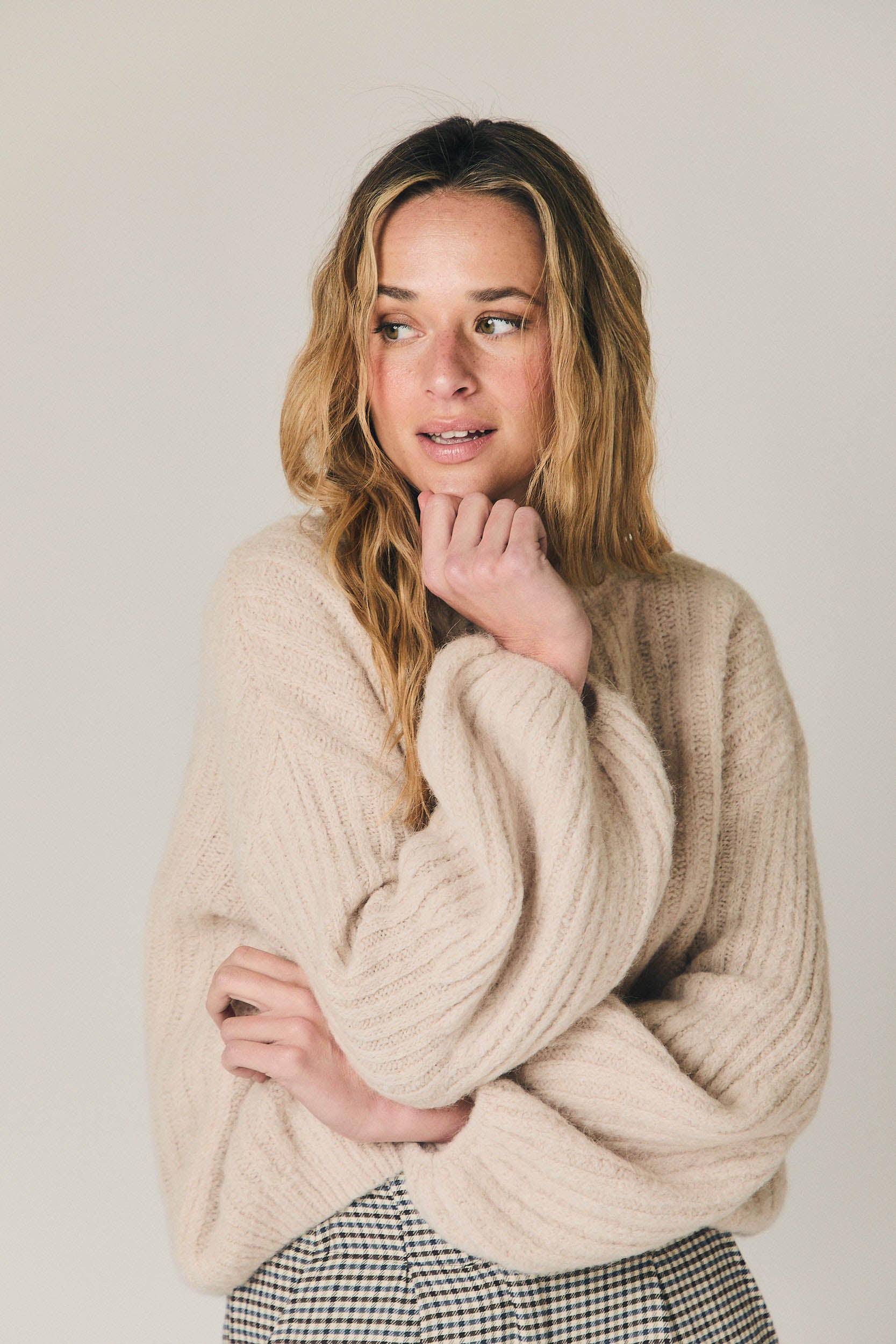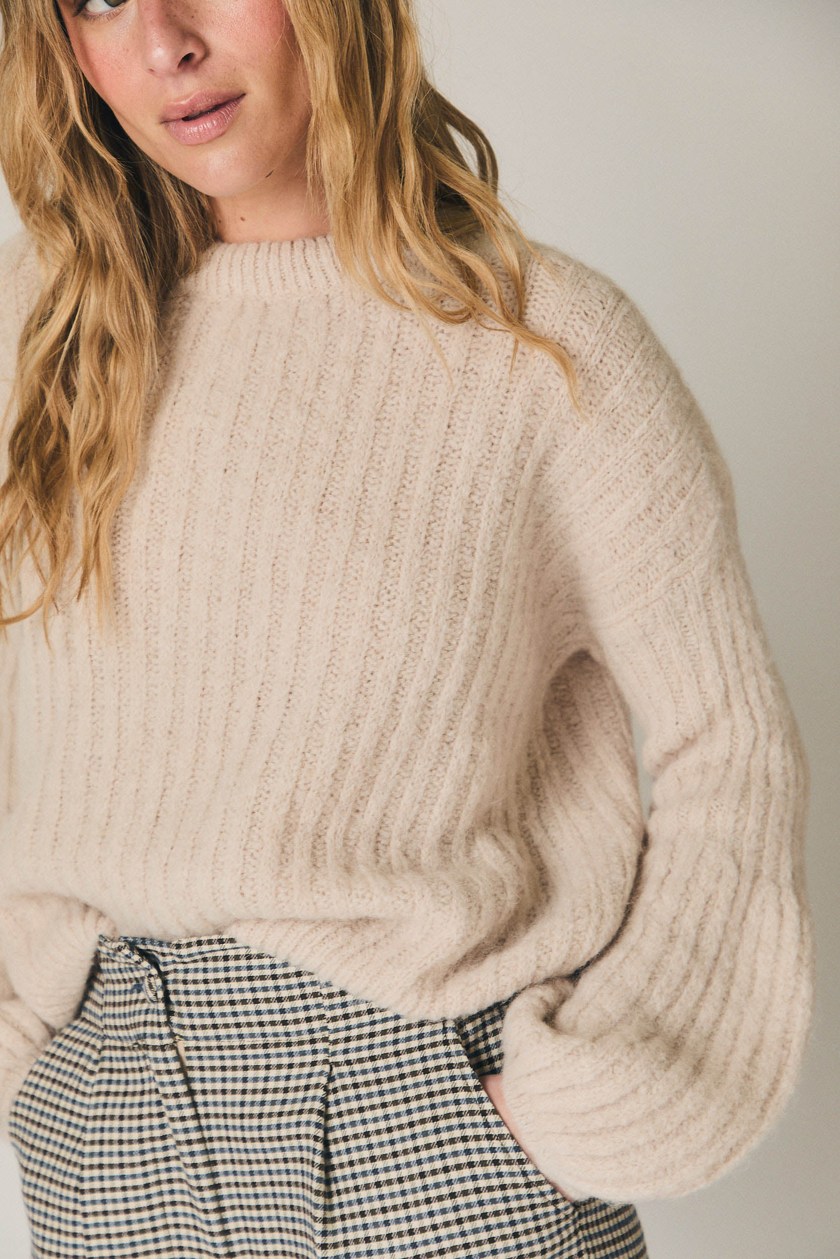 Jersey de punto con alpaca y lana en tono beige con cuello redondo y manga larga tipo globo. Destaca por su textura en canalé y el volumen de las mangas, que aportan un toque especial al diseño sin perder equilibrio. Corte ligeramente cropped y silueta relajada, pensada para un ajuste cómodo y favorecedor.