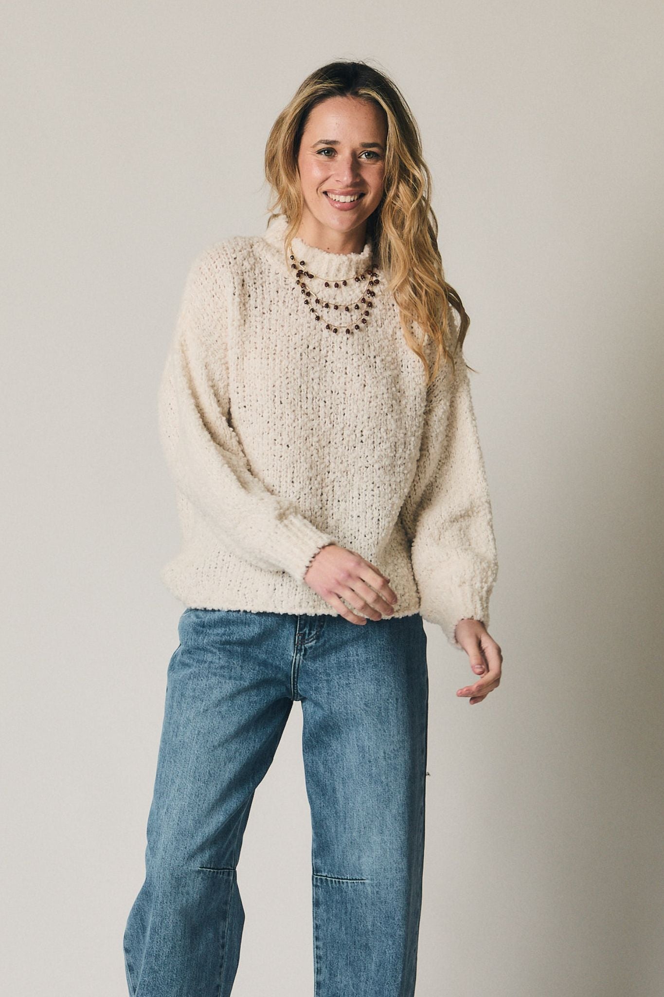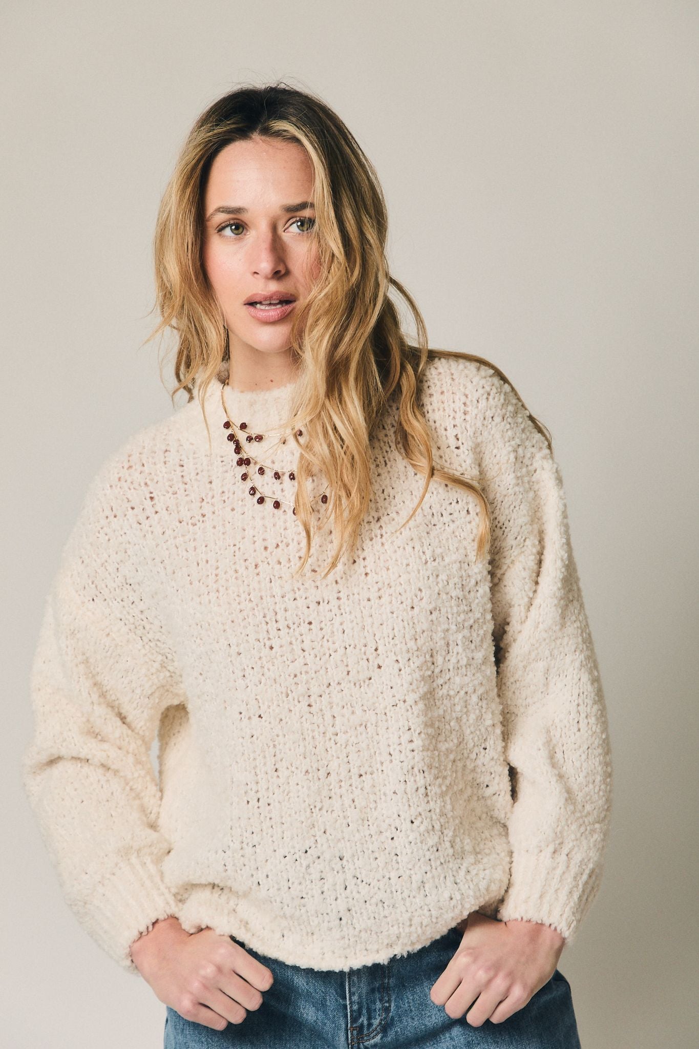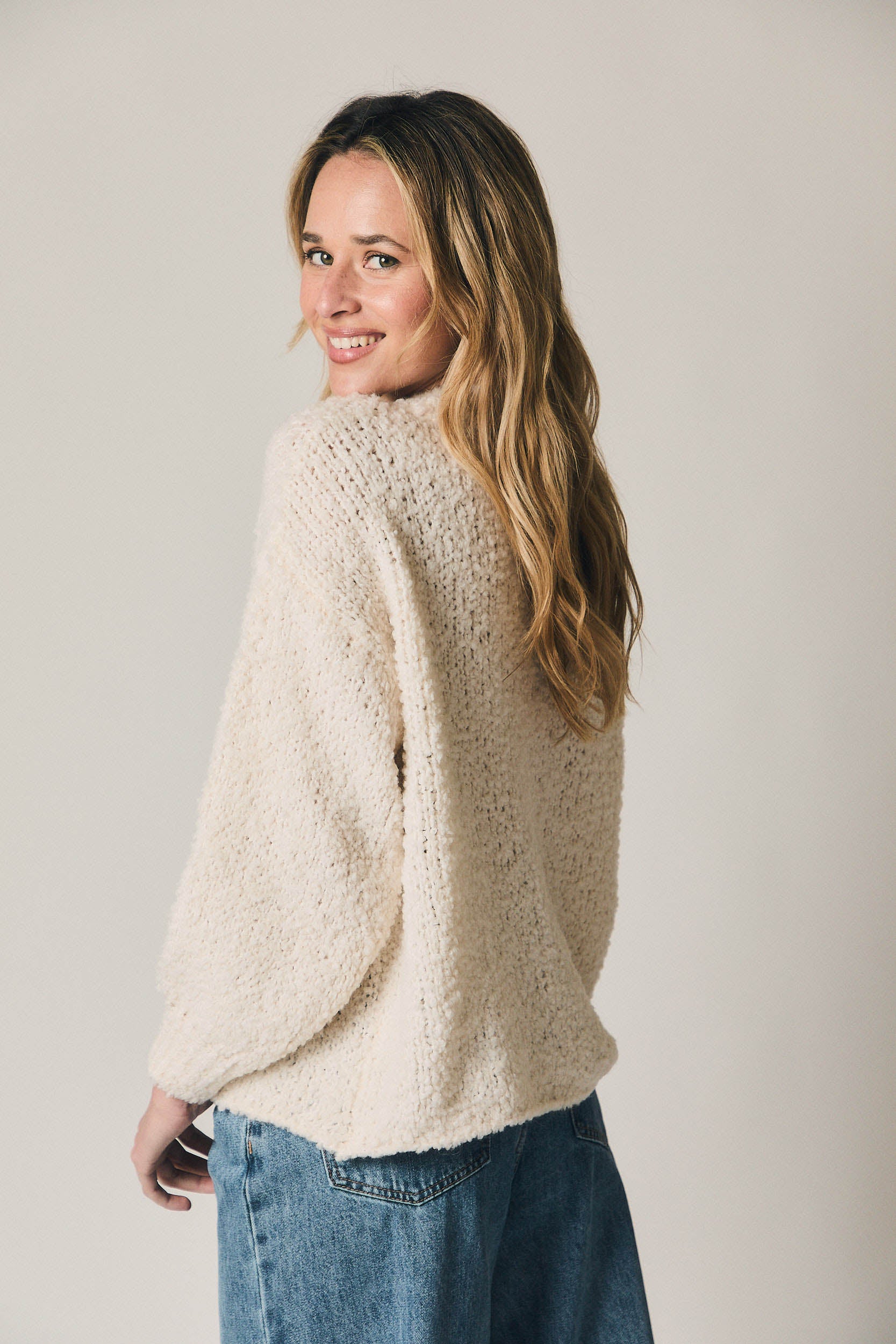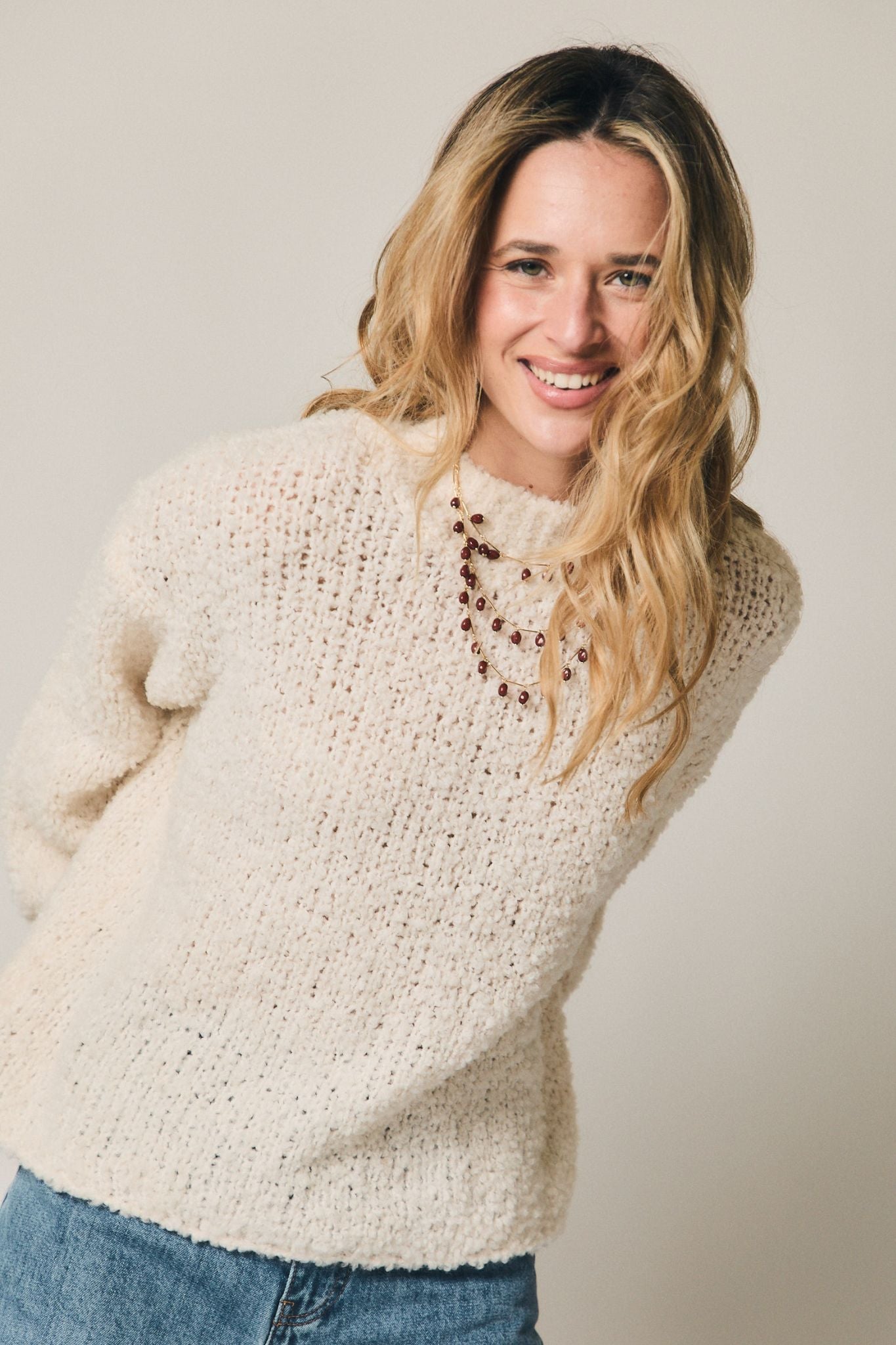 Jersey de punto rizo en color crudo. Silueta recta y relajada, con cuello ligeramente subido y manga larga amplia. Textura suave y envolvente, con acabados sencillos en cuello, puños y bajo que mantienen la forma sin restar fluidez al diseño.