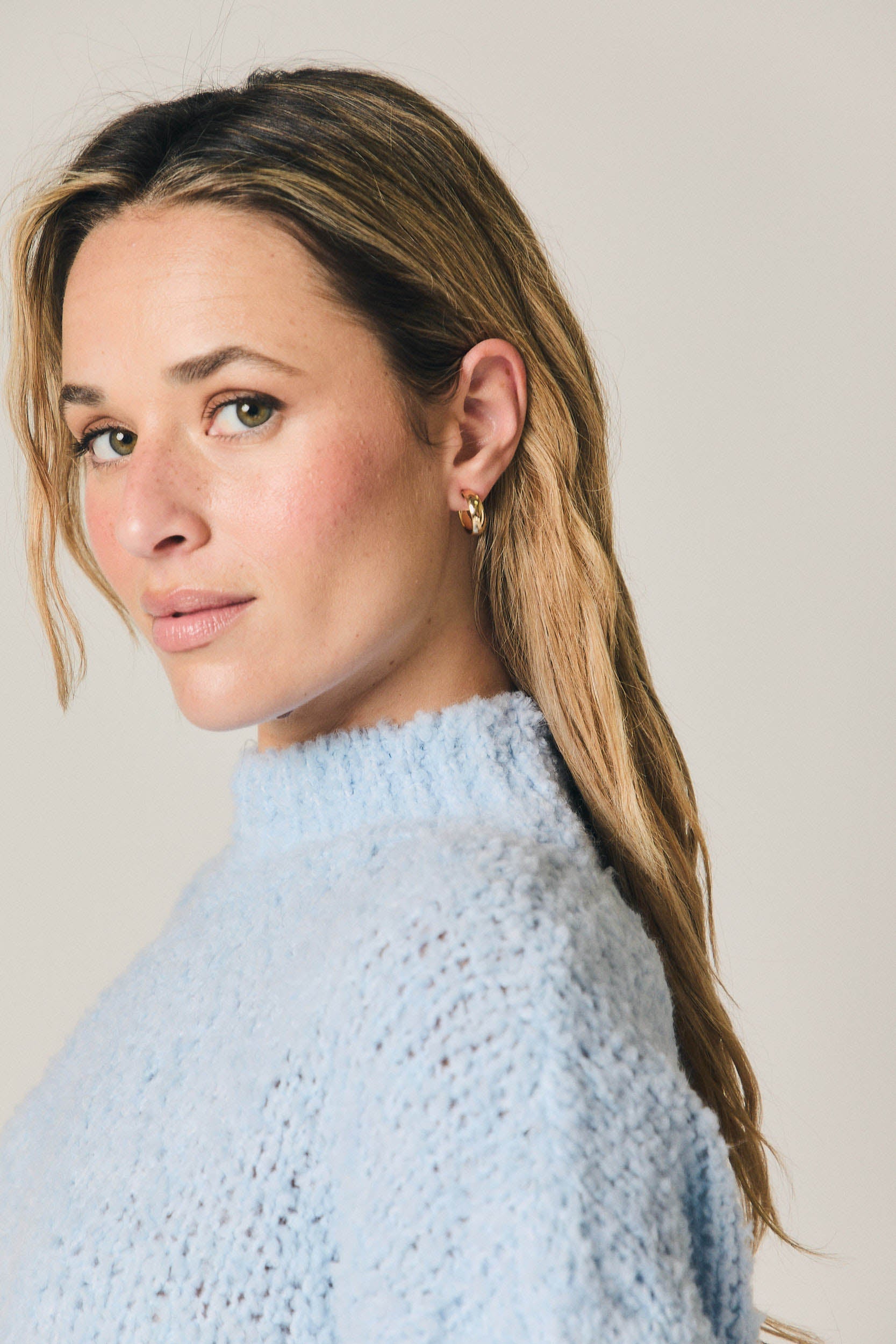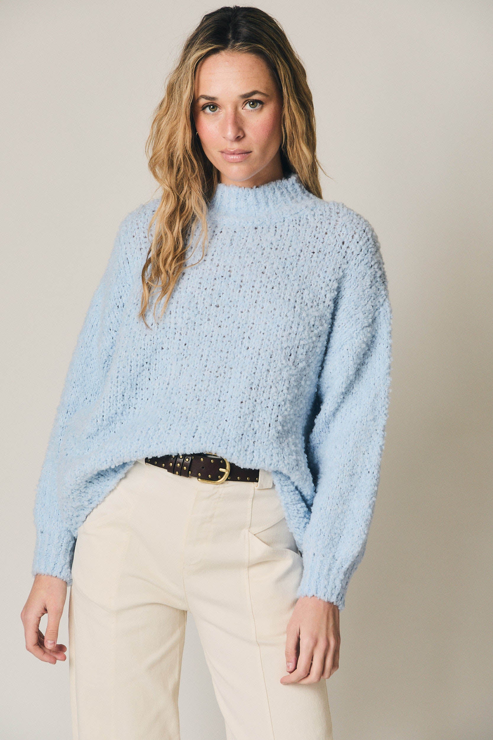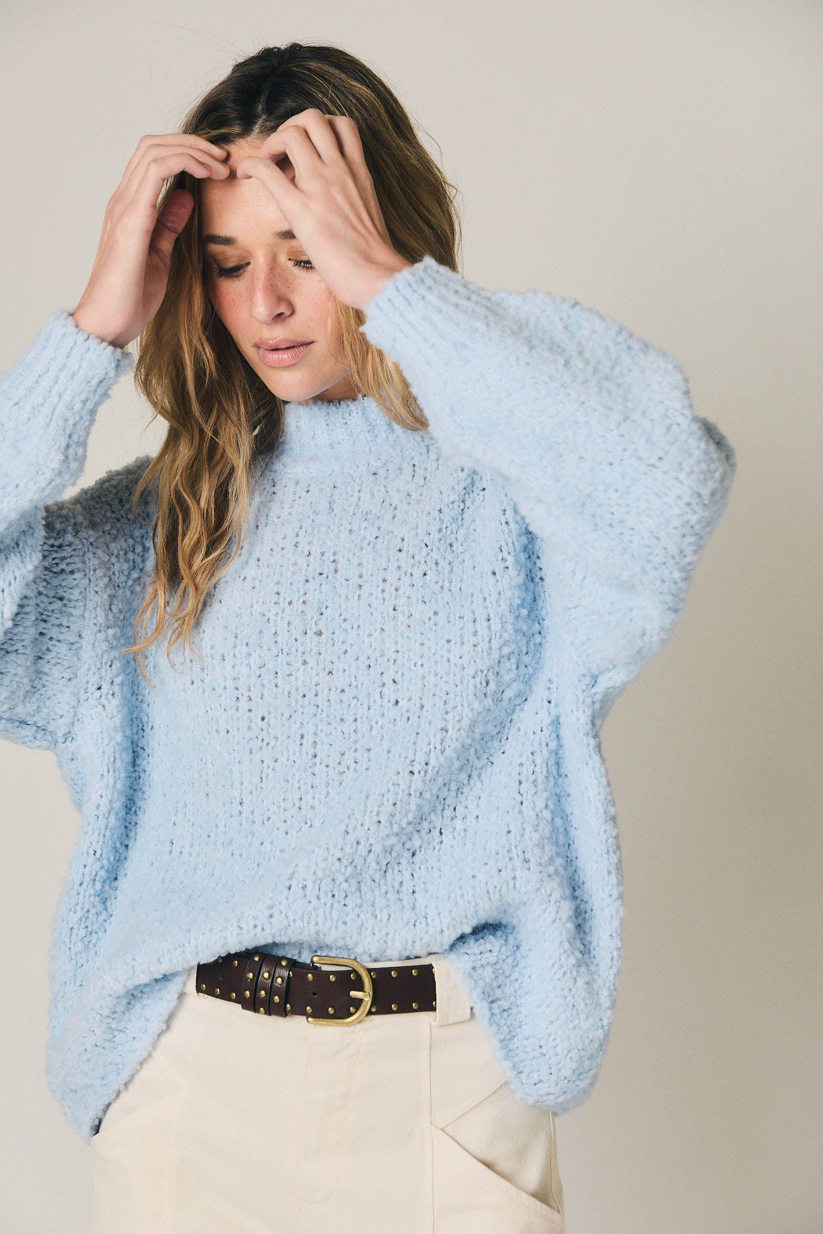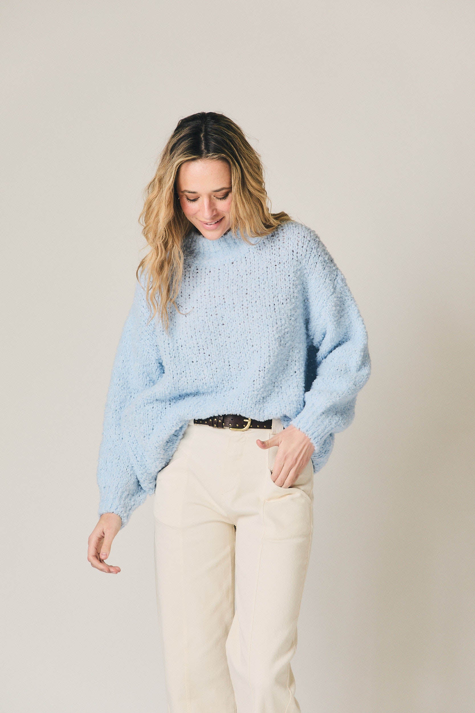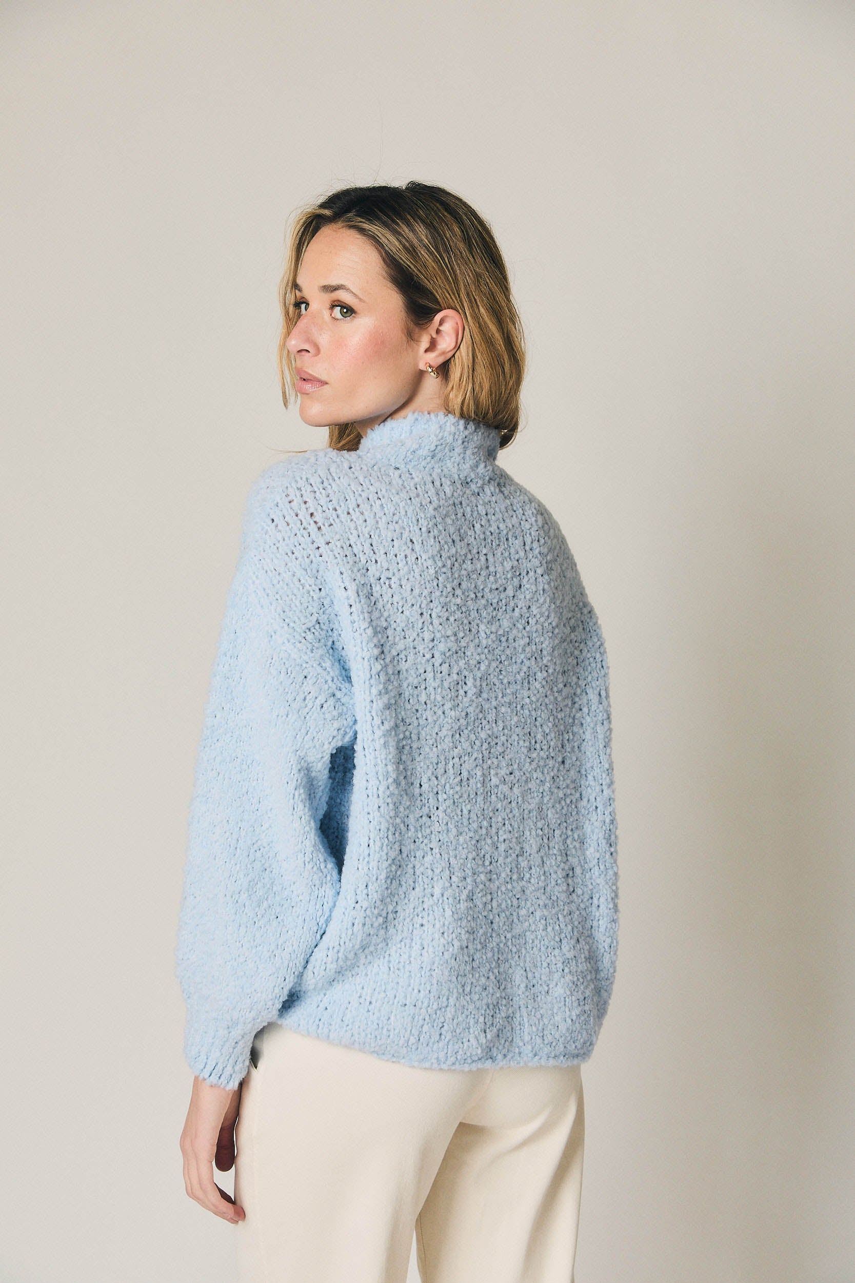 Jersey de punto rizo en color celeste. Silueta recta y relajada, con cuello ligeramente subido y manga larga amplia. Textura suave y envolvente, con acabados sencillos en cuello, puños y bajo que mantienen la forma sin restar fluidez al diseño.
