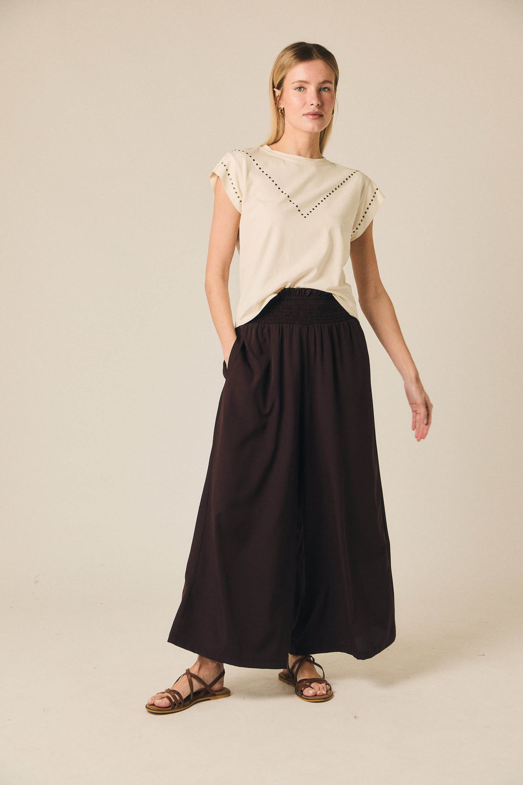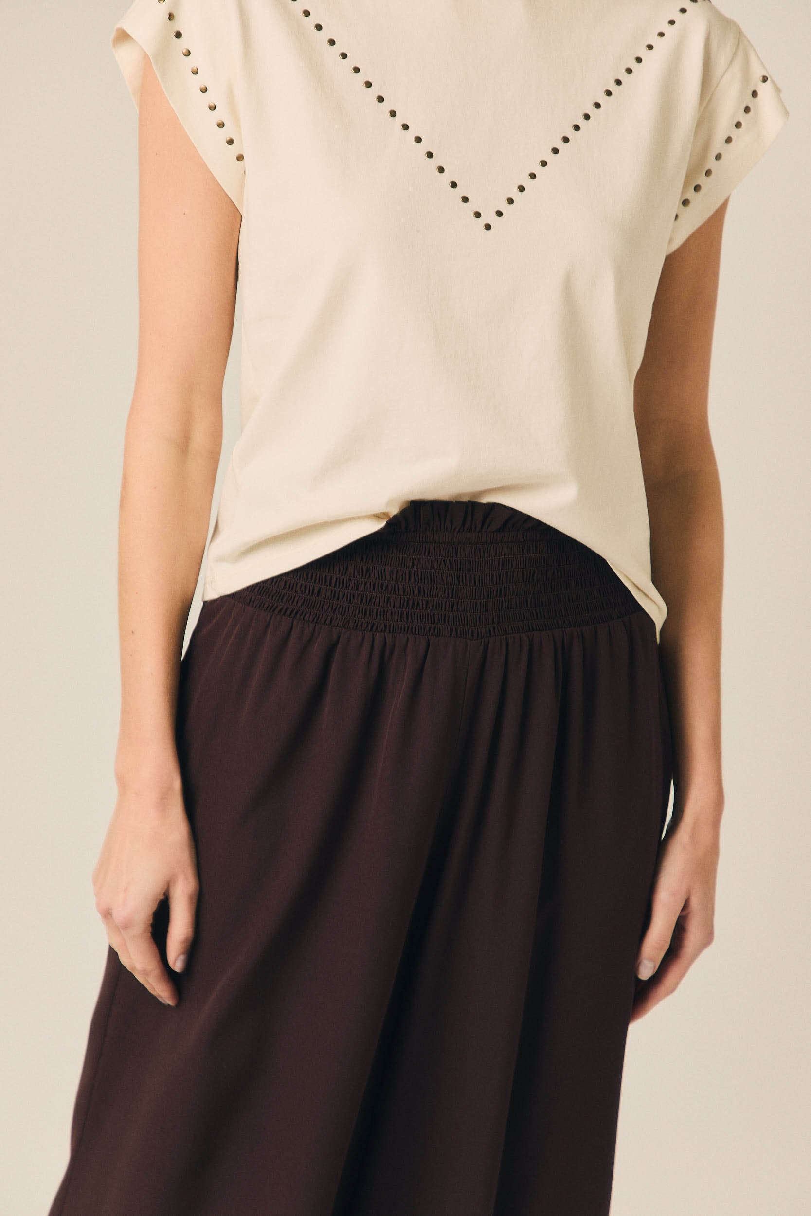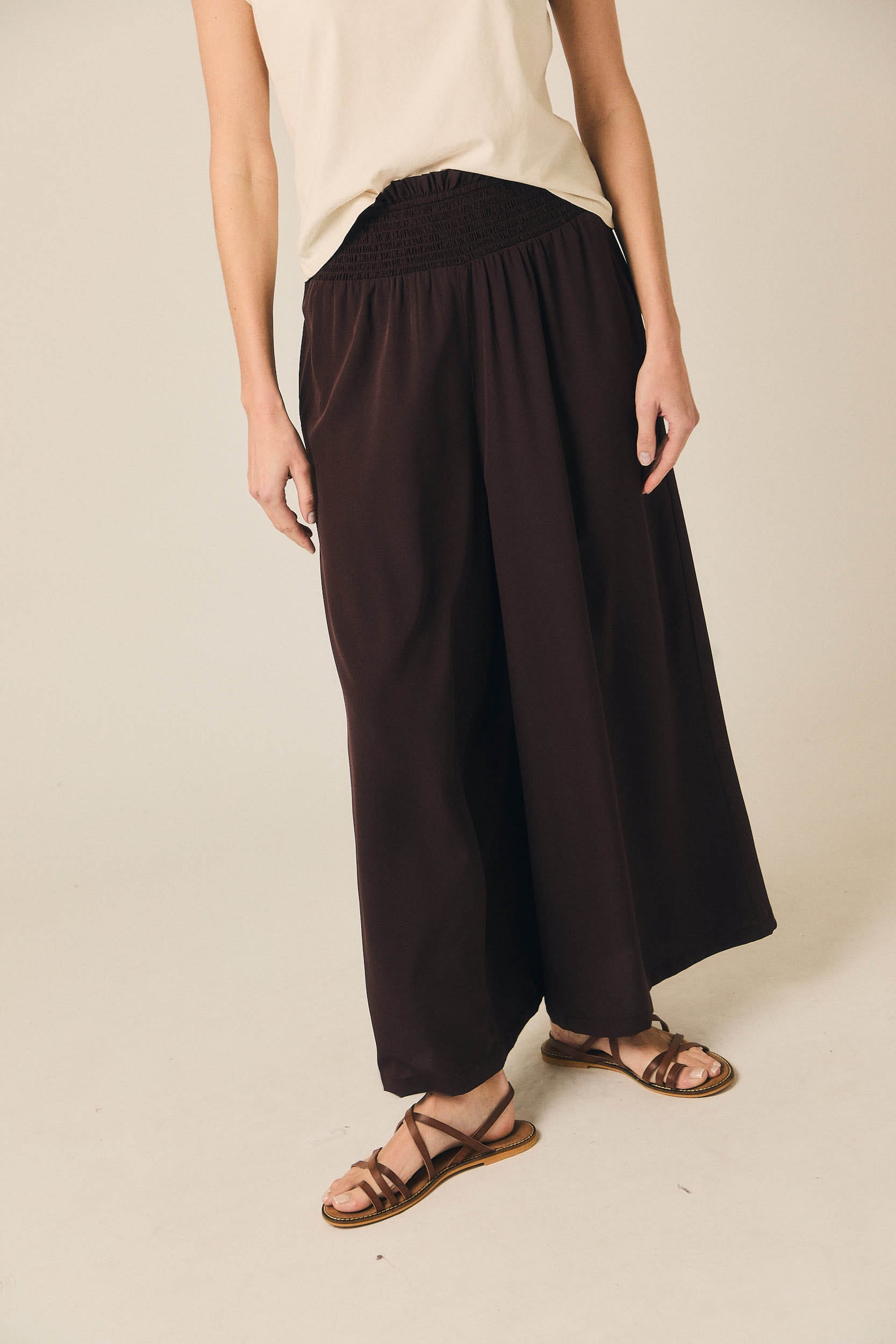 As calças com gomas em castanho da Algo Bonito combinam cintura subida com cós elástico confortável e perna de corte direito, criando uma linha limpa e elegante. O acabamento em tecido leve com boa queda evita volume desnecessário e garante um cair fluido que alonga a silhueta, ideal para quem procura um equilíbrio discreto entre estrutura e conforto.