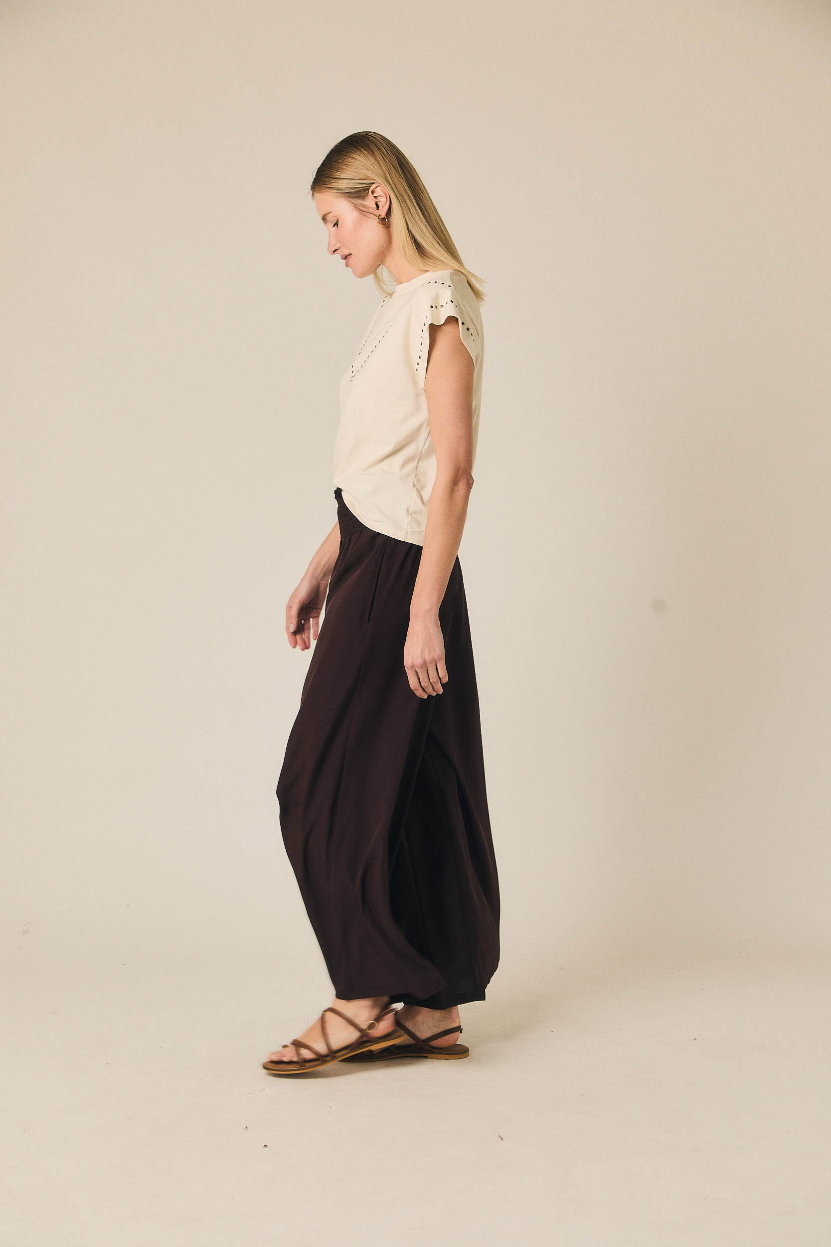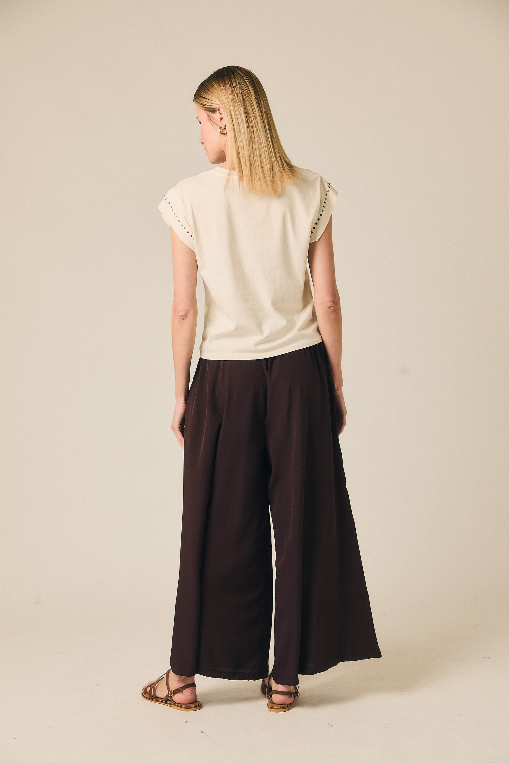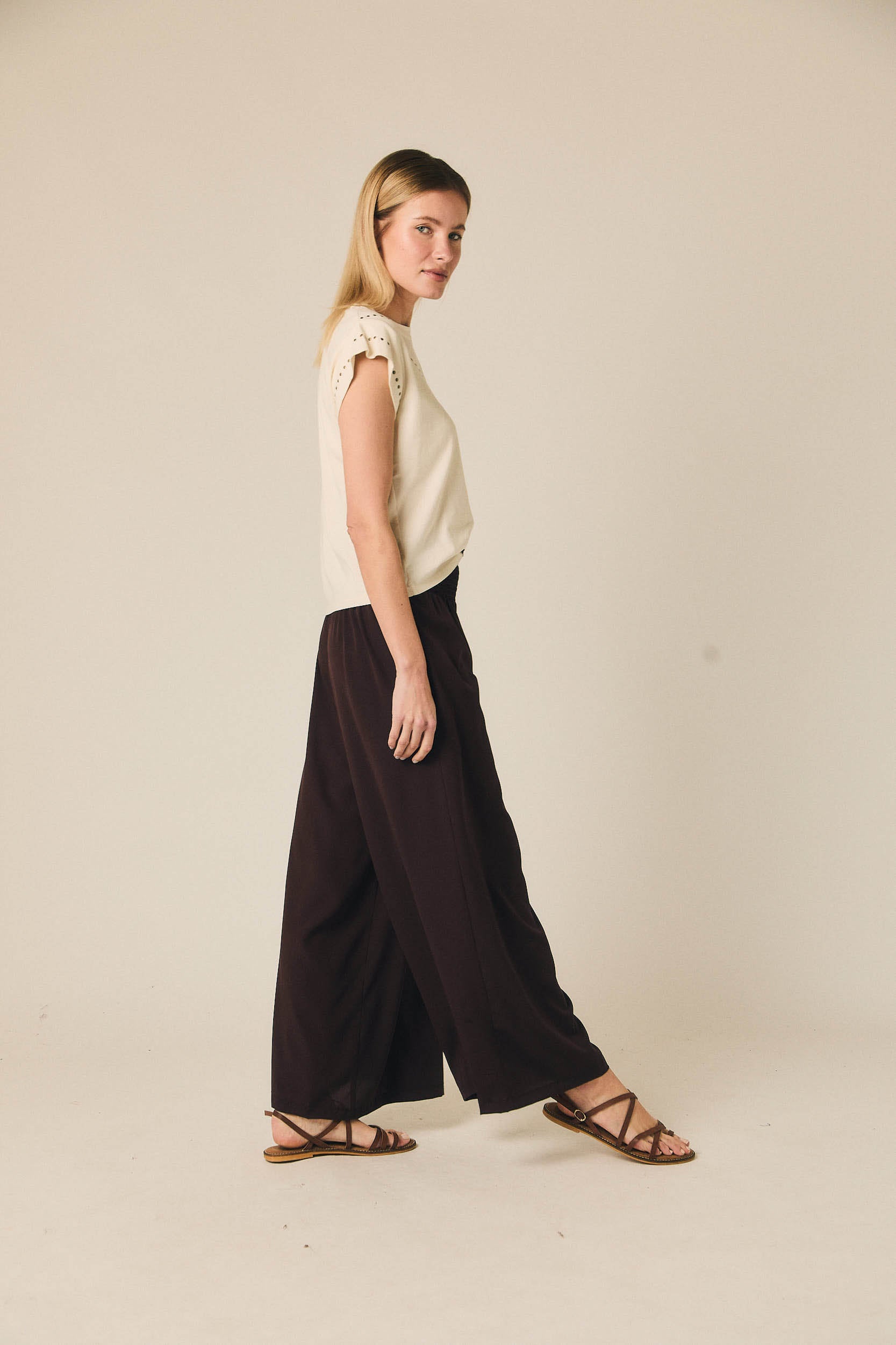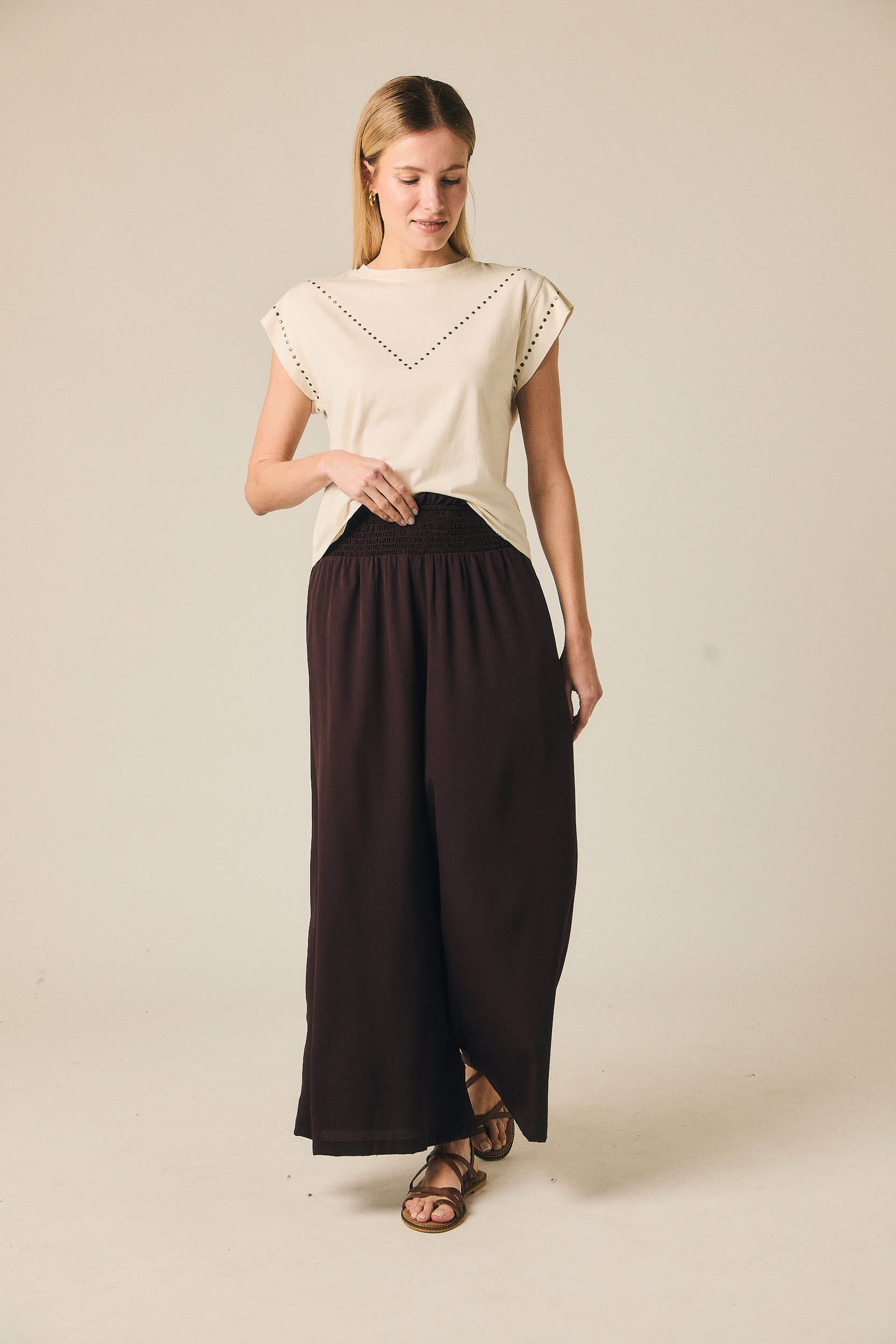As calças com gomas em castanho da Algo Bonito combinam cintura subida com cós elástico confortável e perna de corte direito, criando uma linha limpa e elegante. O acabamento em tecido leve com boa queda evita volume desnecessário e garante um cair fluido que alonga a silhueta, ideal para quem procura um equilíbrio discreto entre estrutura e conforto.
