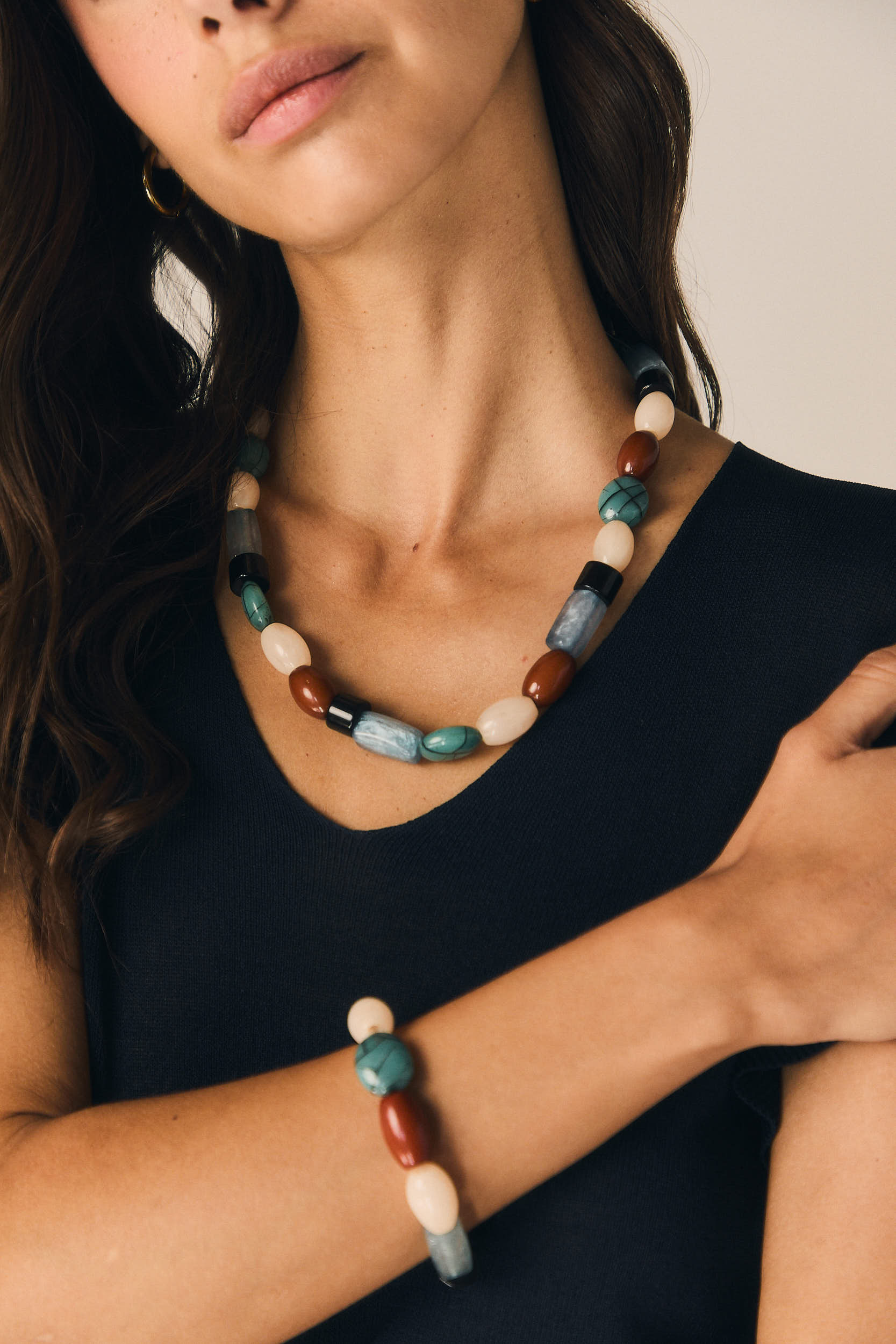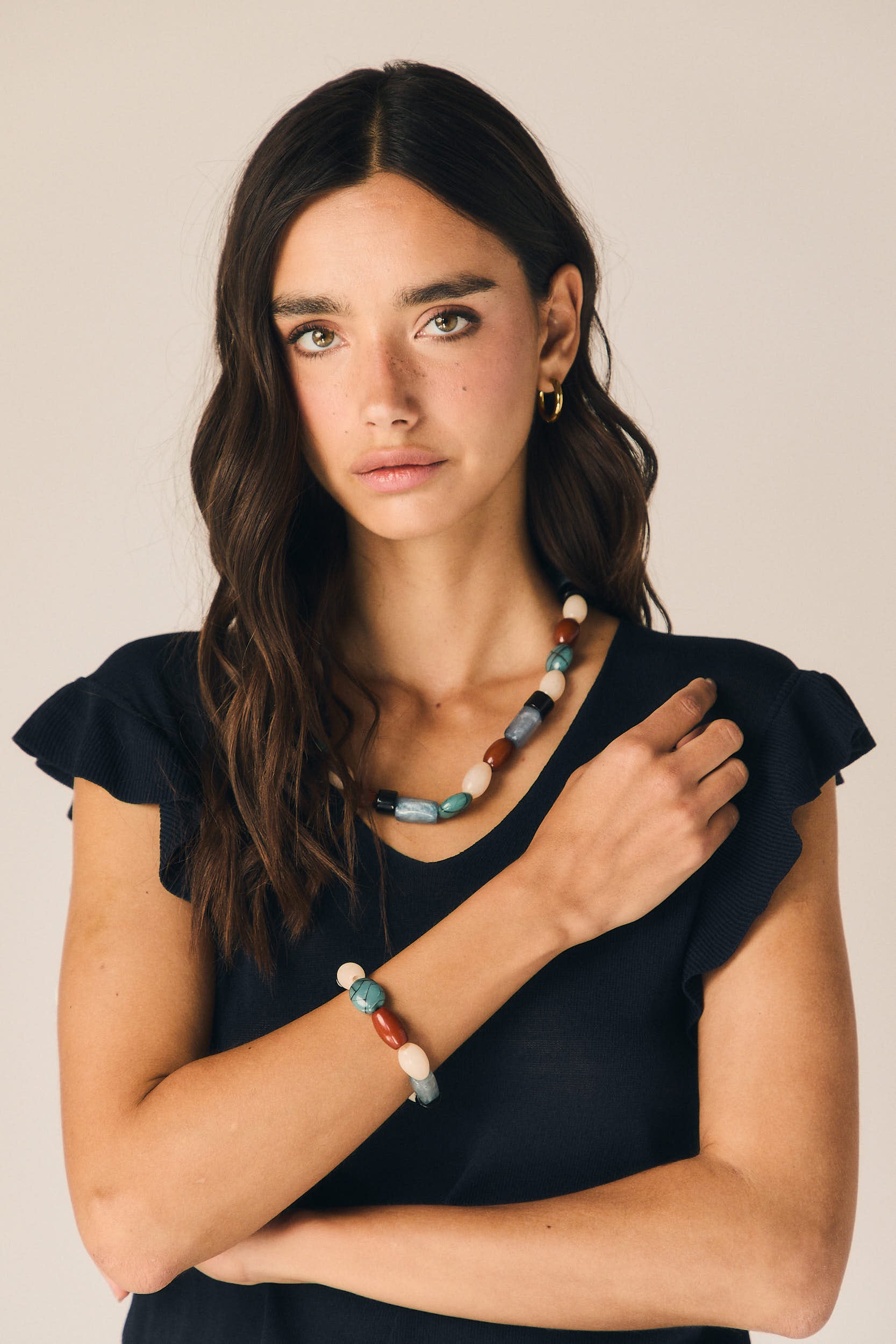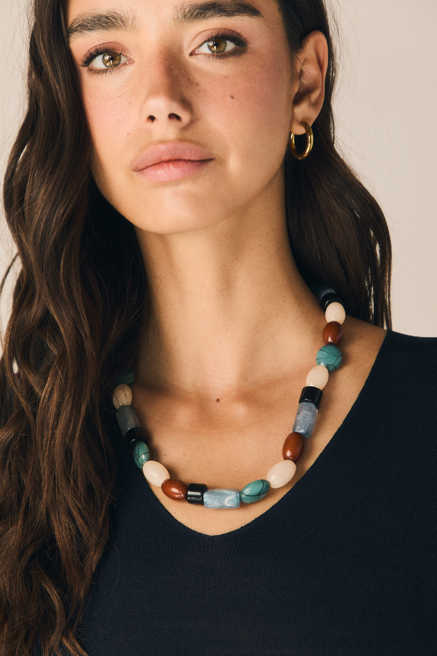Collar corto de cuentas combinadas en diferentes formas y volúmenes, en tonos azul, blanco y teja con pequeños acentos en negro. Diseño irregular que aporta textura y contraste, ajustándose a la base del cuello.
