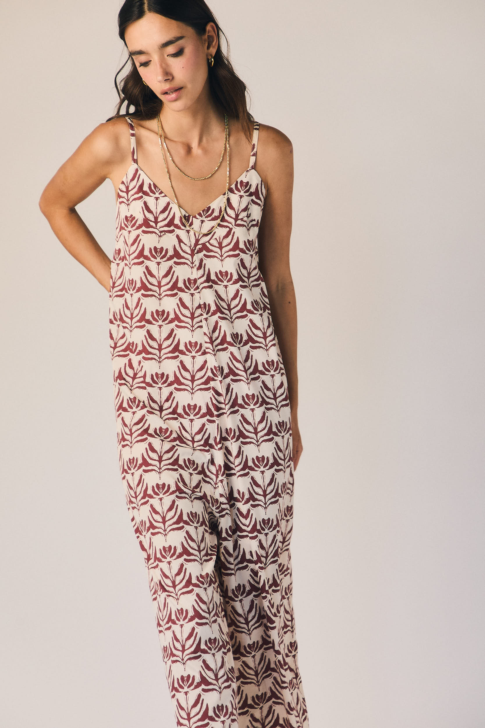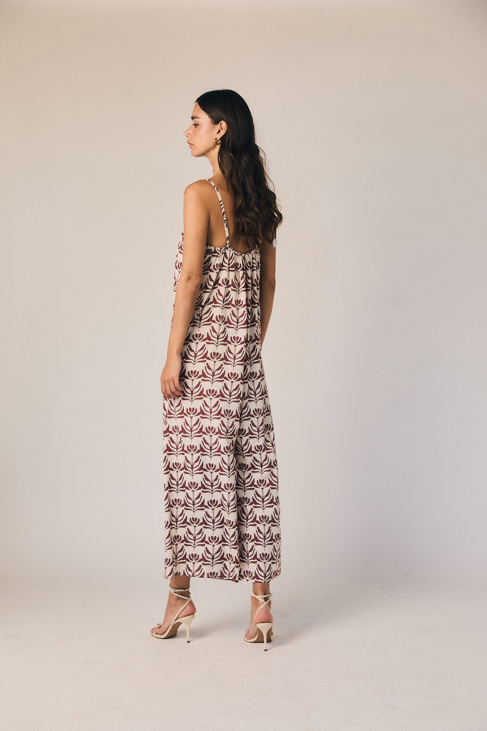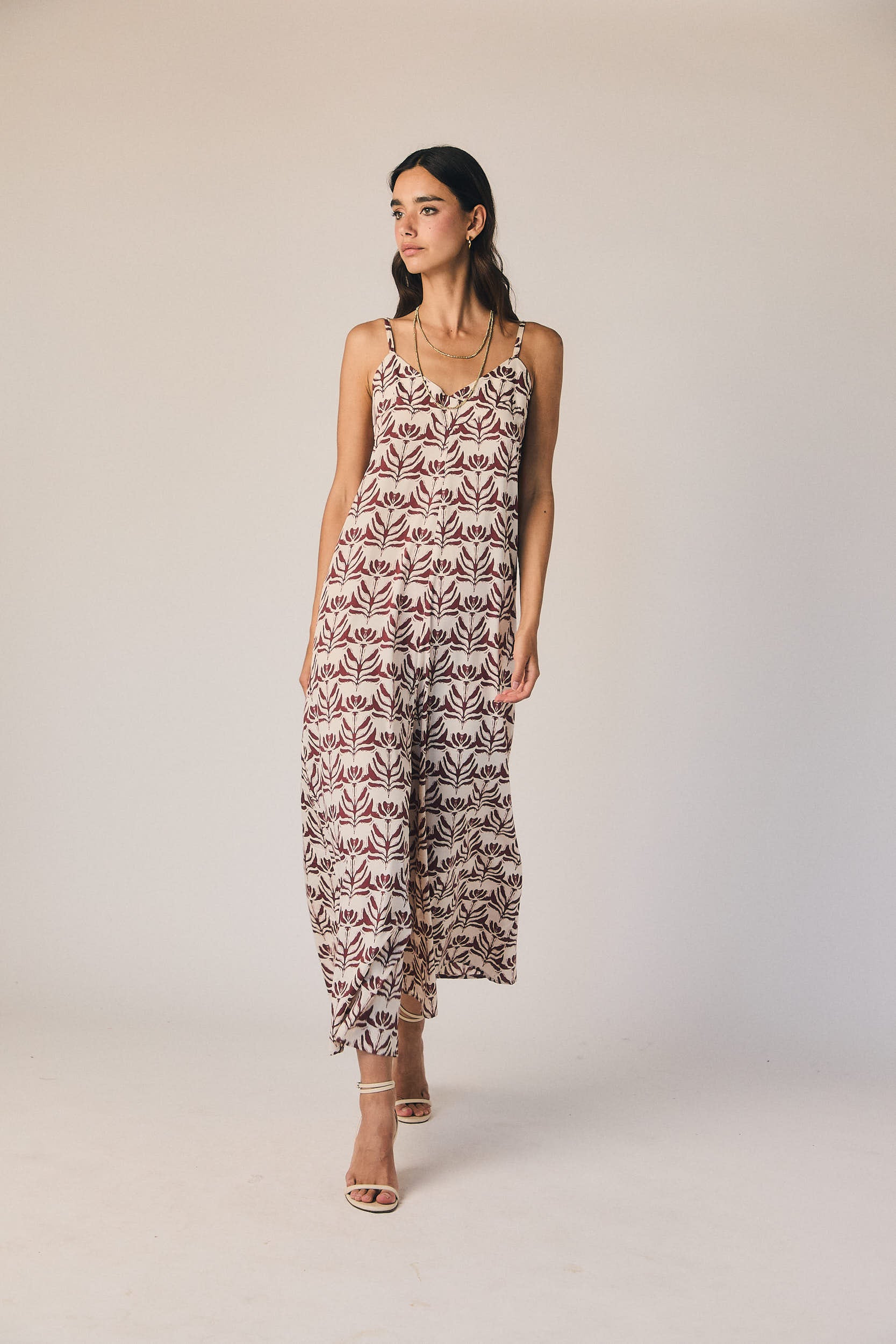 Macacão de alças em tom natural, com decote discreto e linha limpa que alonga a silhueta. O corte direito cai com elegância sobre o corpo, criando um efeito fluido e arrumado, ideal para quem procura simplicidade sofisticada num só gesto.