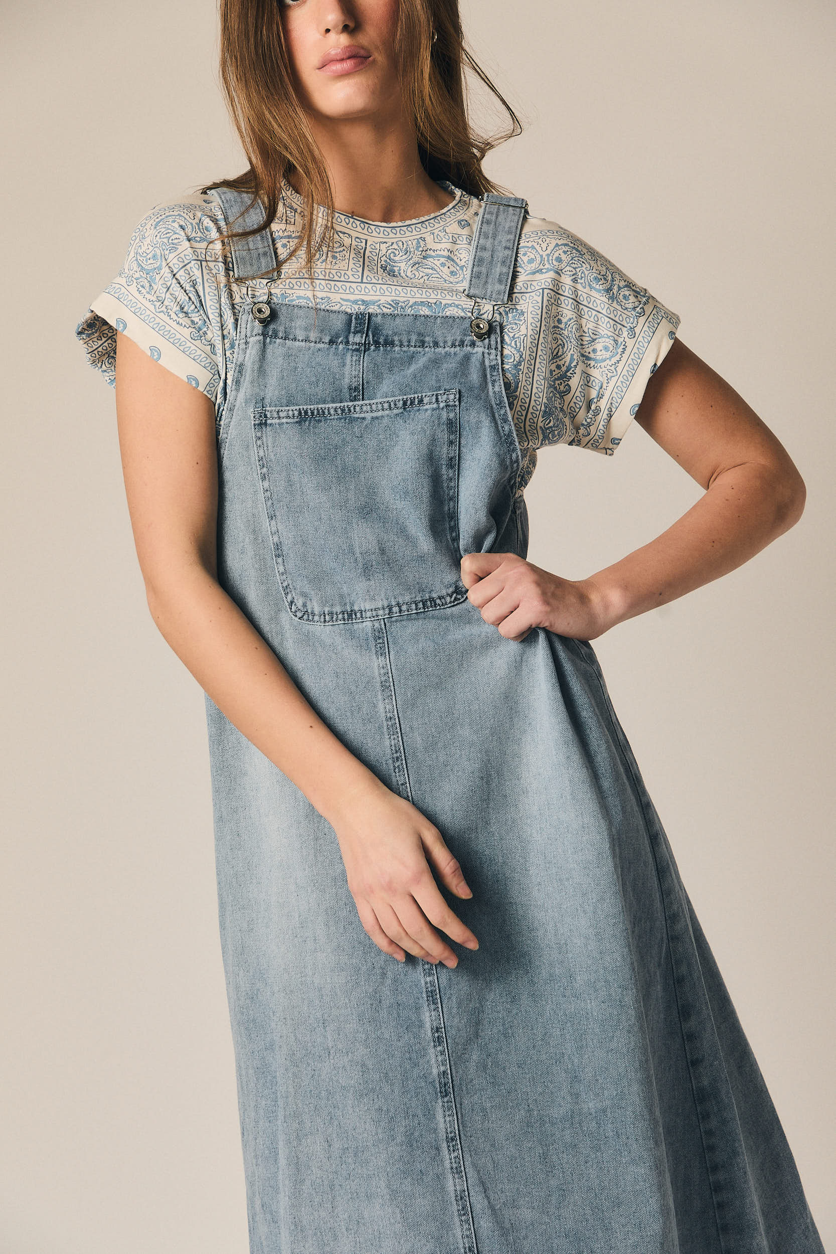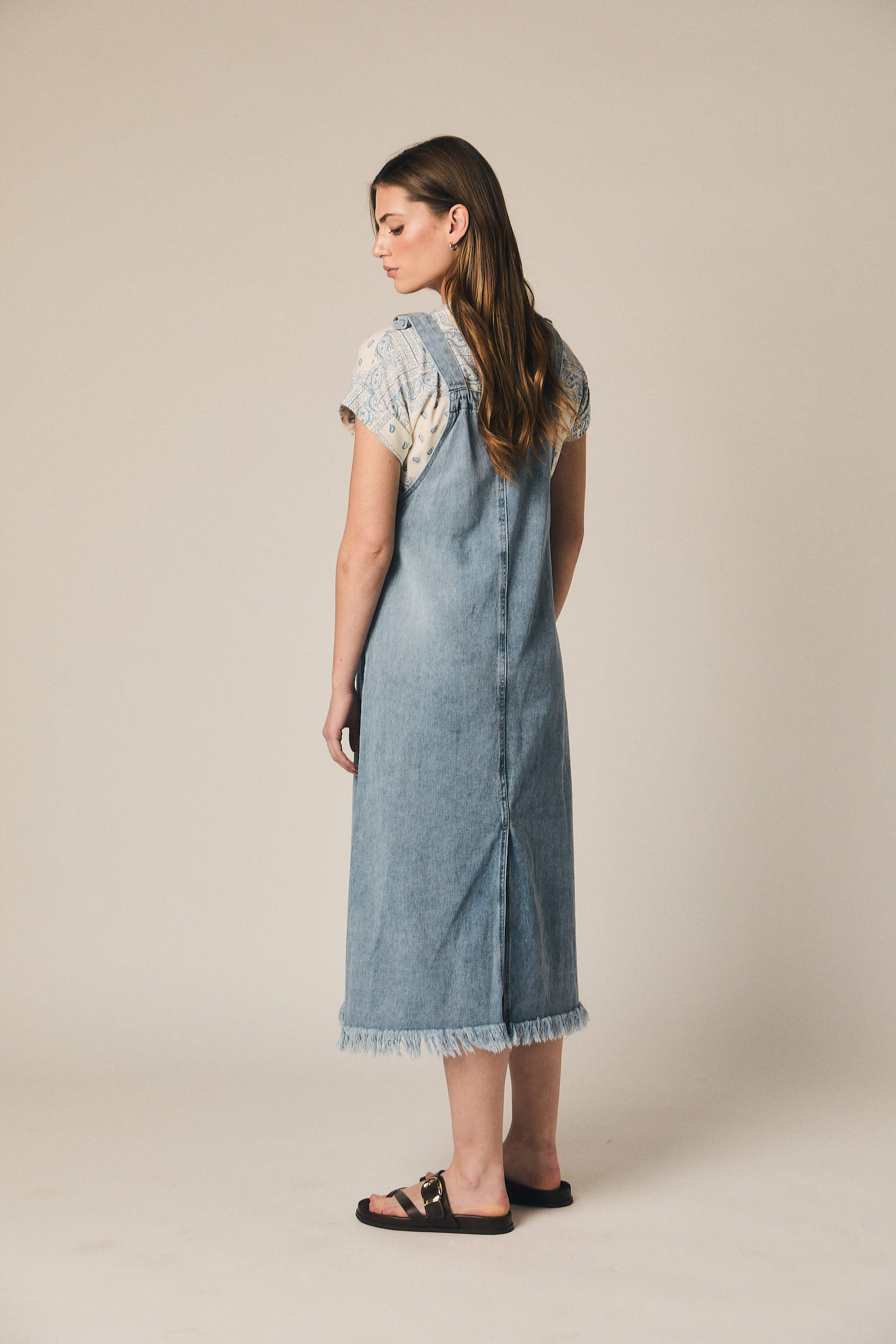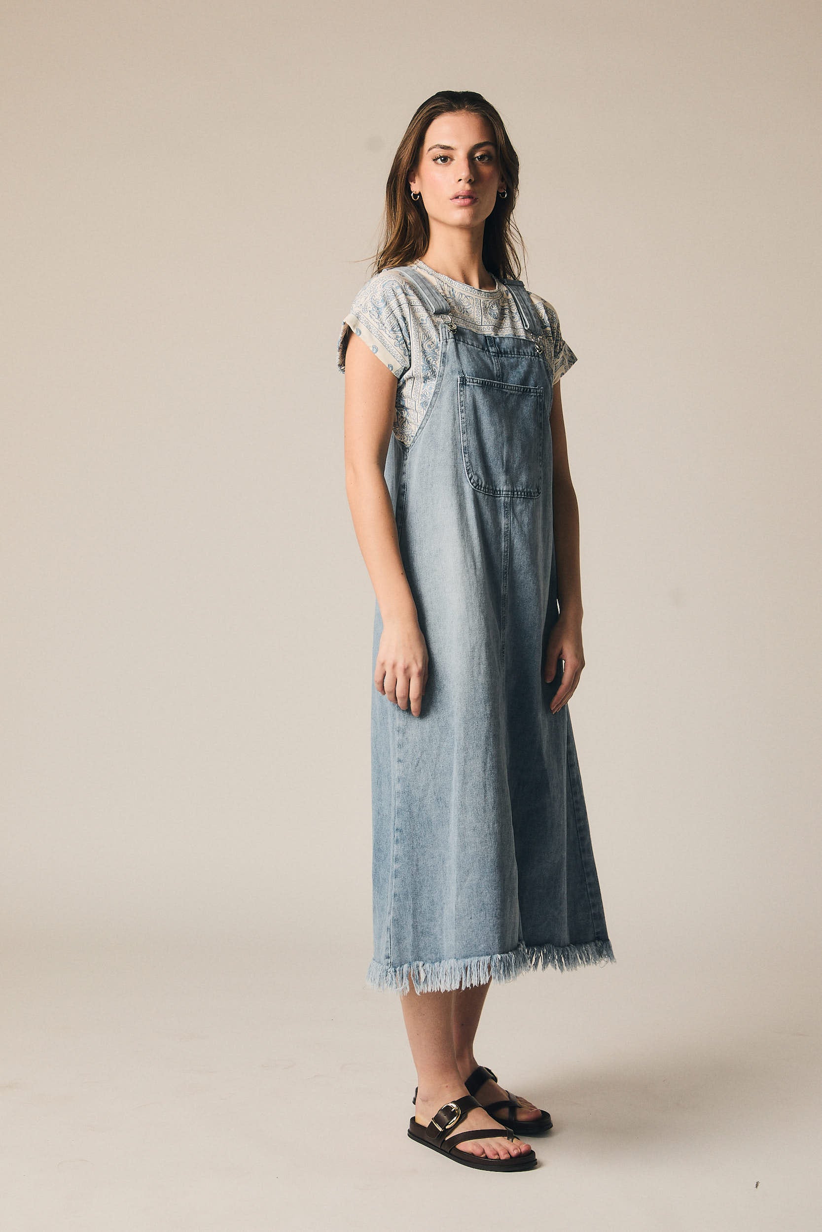 Pichi de denim con silueta recta y largo midi. Presenta tirantes ajustables con cierremetálico, bolsillo frontal tipo parche y abertura amplia en los laterales. El bajo deshilachado aporta un acabado más desenfadado al diseño.
