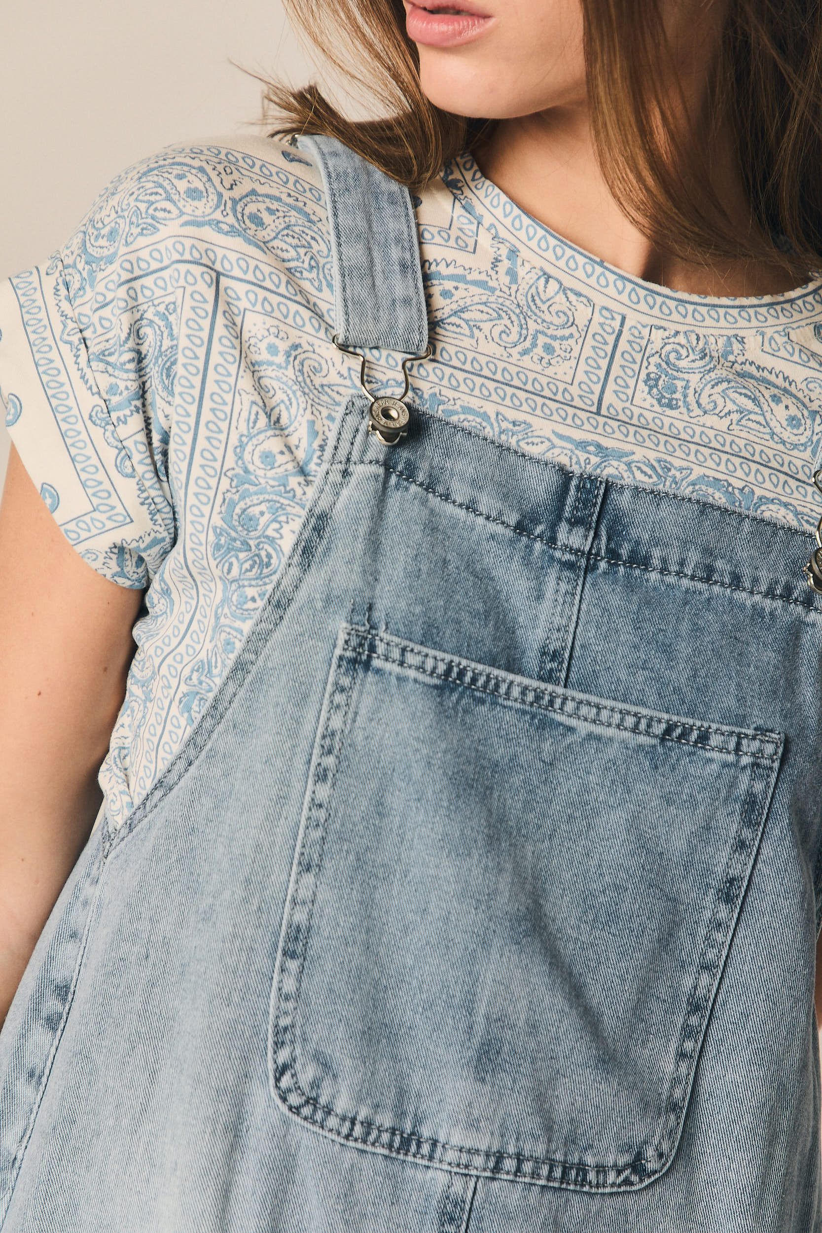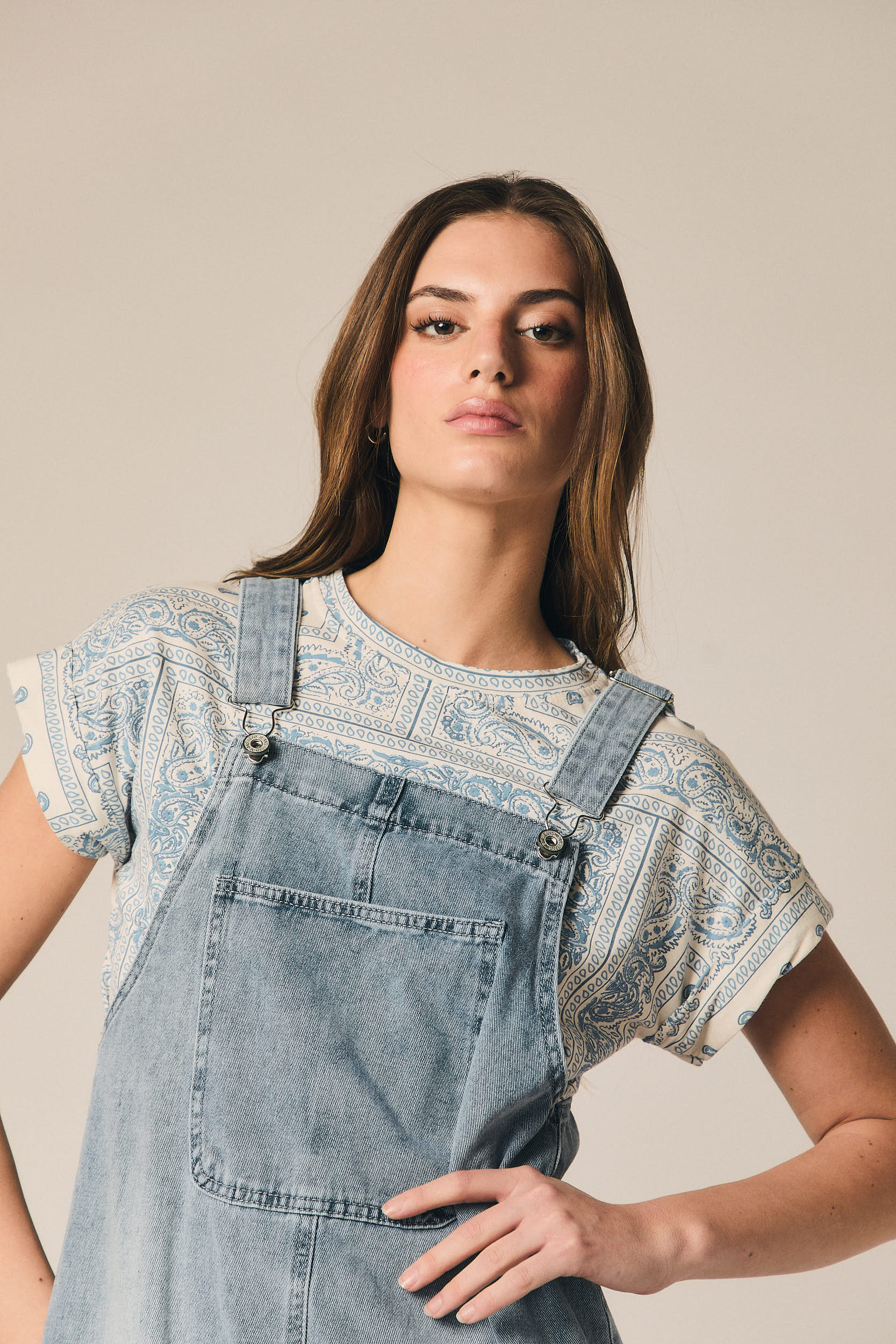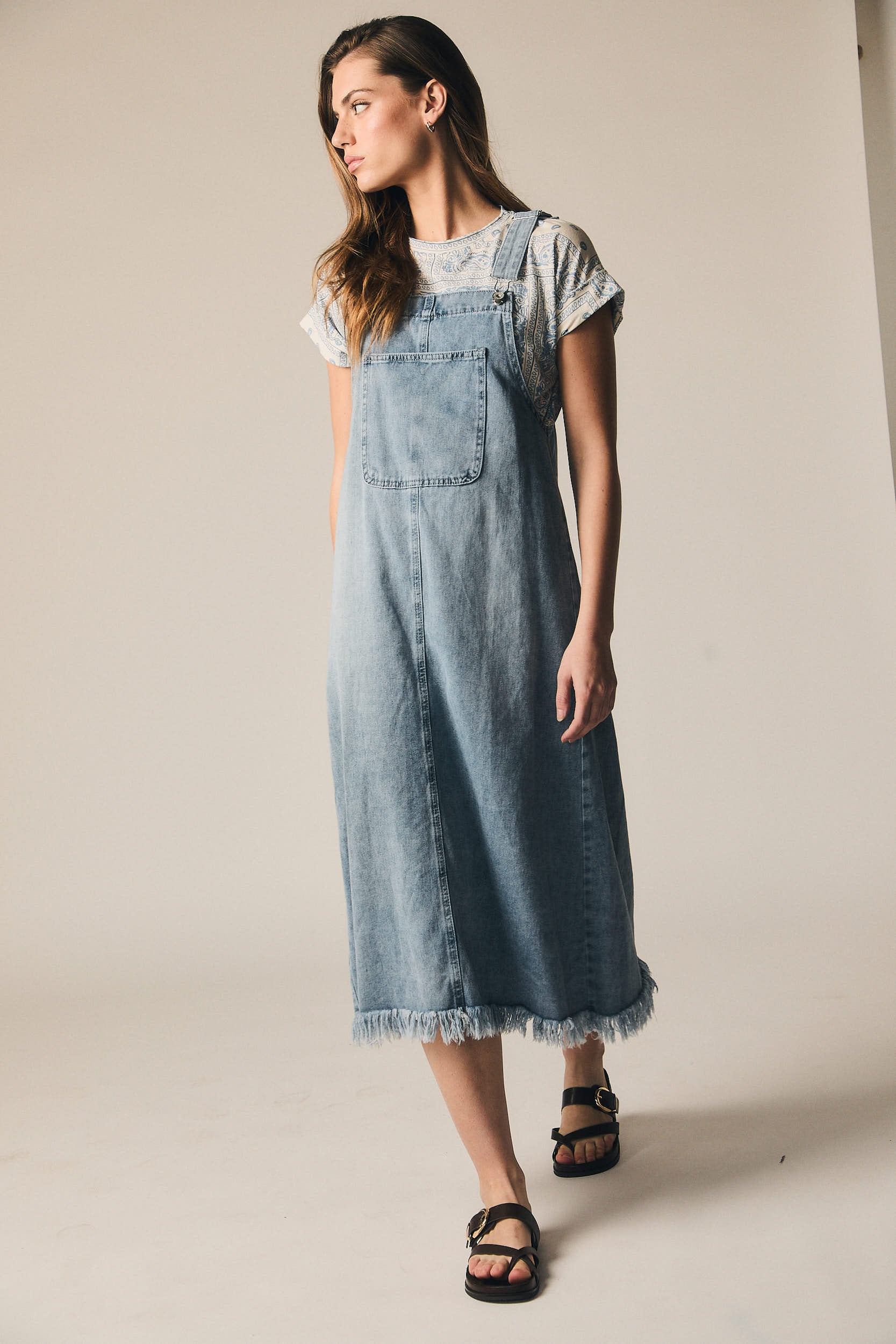 Pichi de denim con silueta recta y largo midi. Presenta tirantes ajustables con cierremetálico, bolsillo frontal tipo parche y abertura amplia en los laterales. El bajo deshilachado aporta un acabado más desenfadado al diseño.