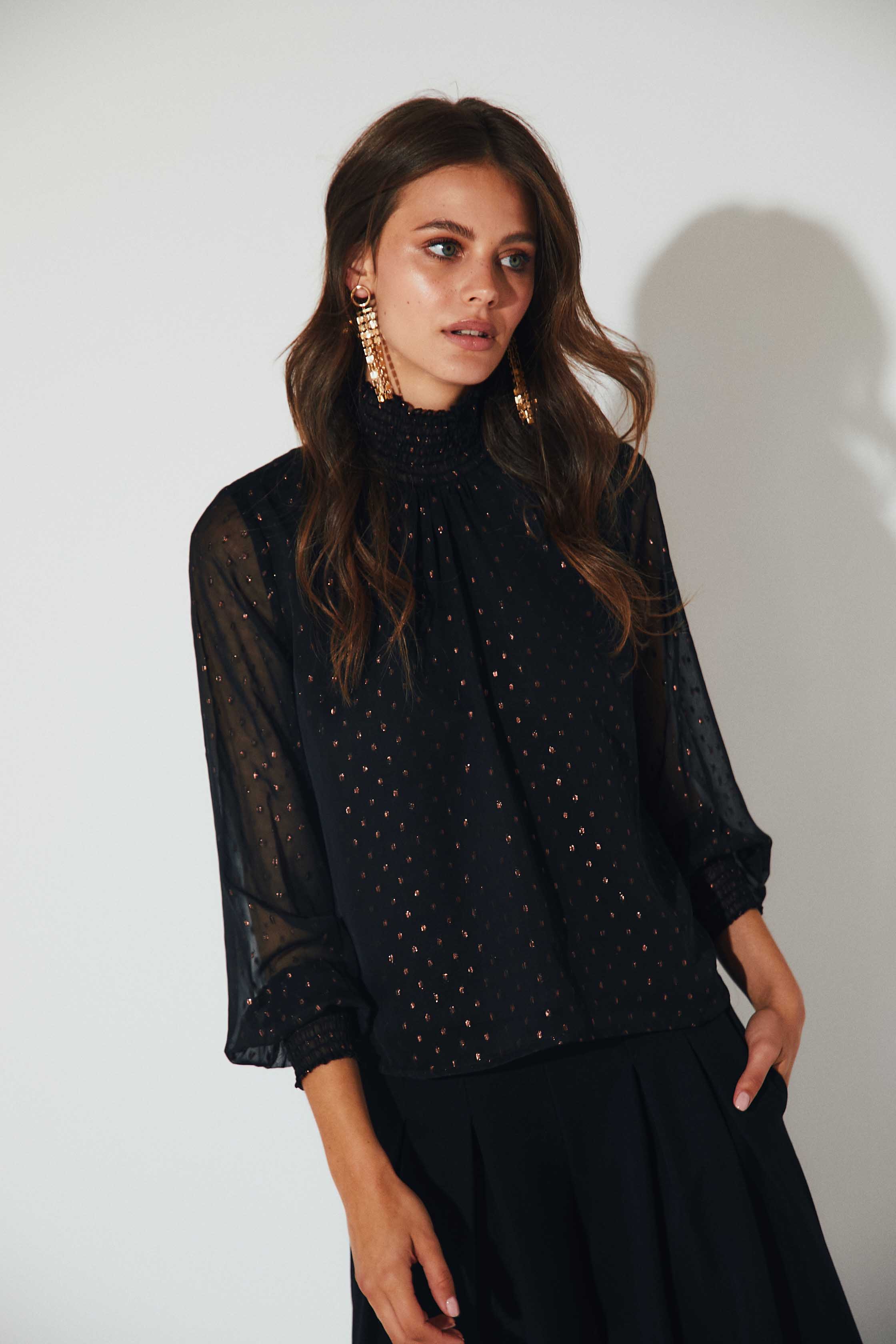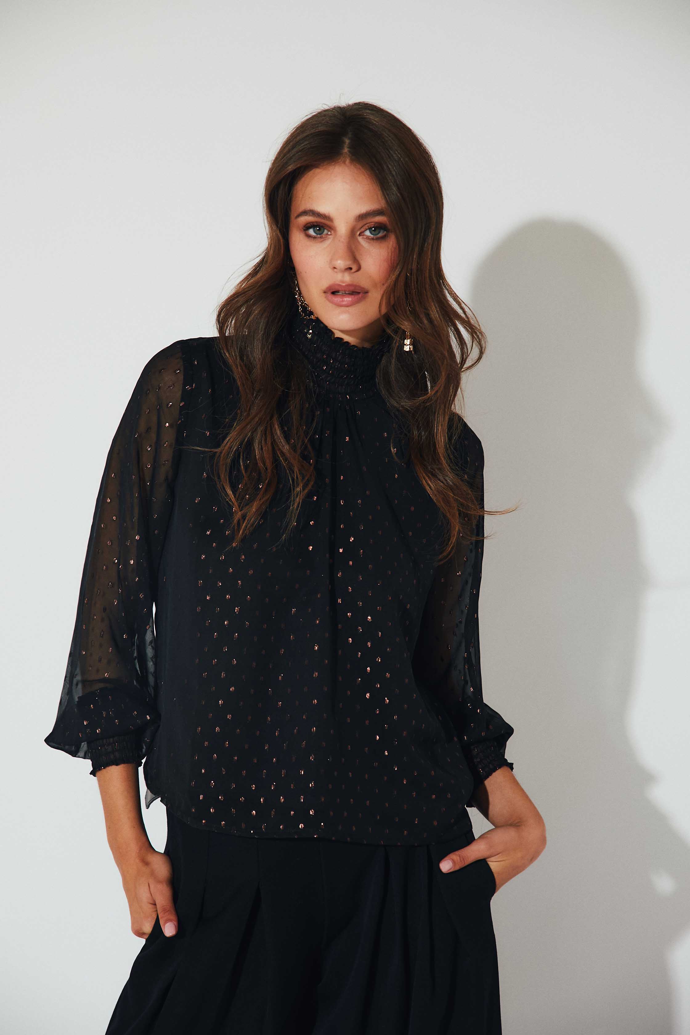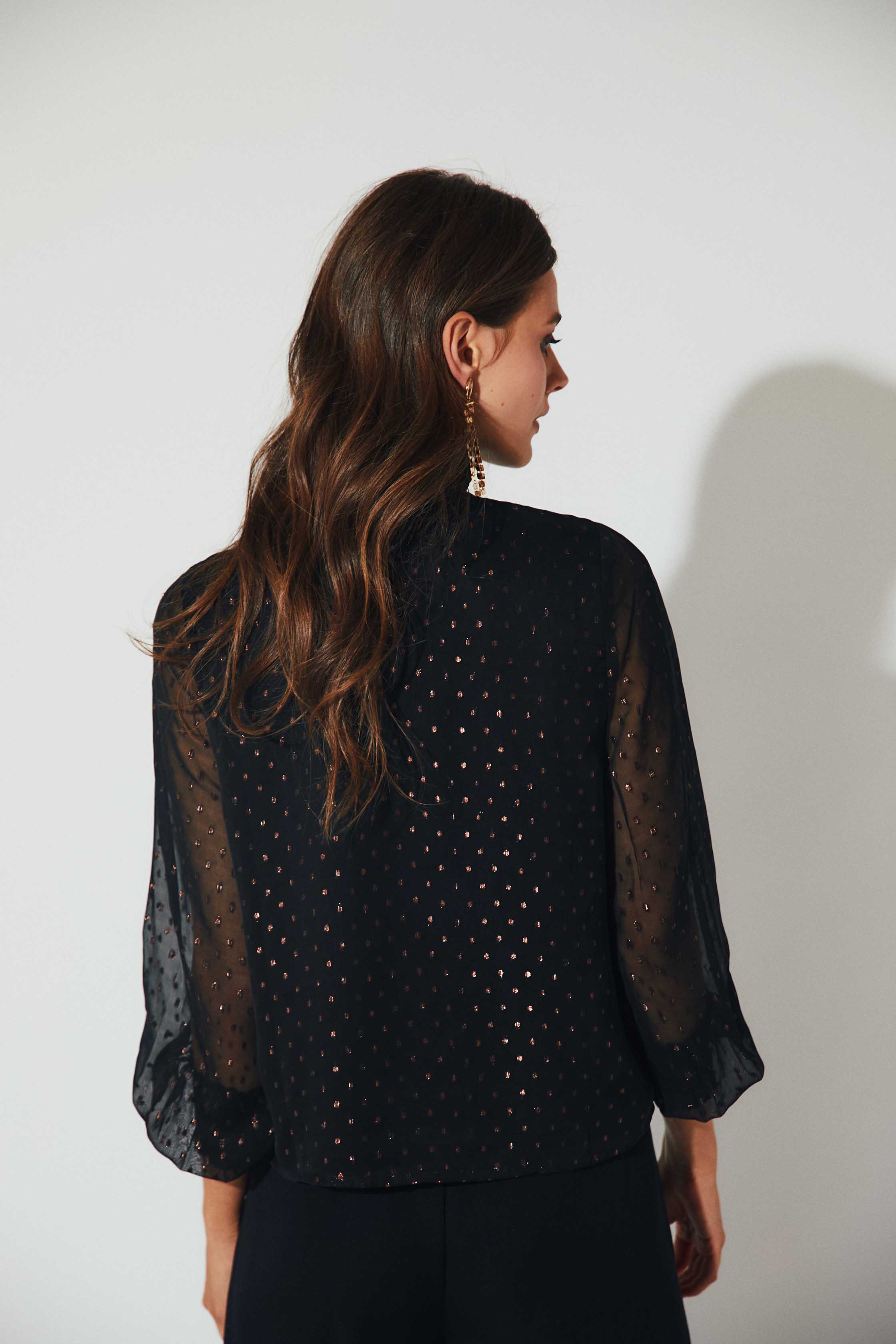 Blusa de gasa en tono negro con delicados hilos de lurex que aportan un brillo sutil. Presenta cuello subido con fruncido elástico, cierre de pequeños botones en la parte trasera y manga larga semitransparente con puño fruncido. Su caída fluida y ligera la convierte en una prenda elegante y versátil.