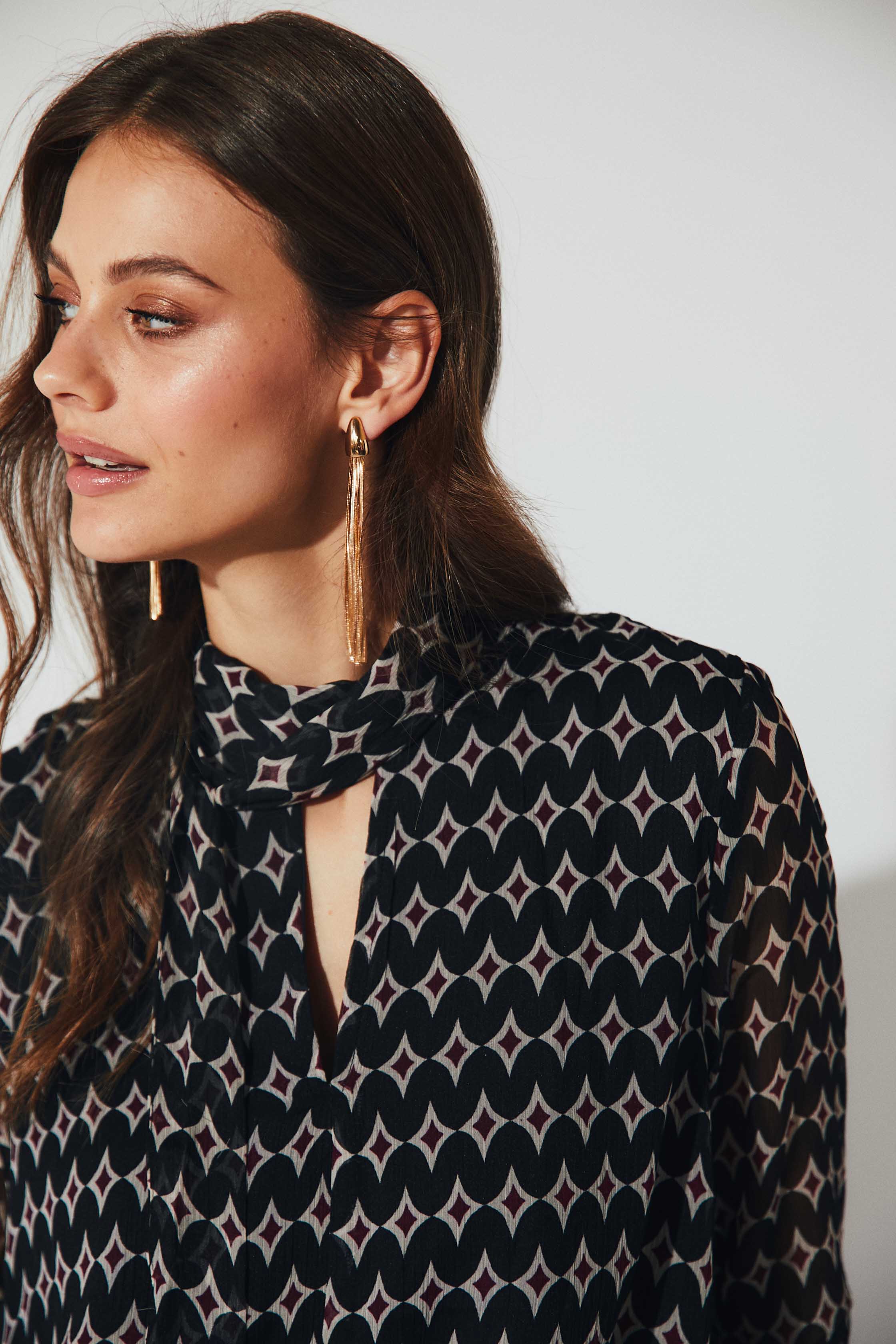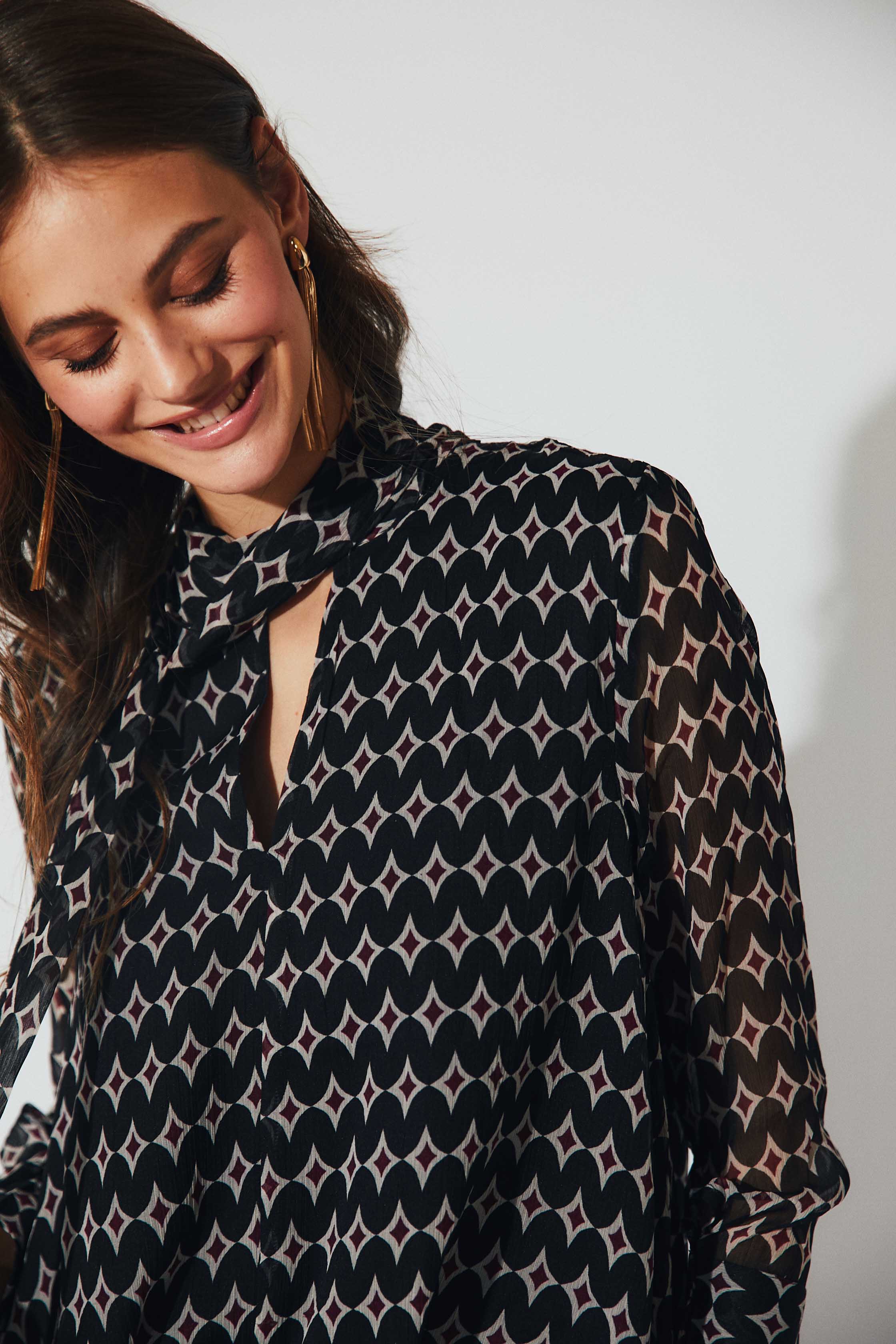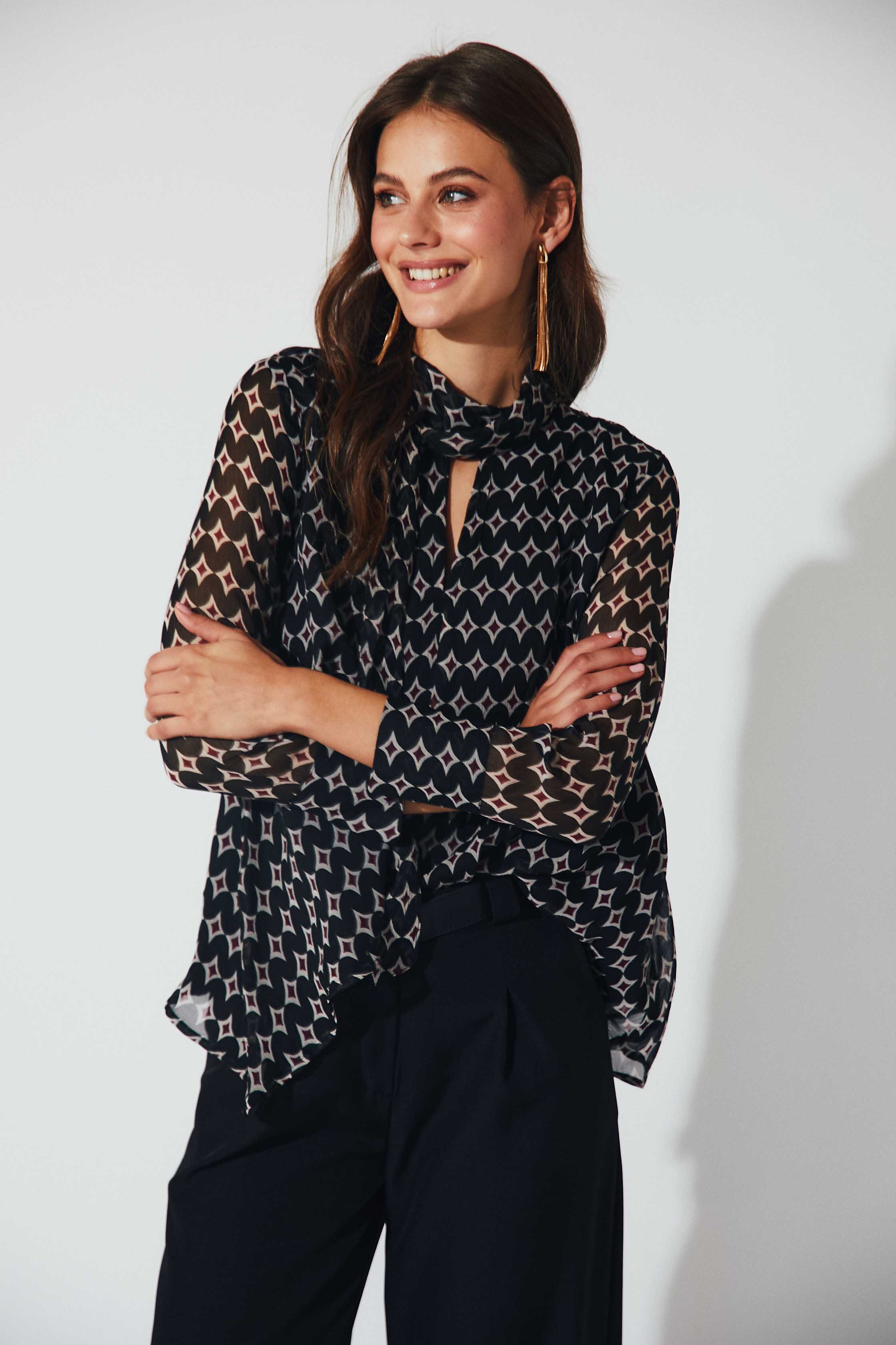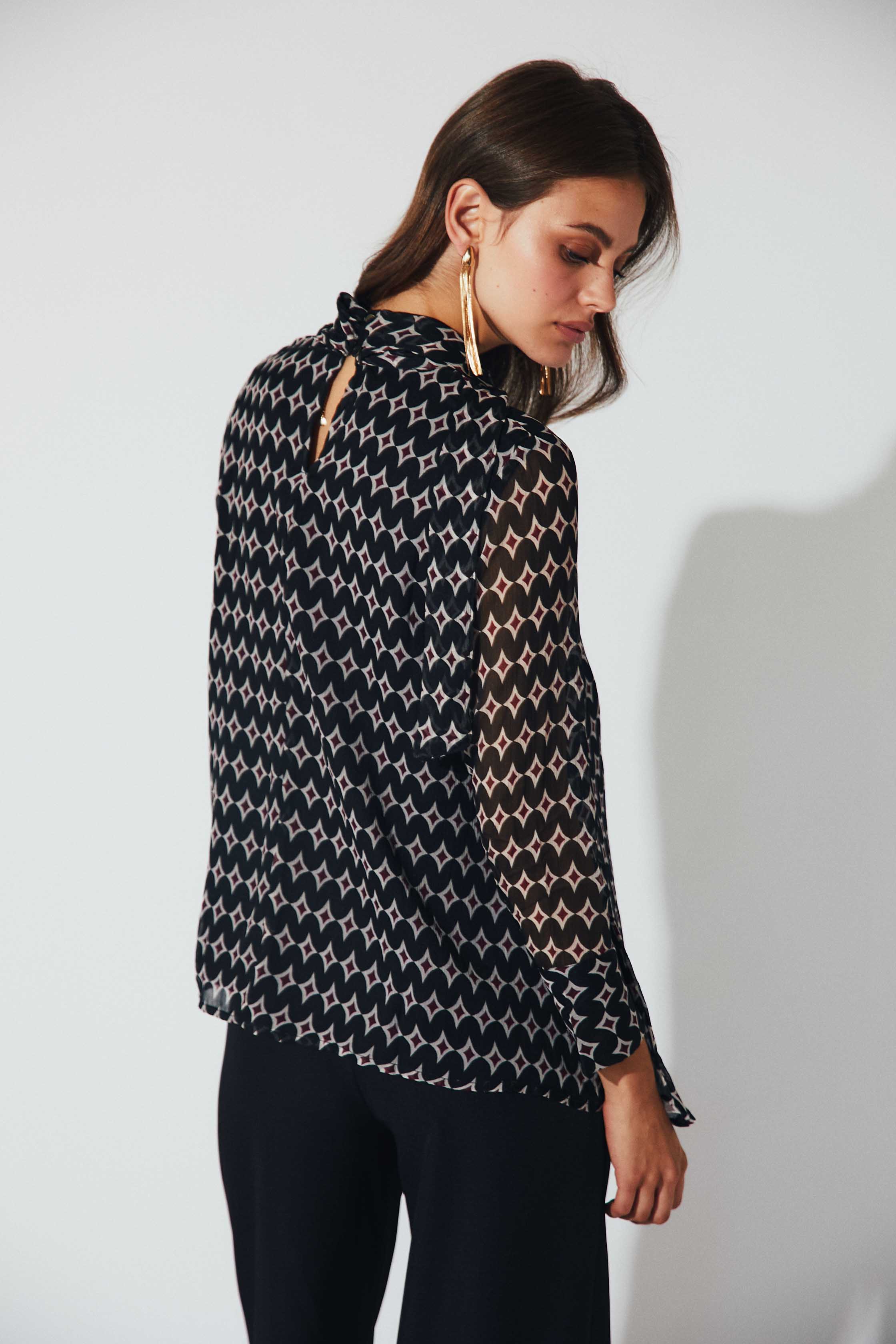 Blusa de gasa semitransparente con estampado geométrico en tonos burdeos. Presenta cuello con lazo para anudar, escote en pico y manga larga ligeramente abullonada con puño fruncido. Su caída fluida y el detalle del lazo aportan un aire sofisticado y femenino.