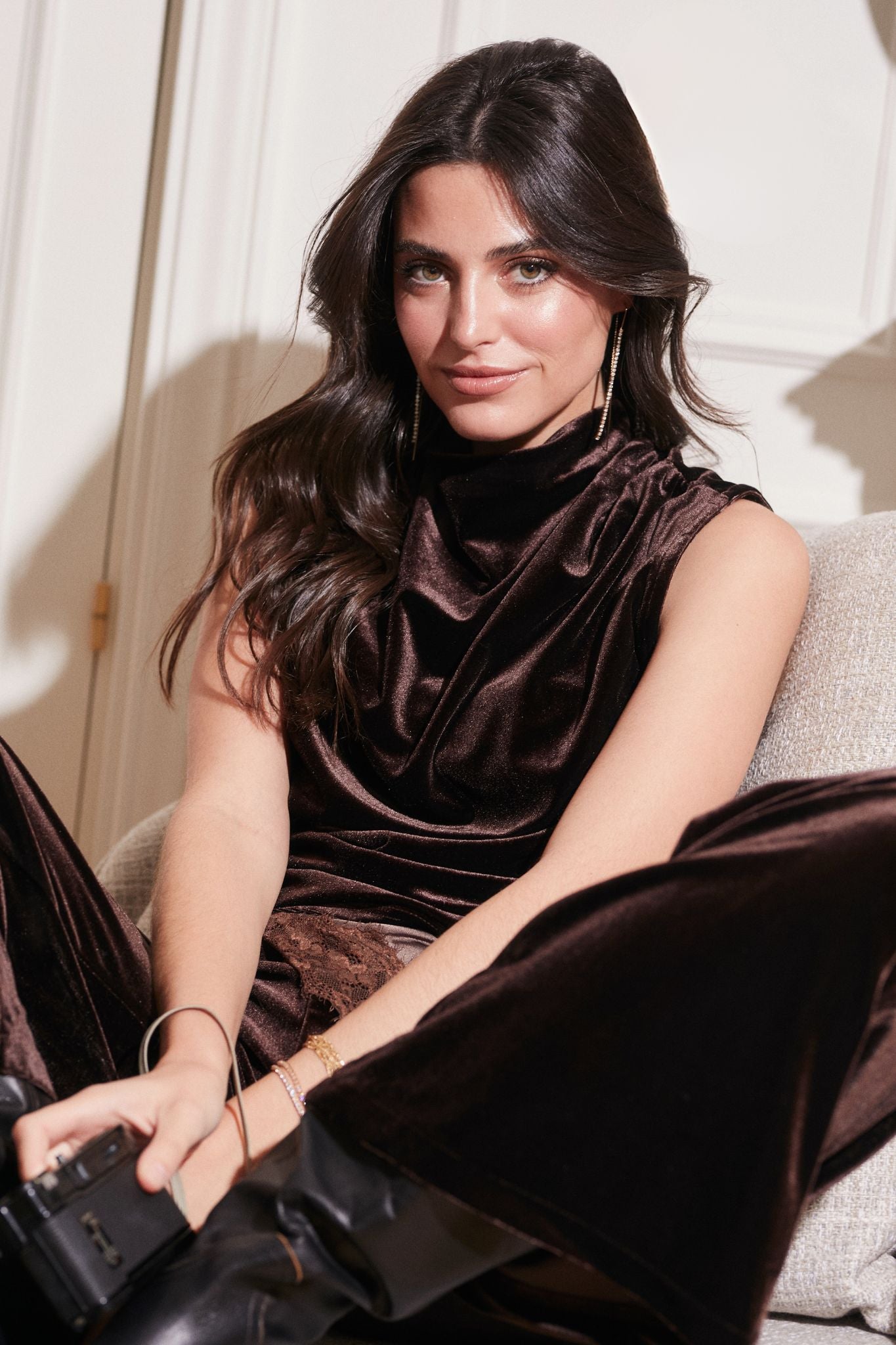 Top sin mangas en tejido de terciopelo marrón, con cuello ligeramente subido y drapeado frontal. Su silueta recta y caída fluida aportan elegancia y movimiento, convirtiéndolo en una prenda sofisticada para ocasiones especiales o looks de noche.