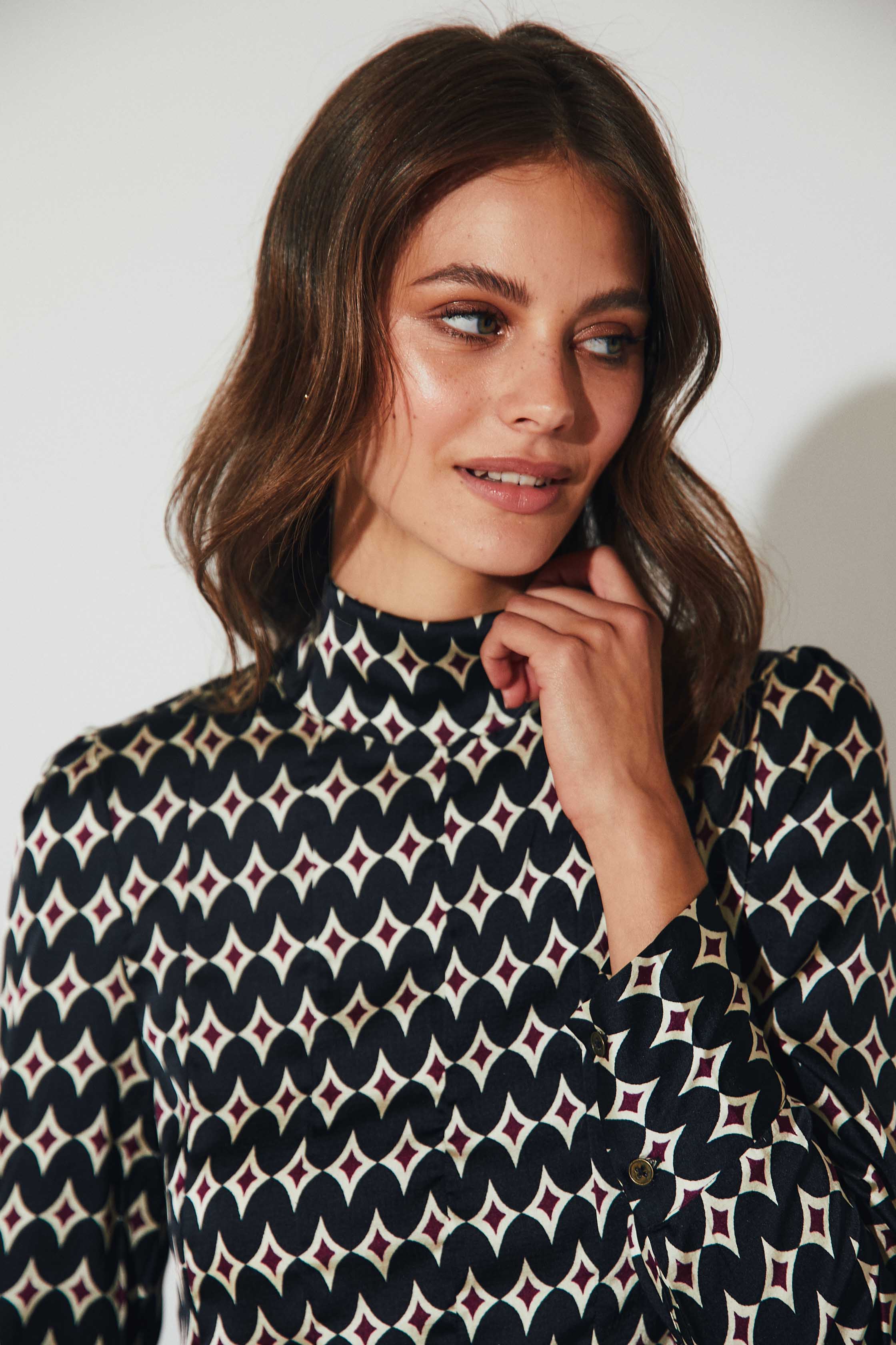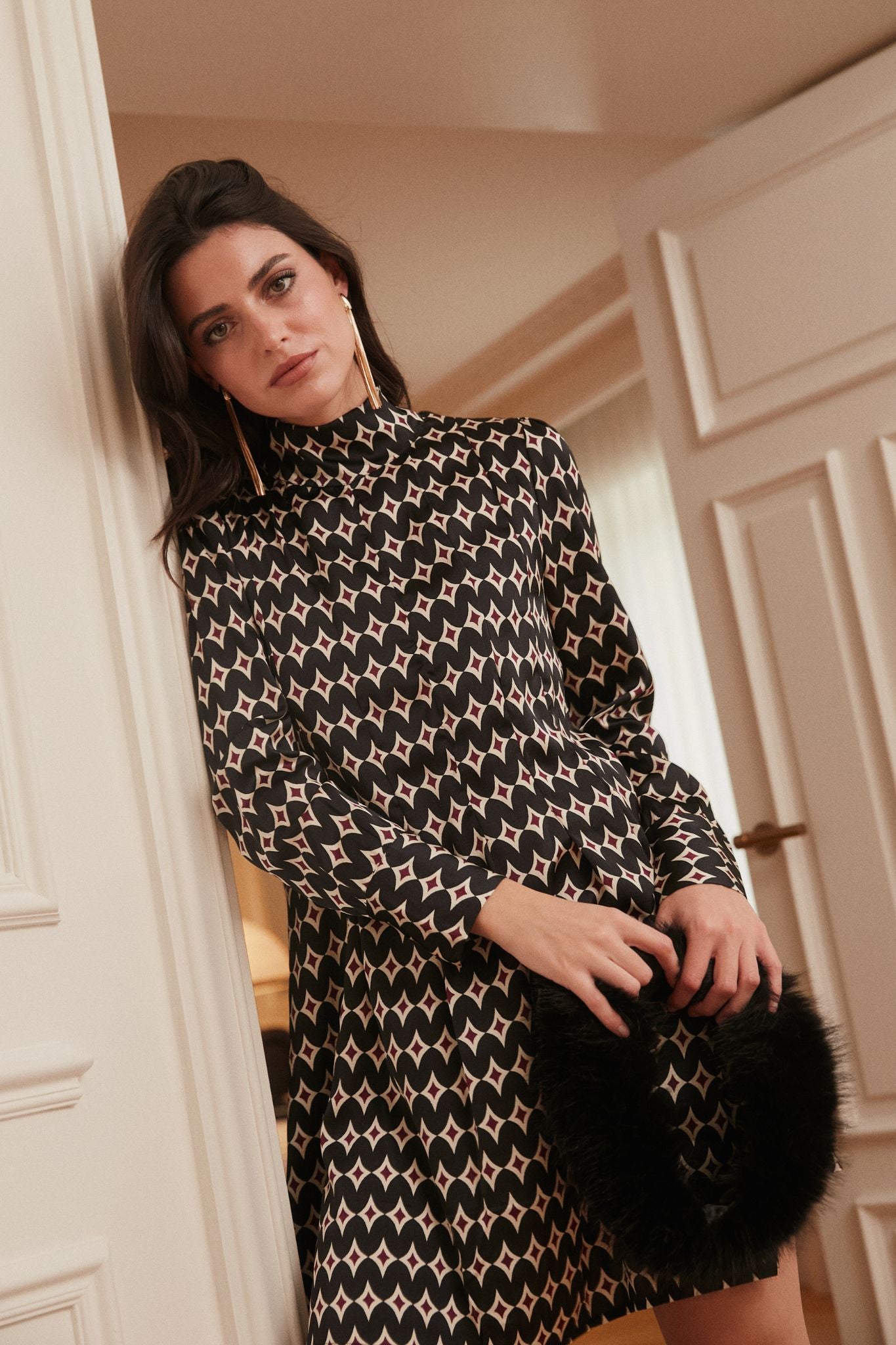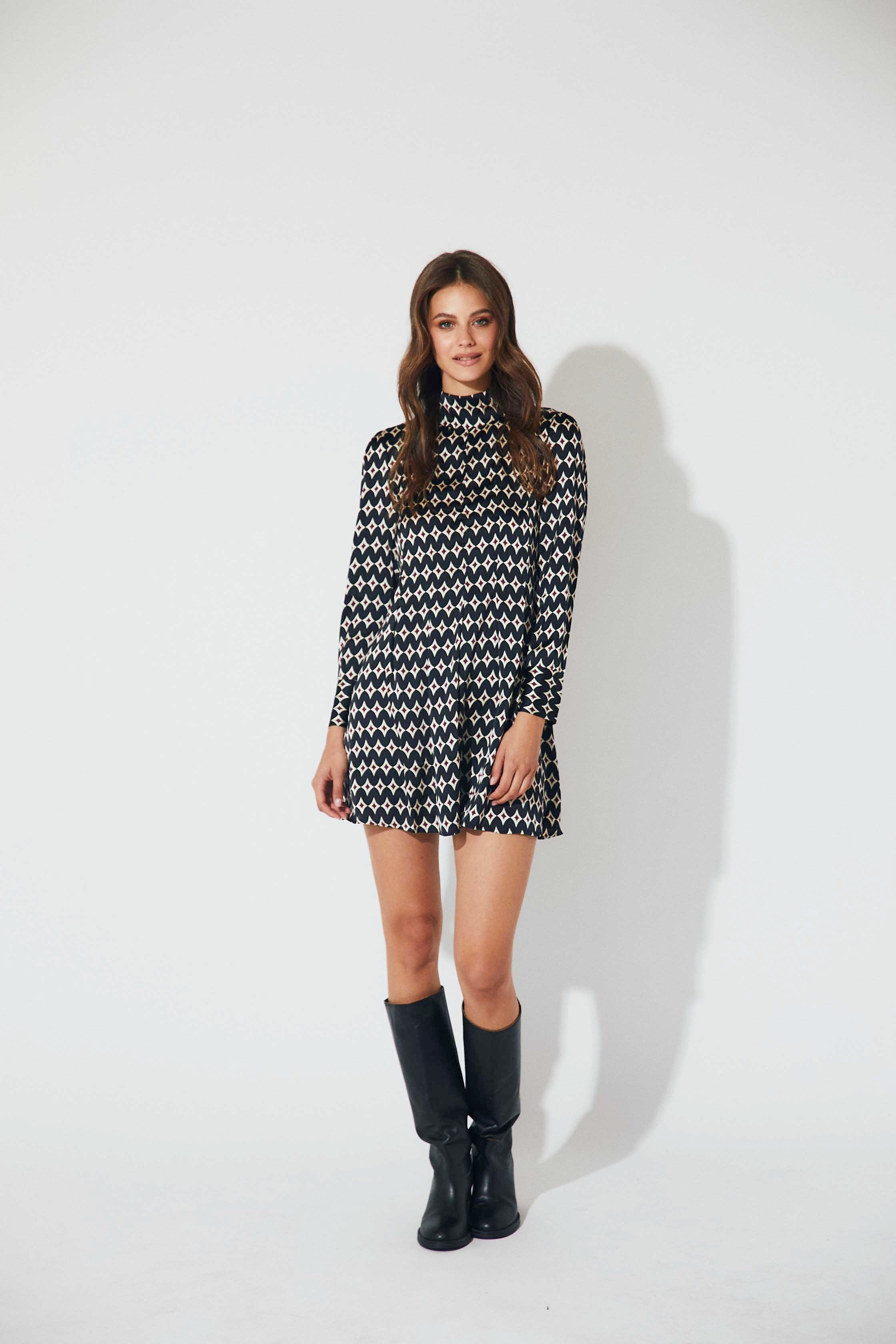 Vestido corto de tejido satinado con estampado geométrico en tonos burdeos. Presenta cuello subido, manga larga y ligero frunce en la cintura que aporta forma y movimiento. Su acabado fluido y el brillo del satén le dan un aire sofisticado y actual.