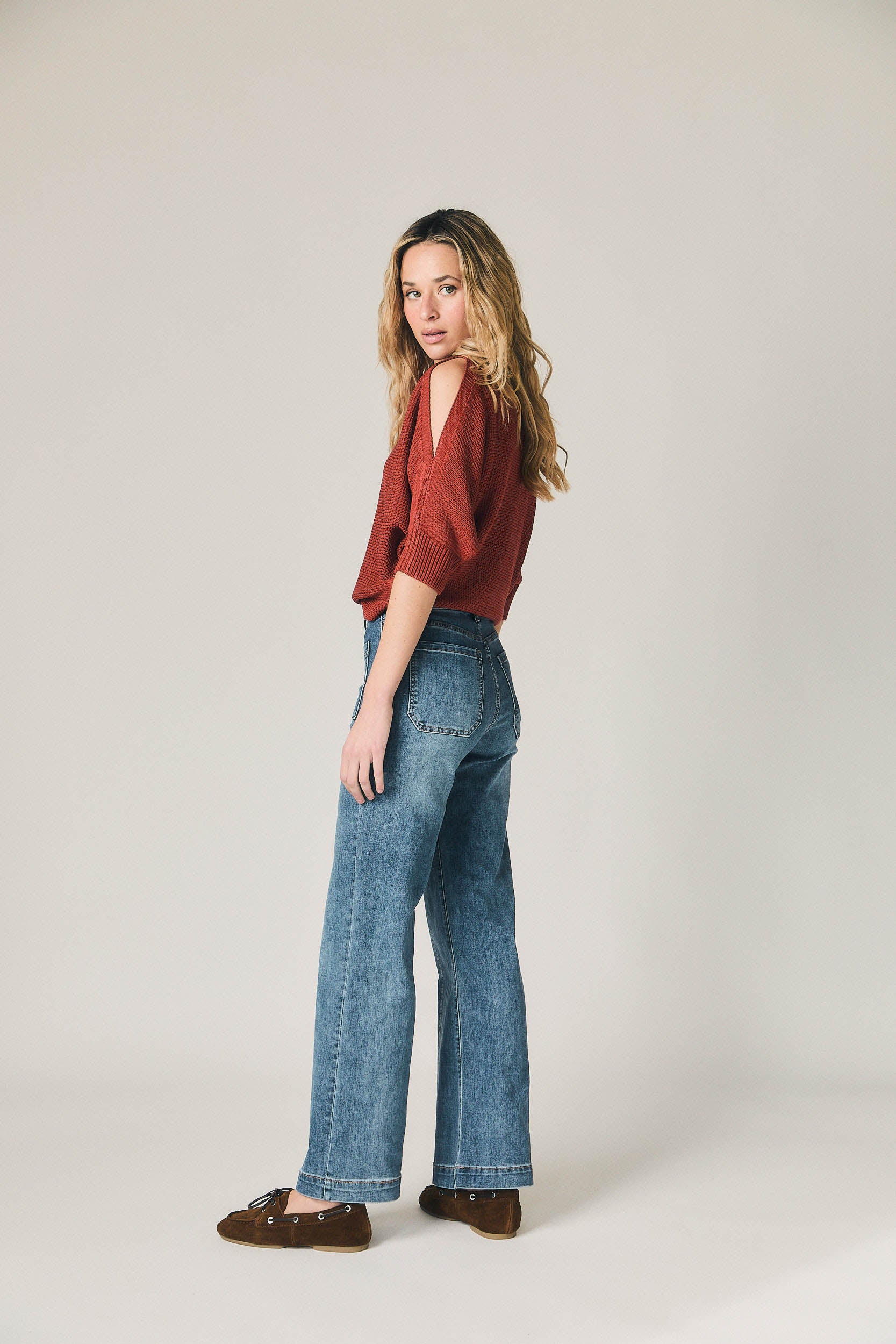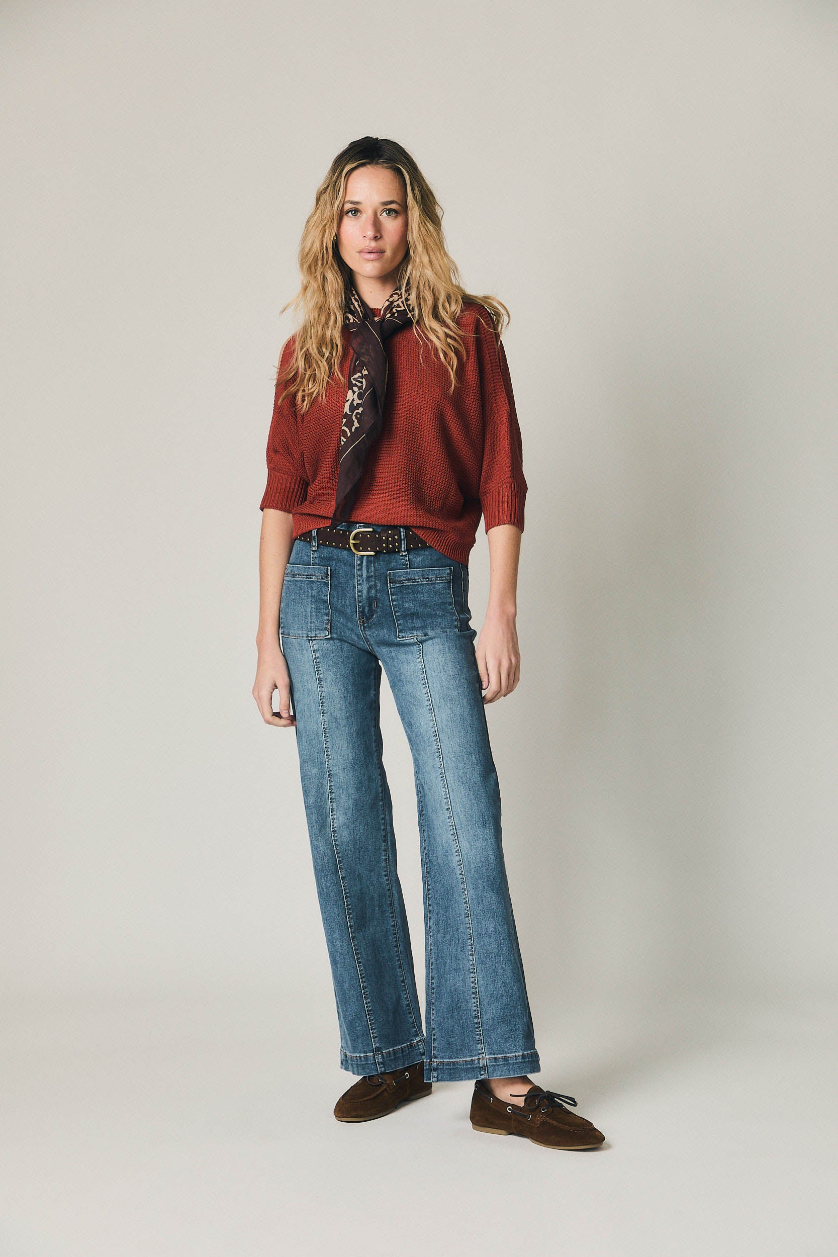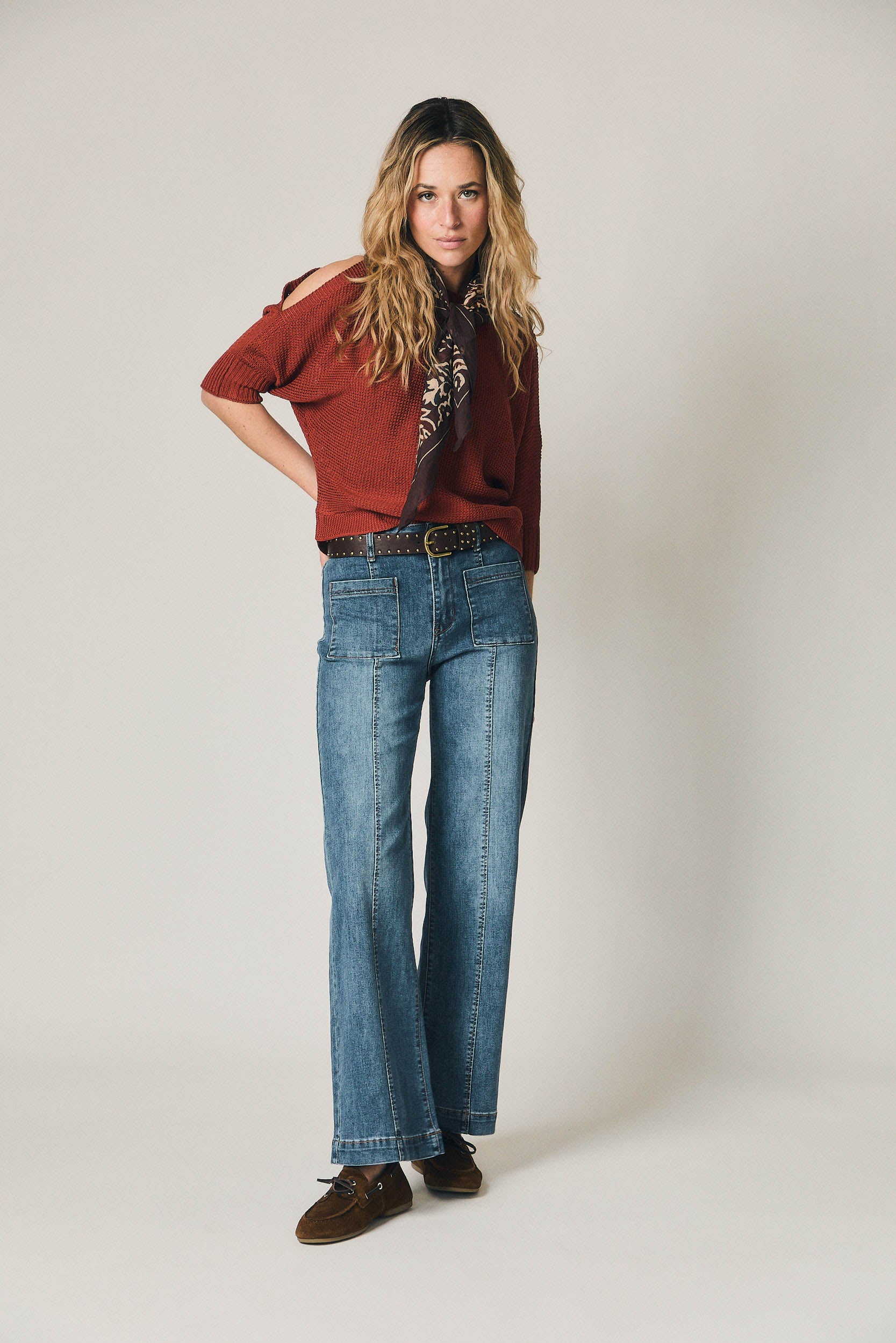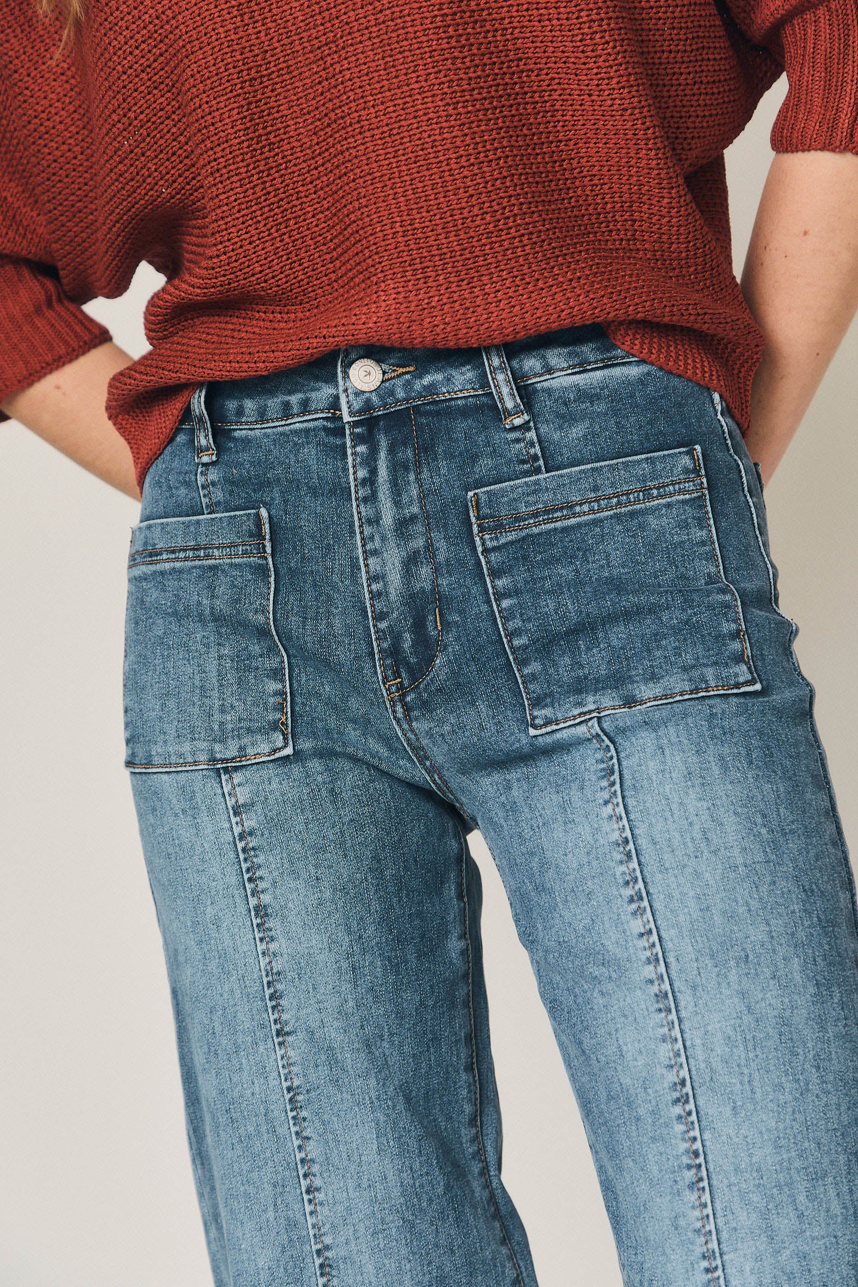 Jeans rectos en tono azul denim, con tiro medio y silueta limpia. Destacan las costuras marcadas a lo largo de la pernera, que aportan estructura y un punto diferencial al diseño. Presentan bolsillos delanteros de parche, cierre frontal con botón y cremallera y pernera recta hasta el bajo.