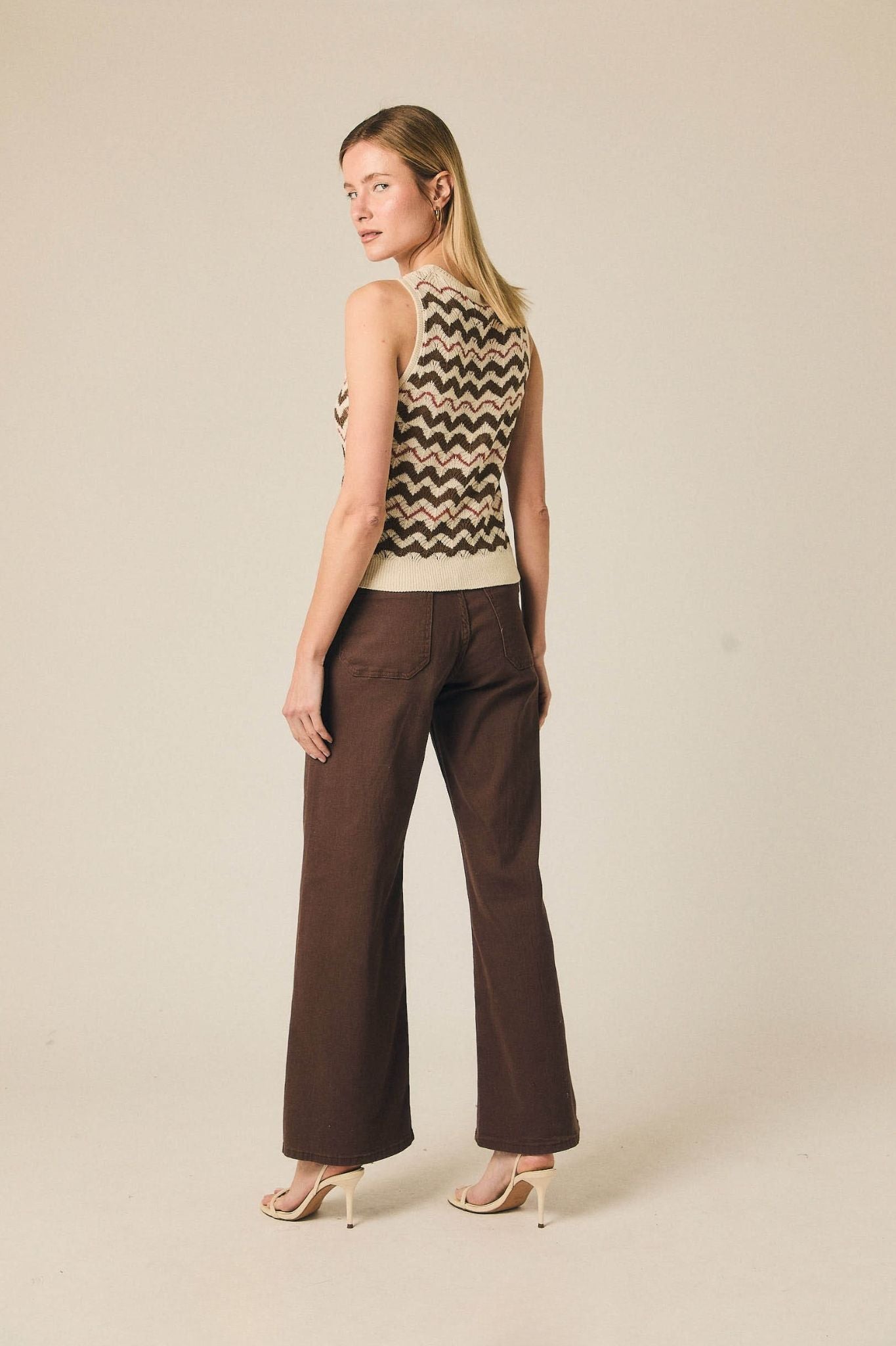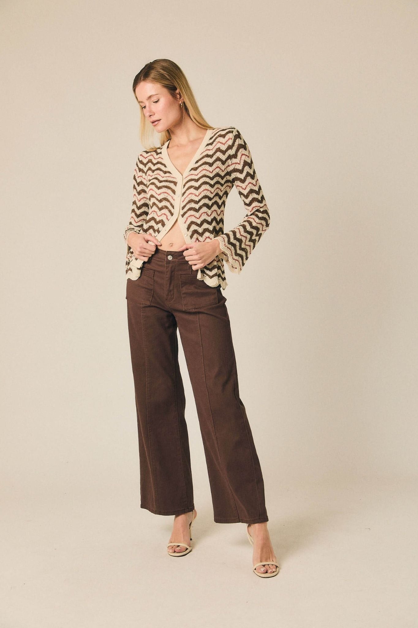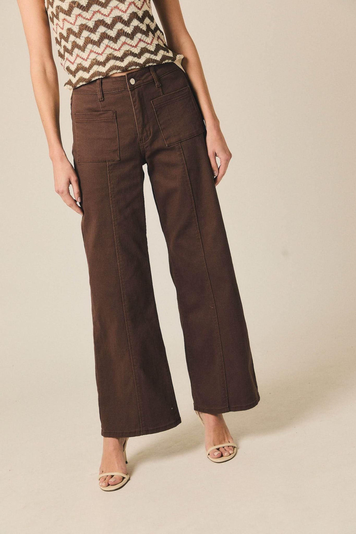 - Jeans rectos castanhos com costuras visíveis