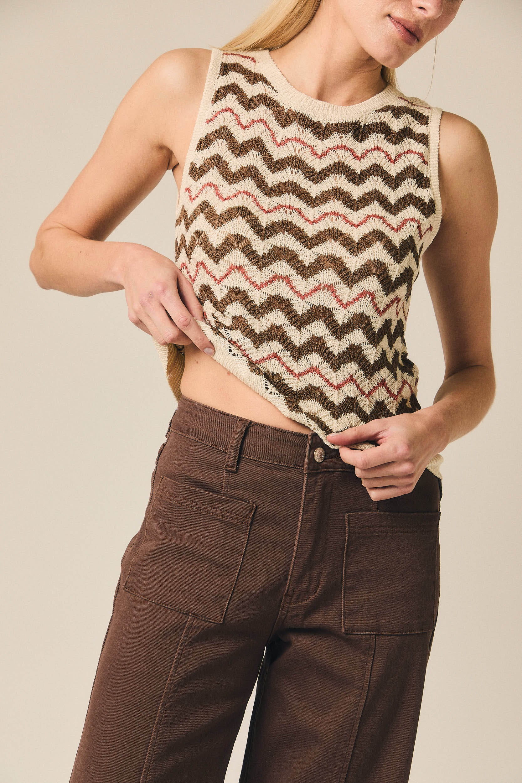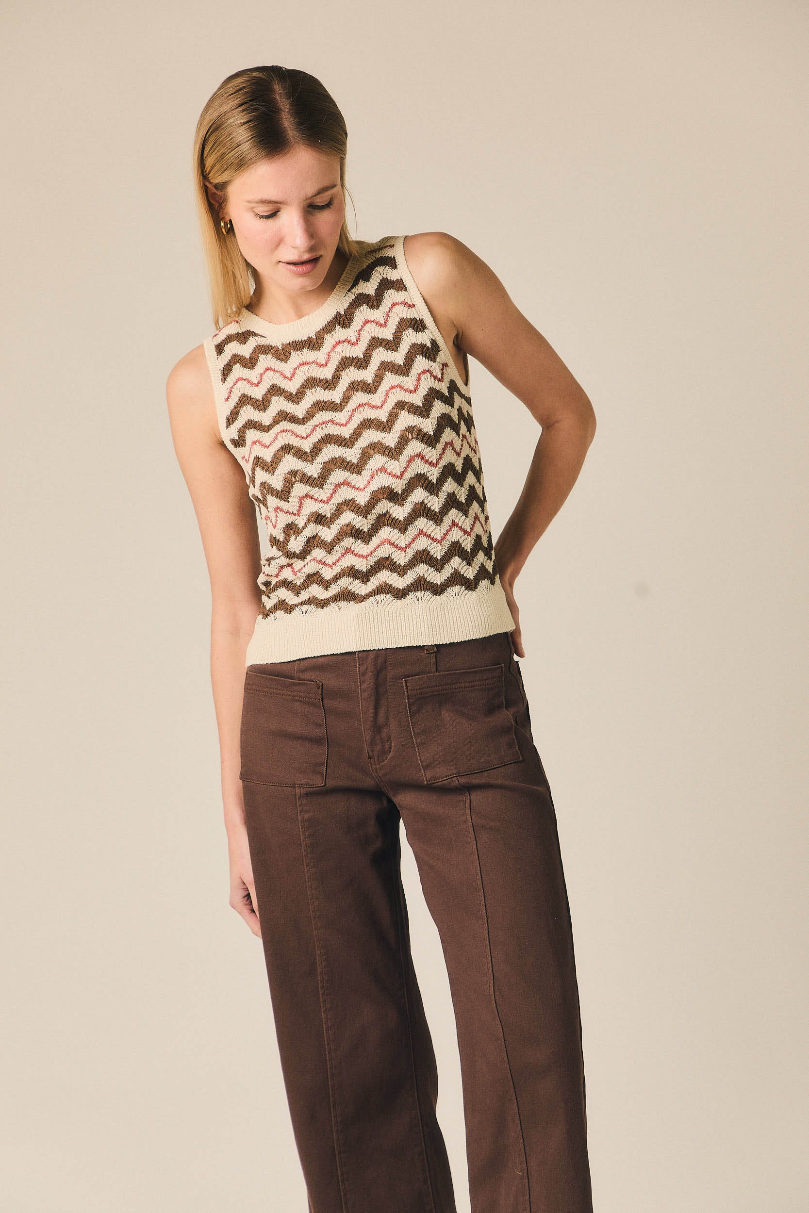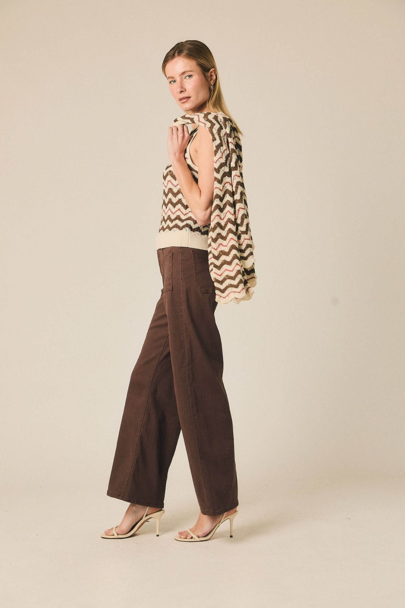 - Jeans rectos castanhos com costuras visíveis
