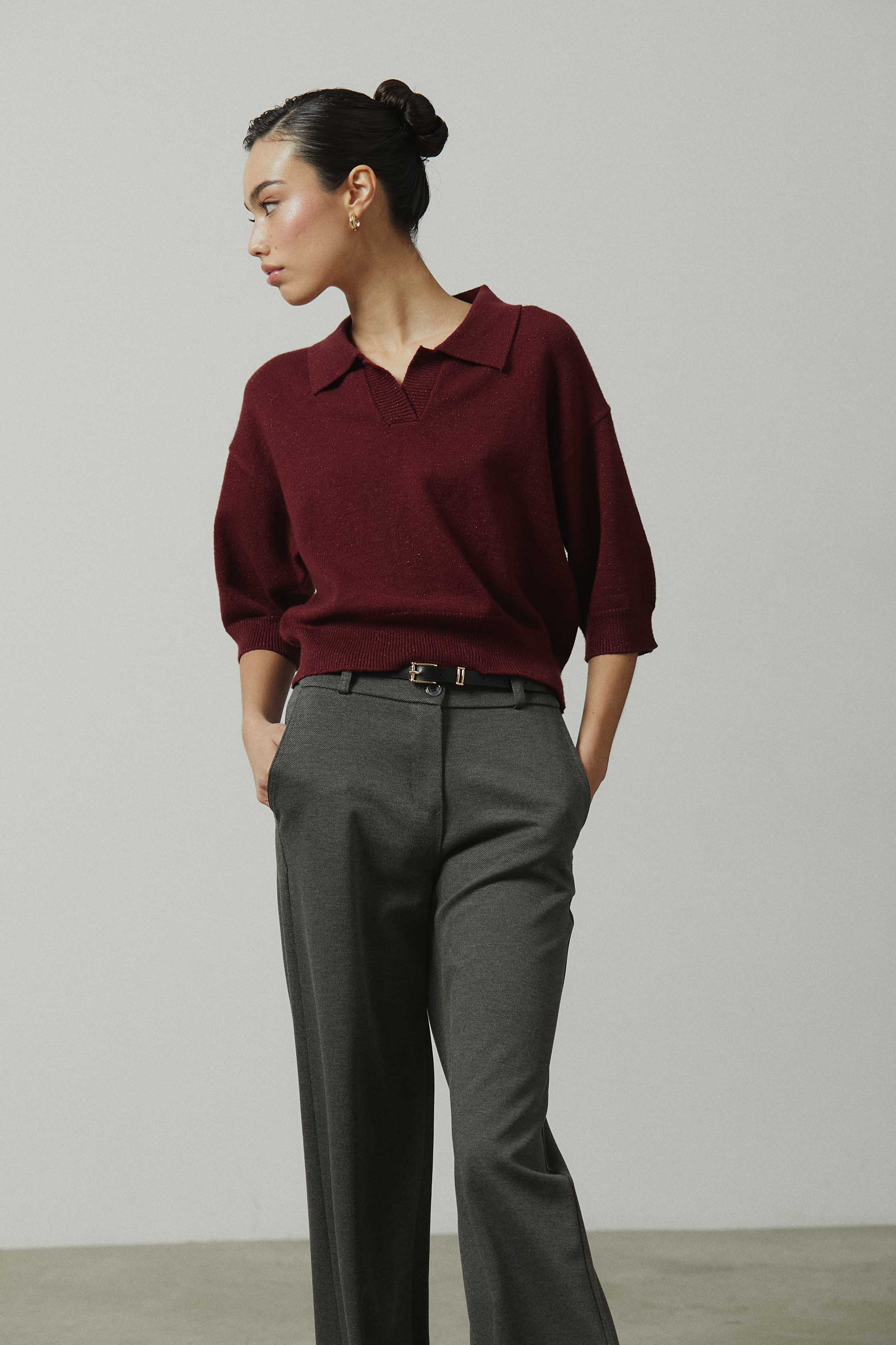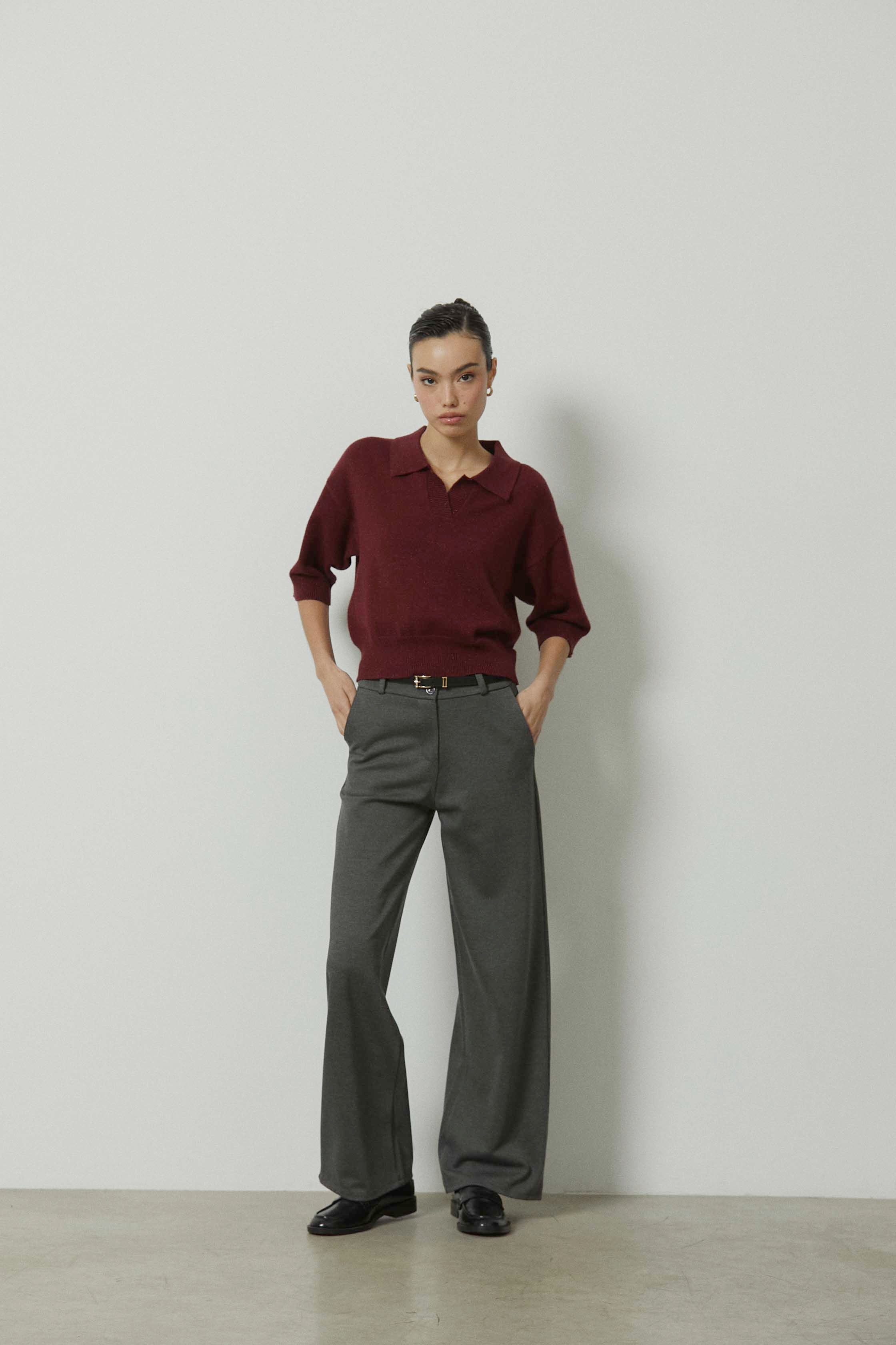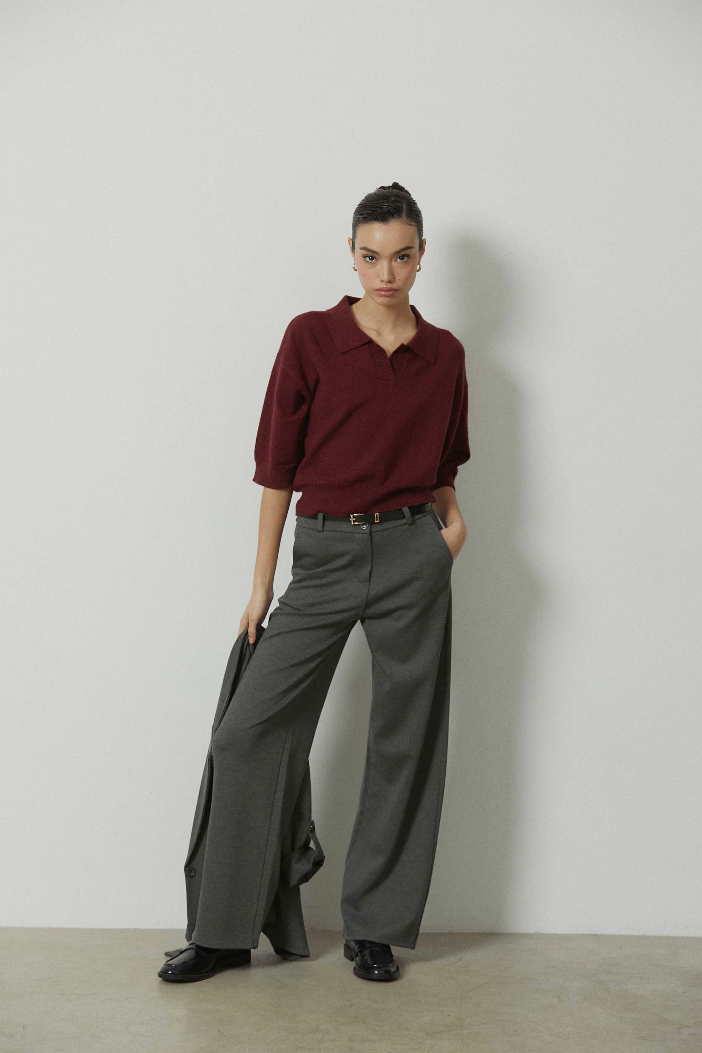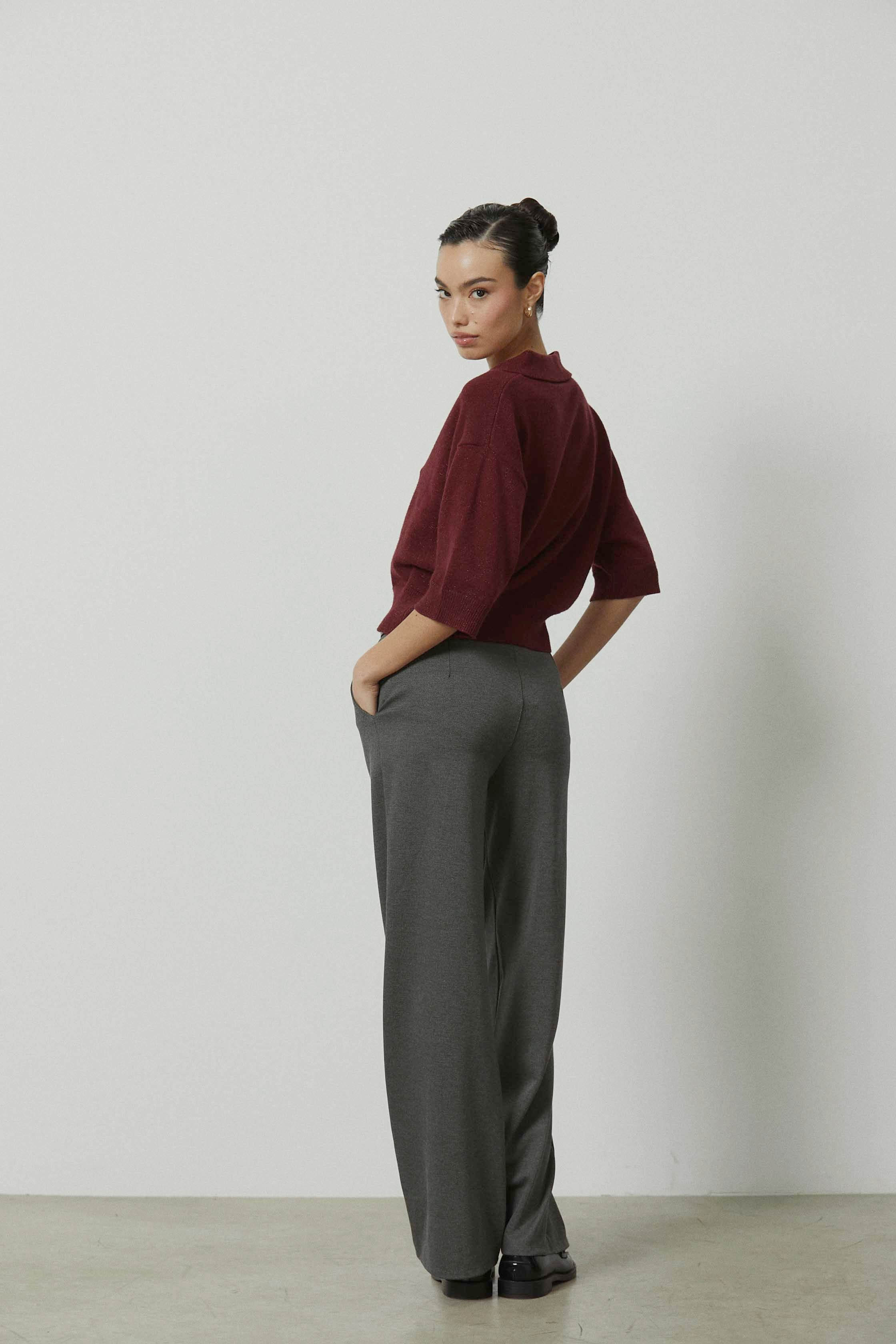 Pantalón sastre en color gris con raya marcada y corte ancho. Diseño de tiro medio y pierna recta y amplia que aporta estructura y comodidad. Una prenda pensada para looks de diario más cuidados y para el entretiempo.