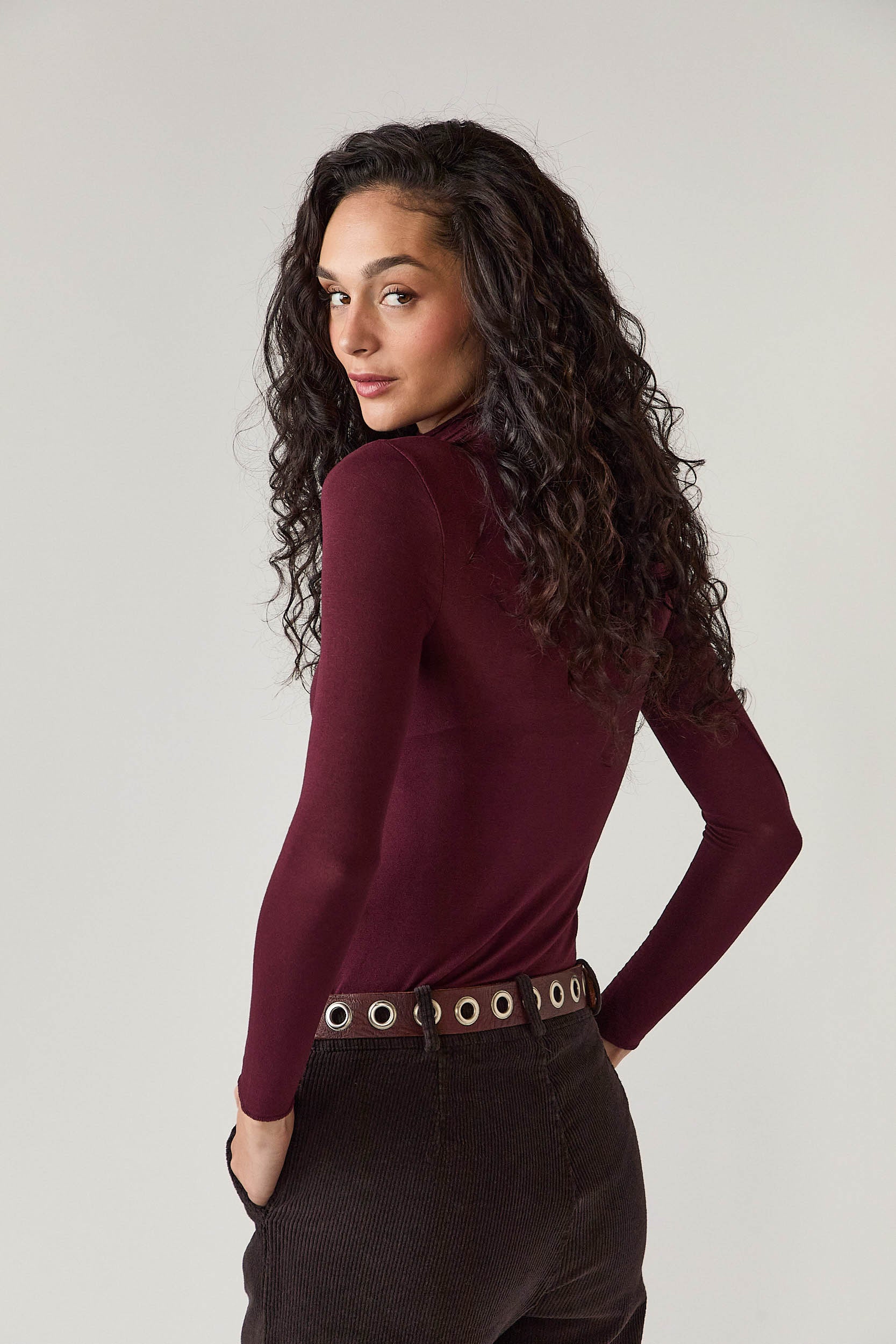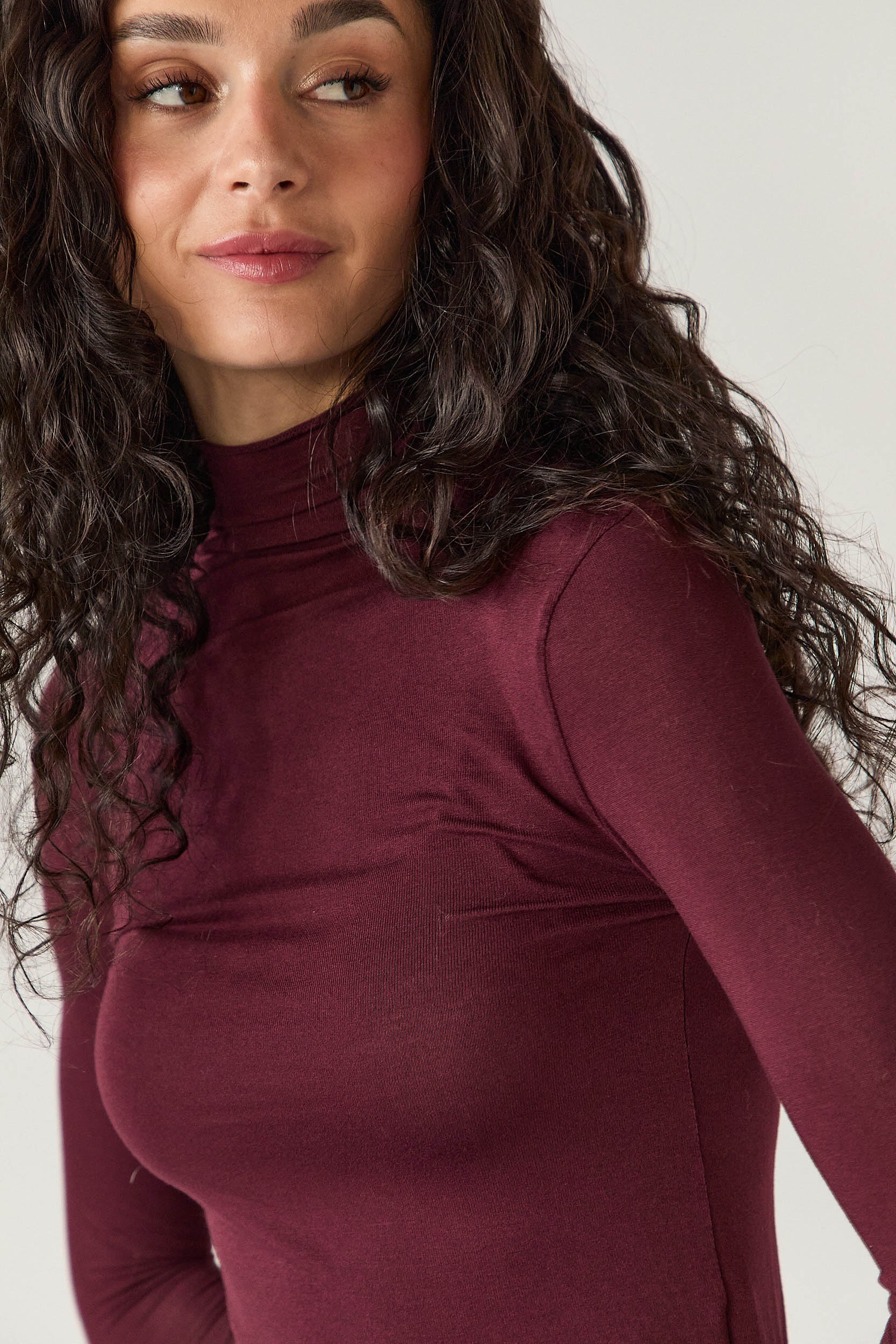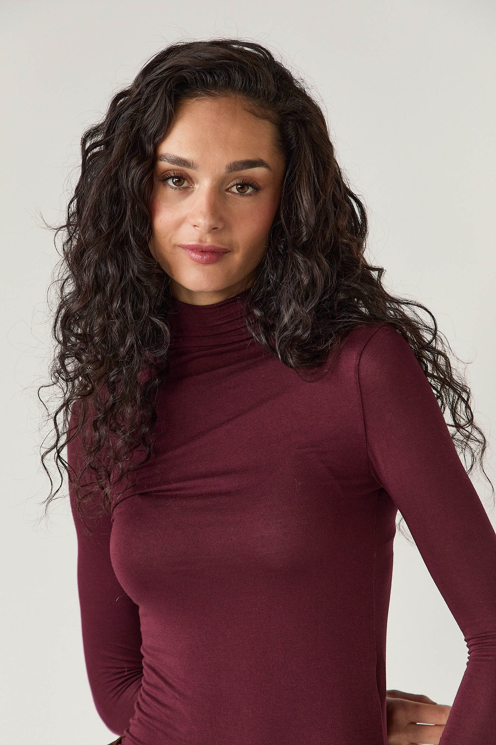 A t-shirt gola alta vinho é uma peça de manga comprida com corte justo e tecido fino e elástico que acompanha a silhueta com suavidade. O pescoço subido ajustado envolve o colo de forma confortável, enquanto o ligeiro franzido lateral ajuda a disfarçar pequenas zonas críticas e a criar um efeito visual mais harmonioso.